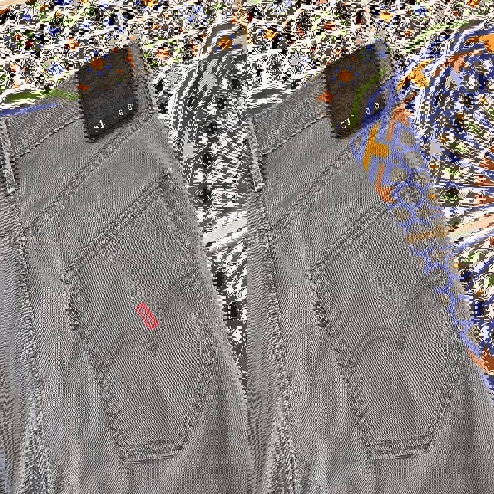 Grey Levi’s shorts with a black patch on the back