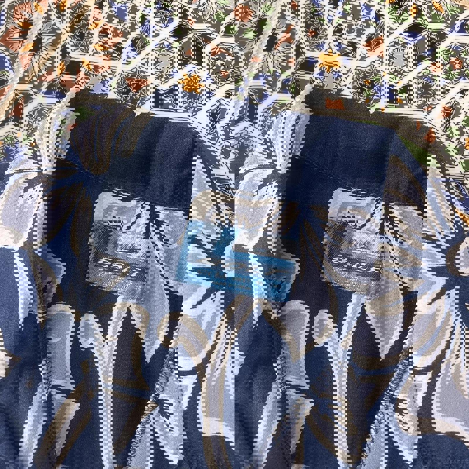 Blue, grey and white Hawaiian lightening bolt short sleeved button up shirt with floral print all over and brown buttons
