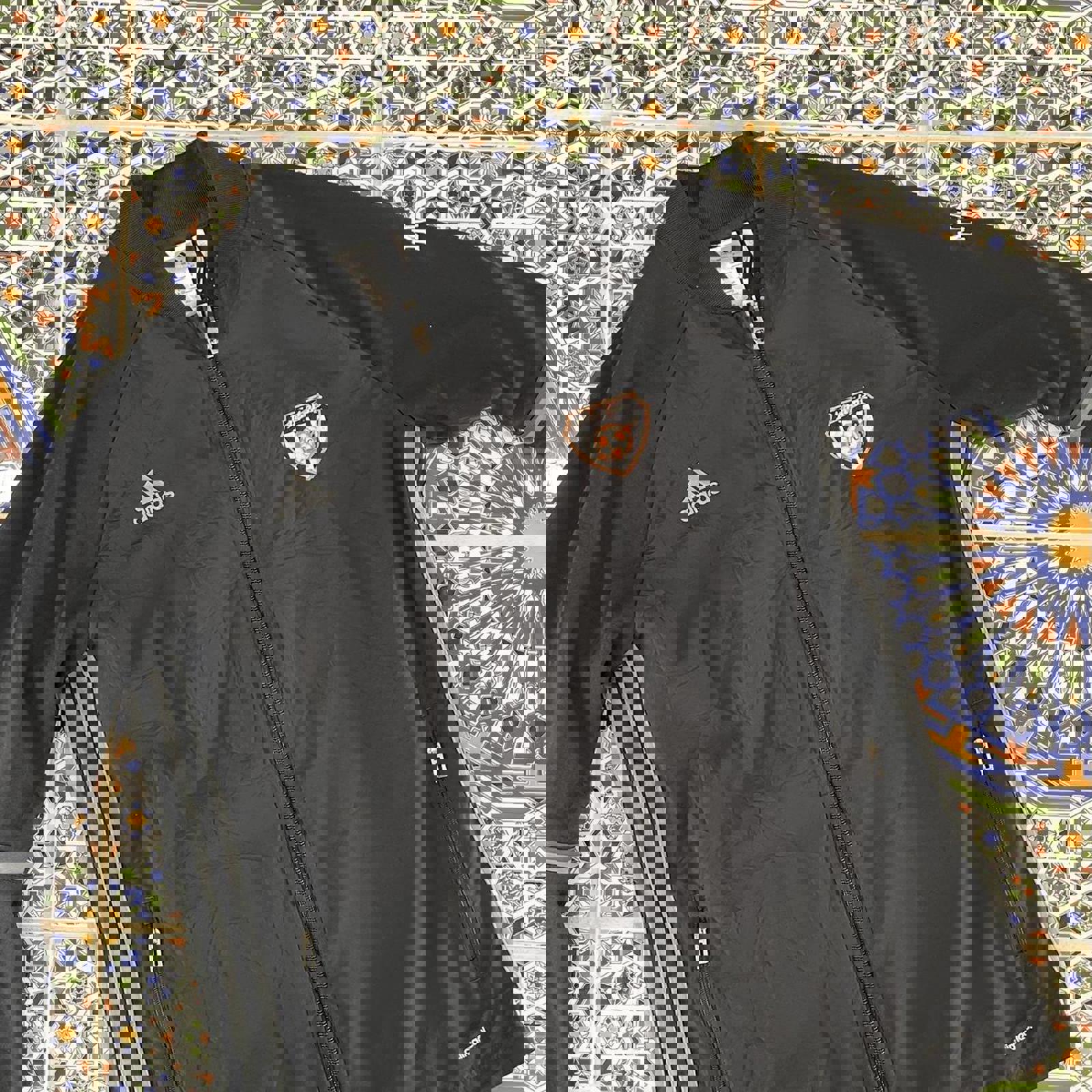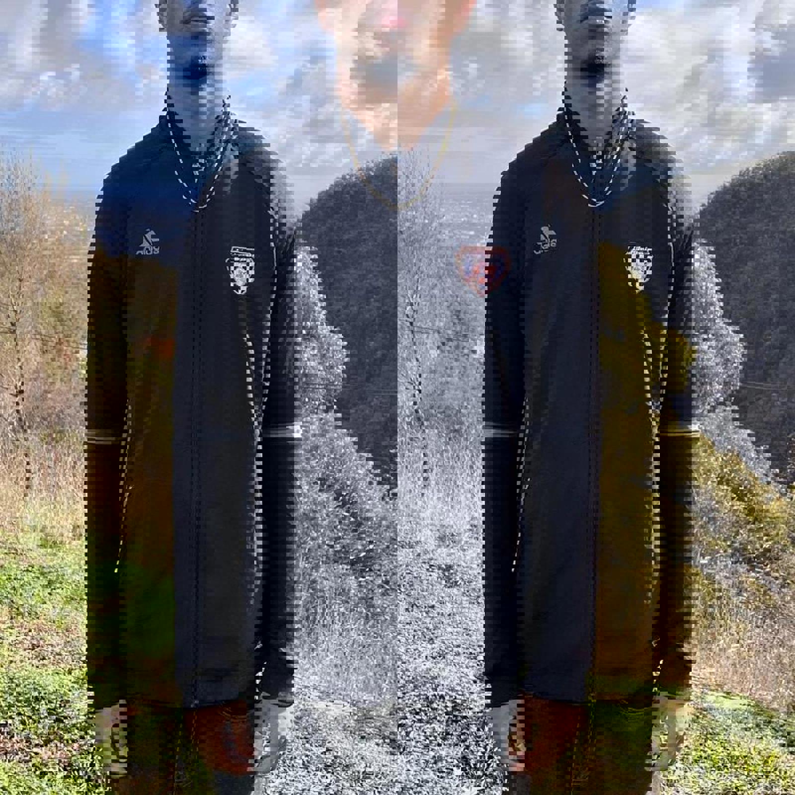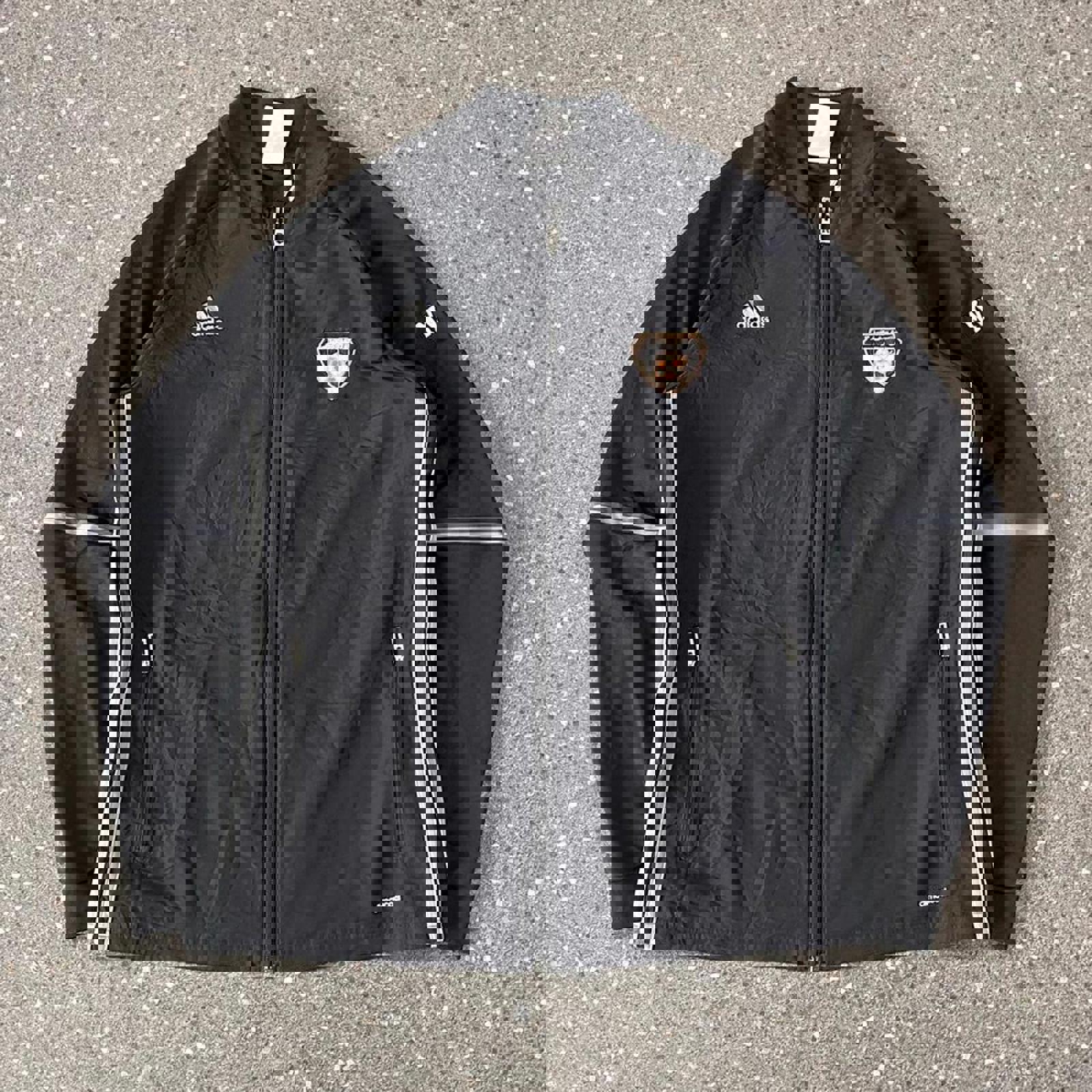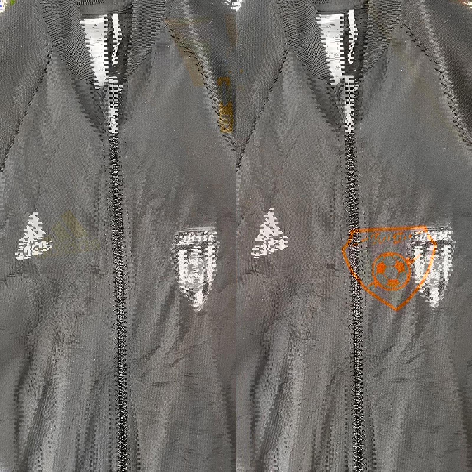 Black adidas jacket with embroidered lightening FC club logo, printed adidas logo, 3 white stripes down the sides and zip-able pockets