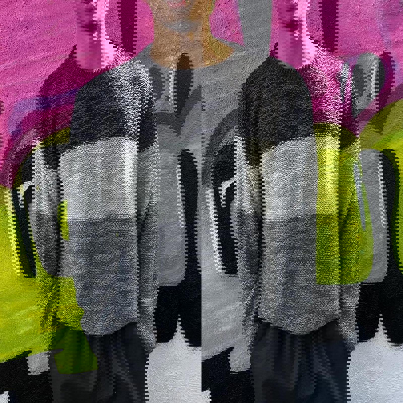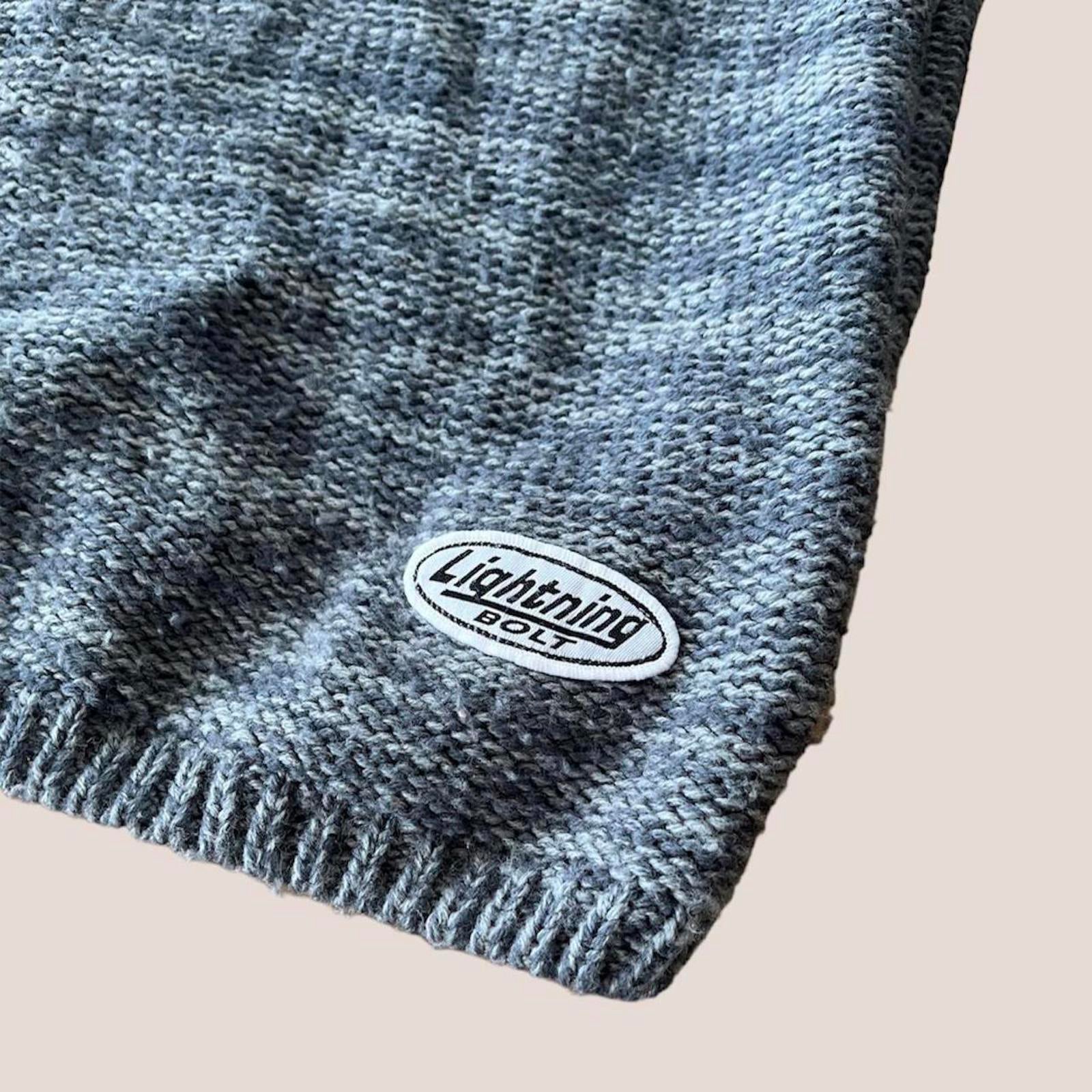 Y2K surf wear knit sweater in black, silver and grey with Lightning bolt oval patch on hip