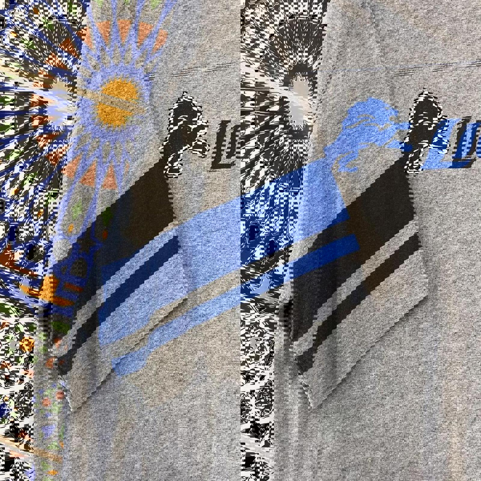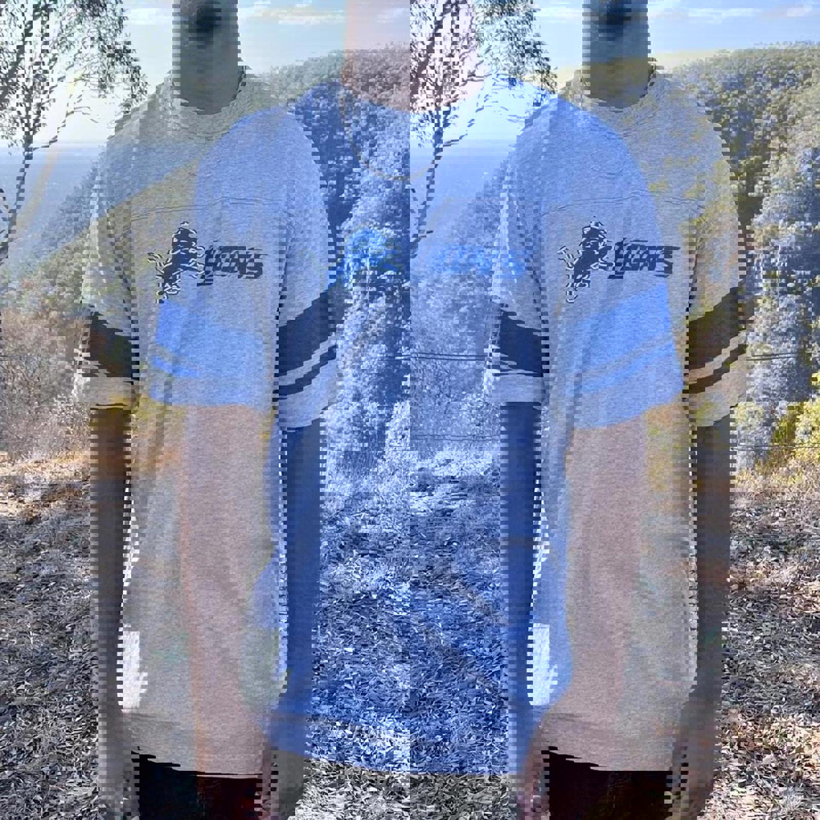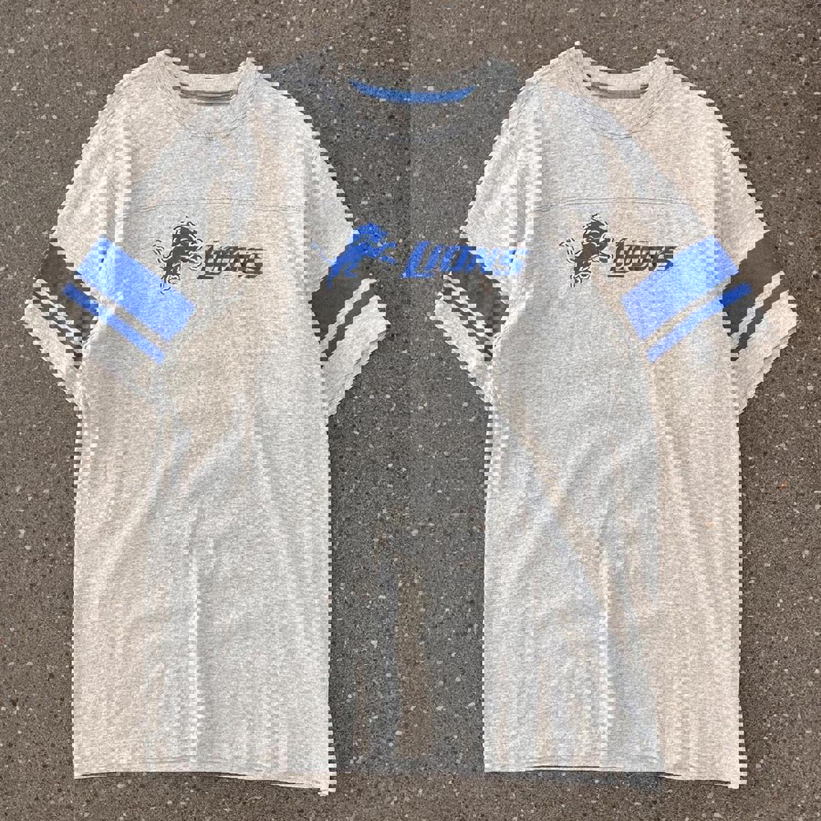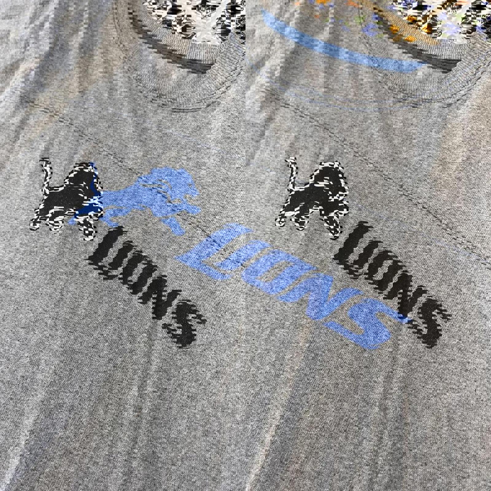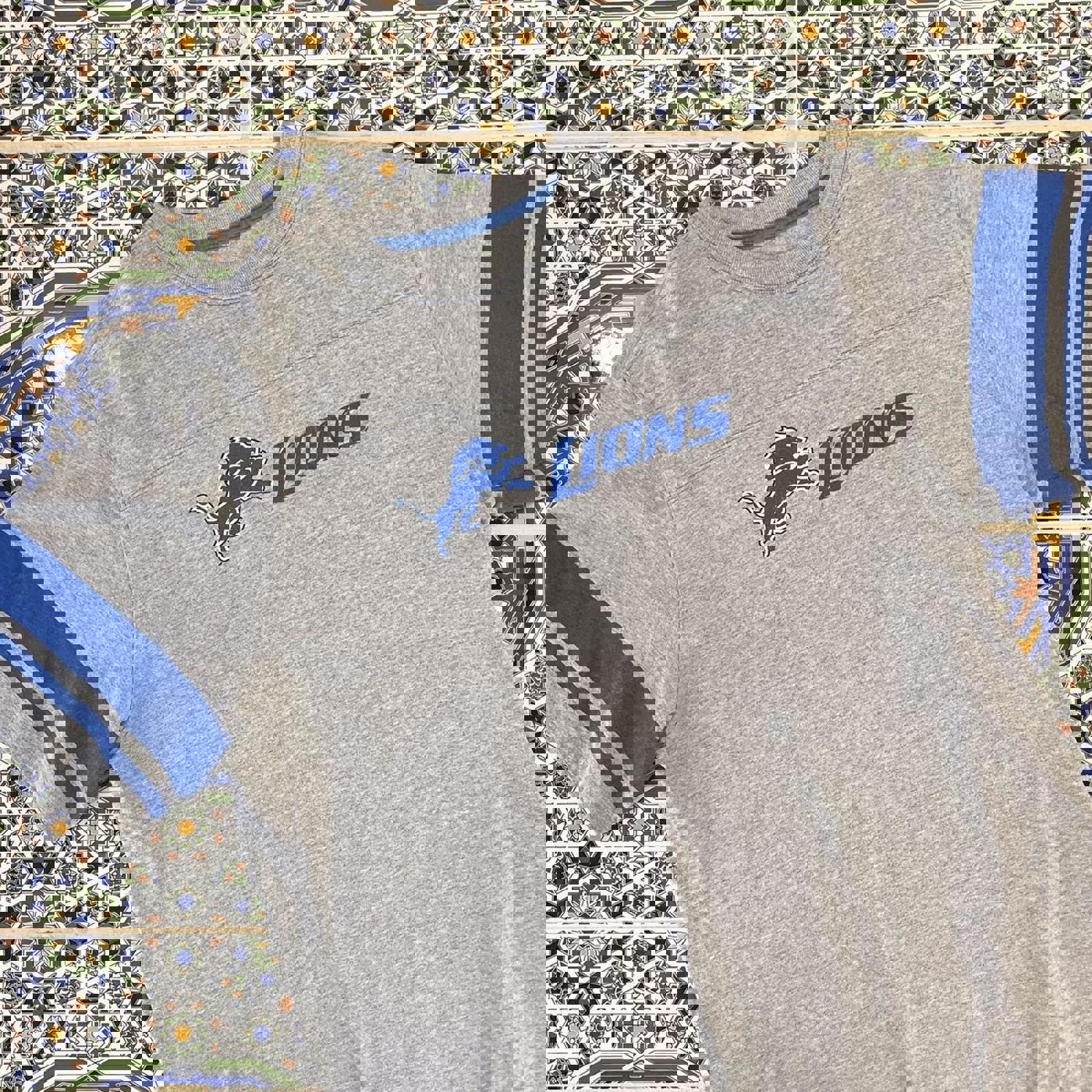 grey nfl tshirt with a centred lions logo and spell out. has blue colour blocking around sleeves