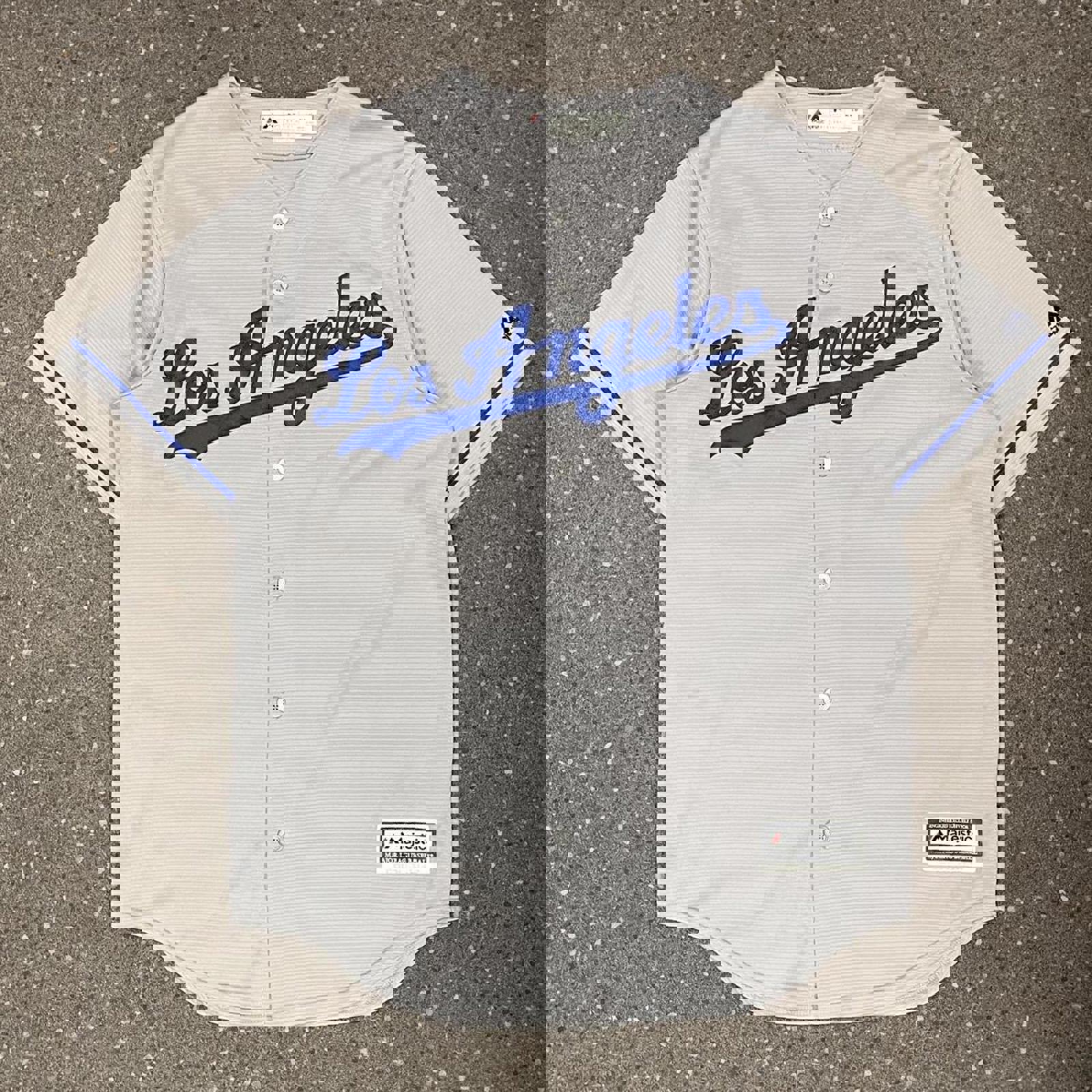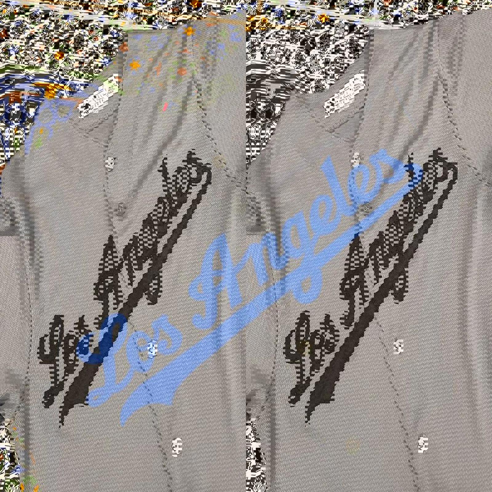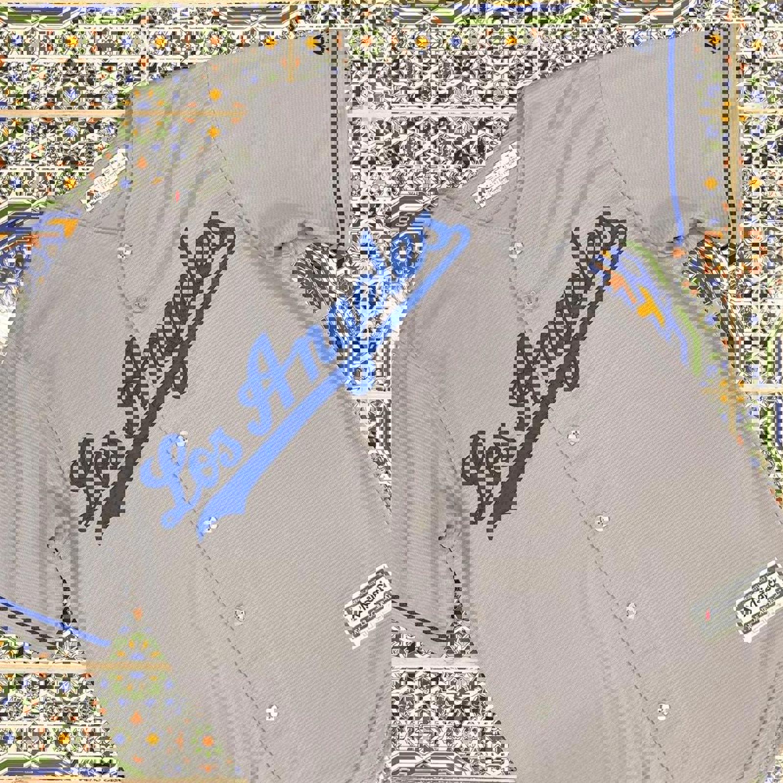 grey majestic los angeles dodgers MLB jersey with a blue los angeles spell out on the chest