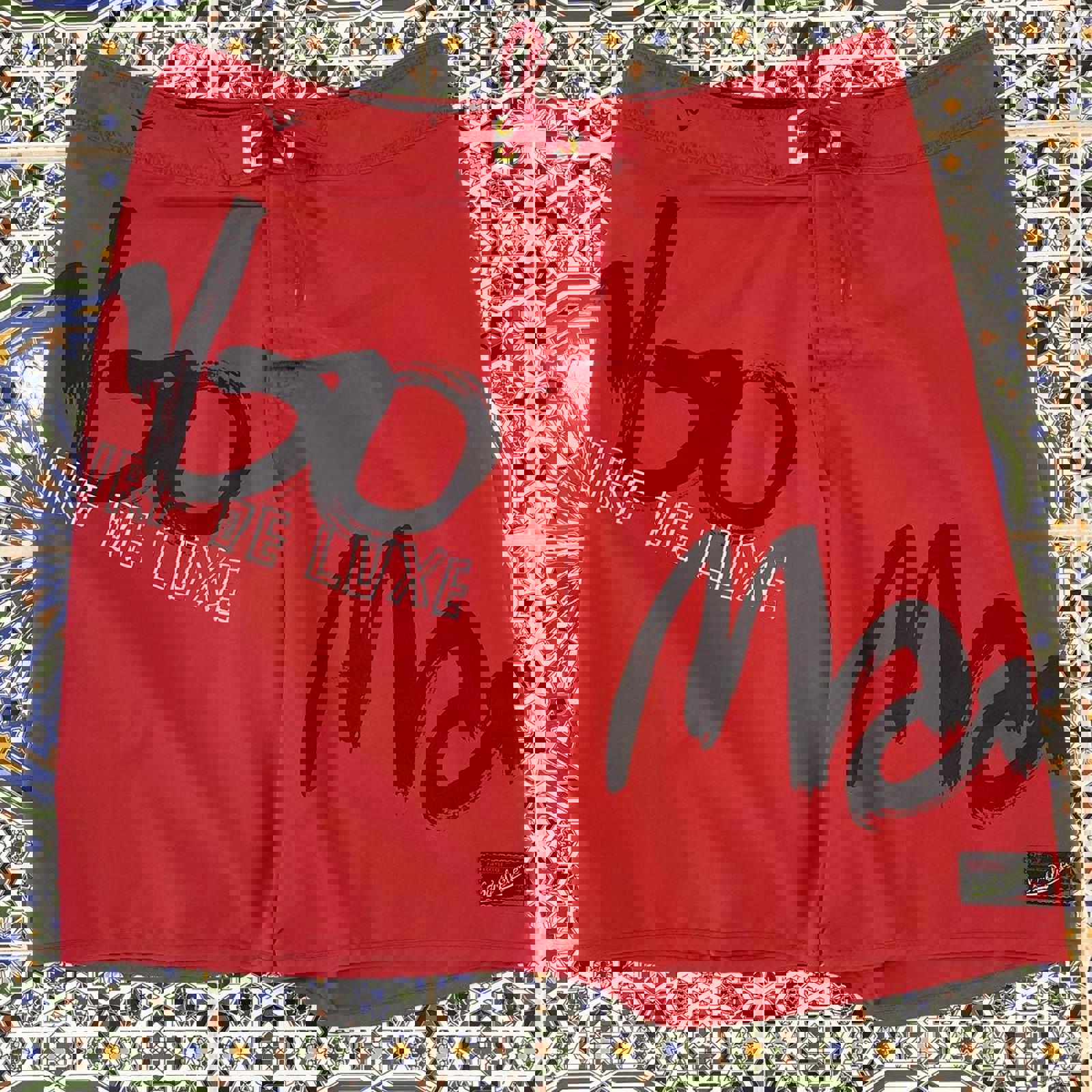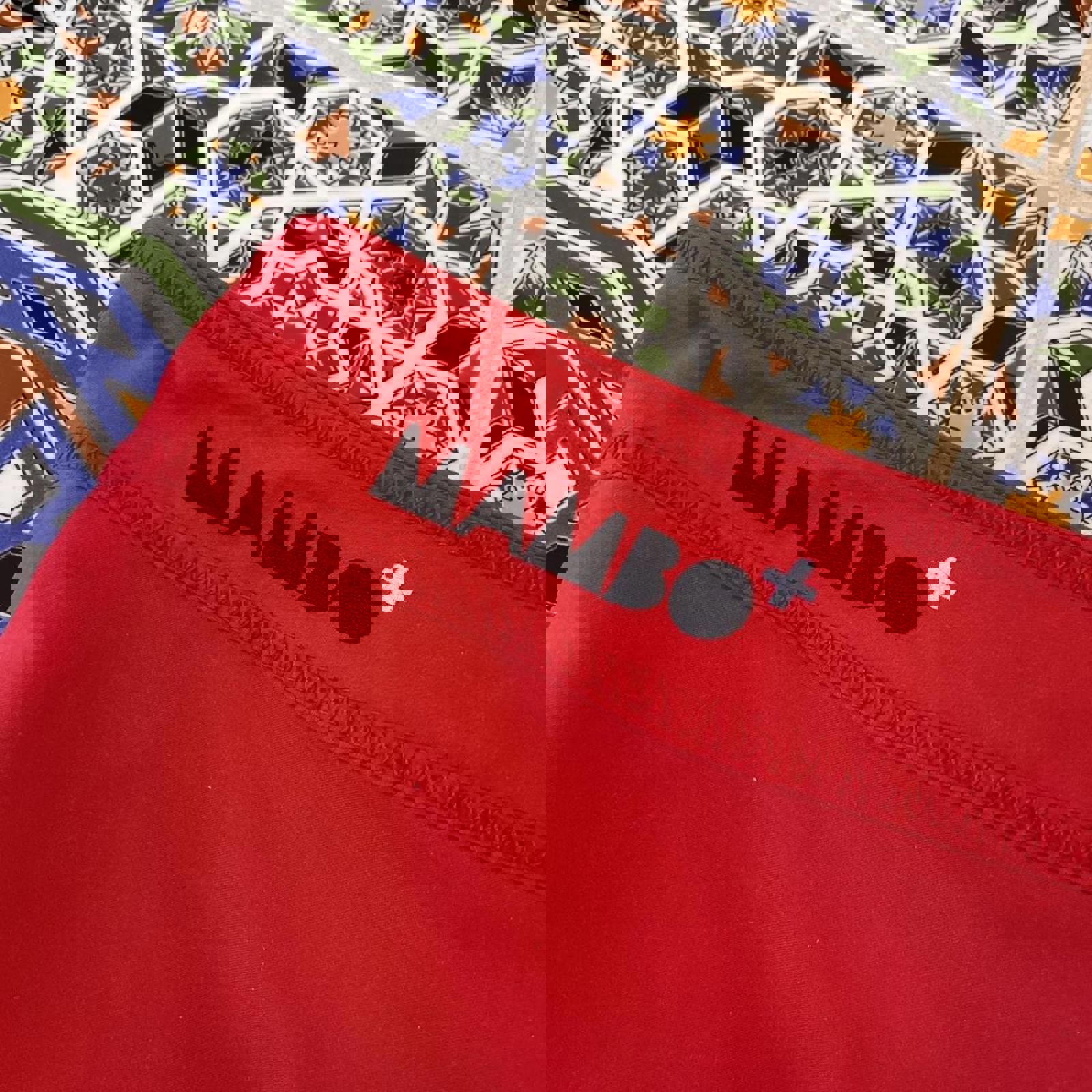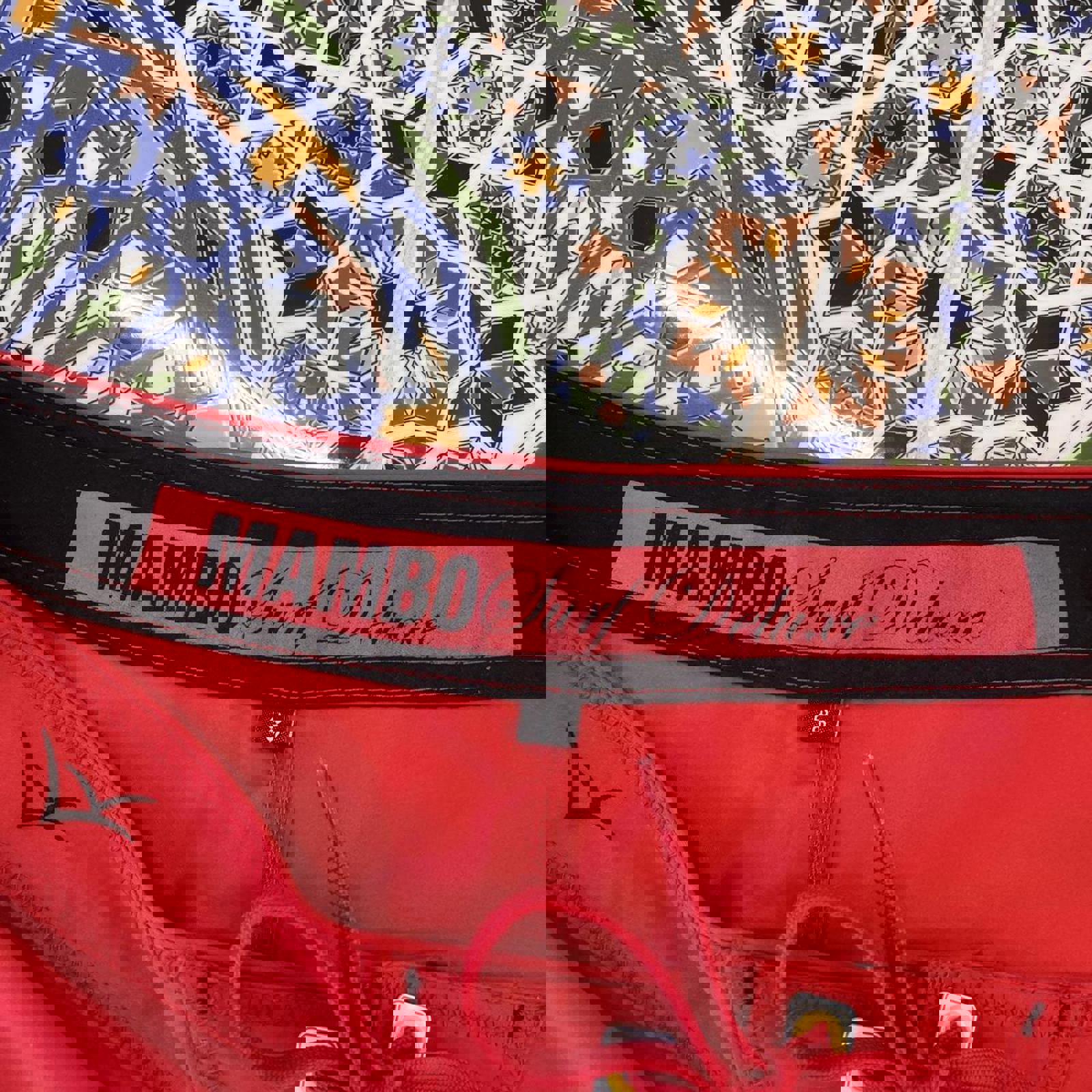 red, black and white mambo swimmers with 2 large mambo spellout graphics, an embroidered mamdo spell out on the hip and a farting dog tab on the back pocket