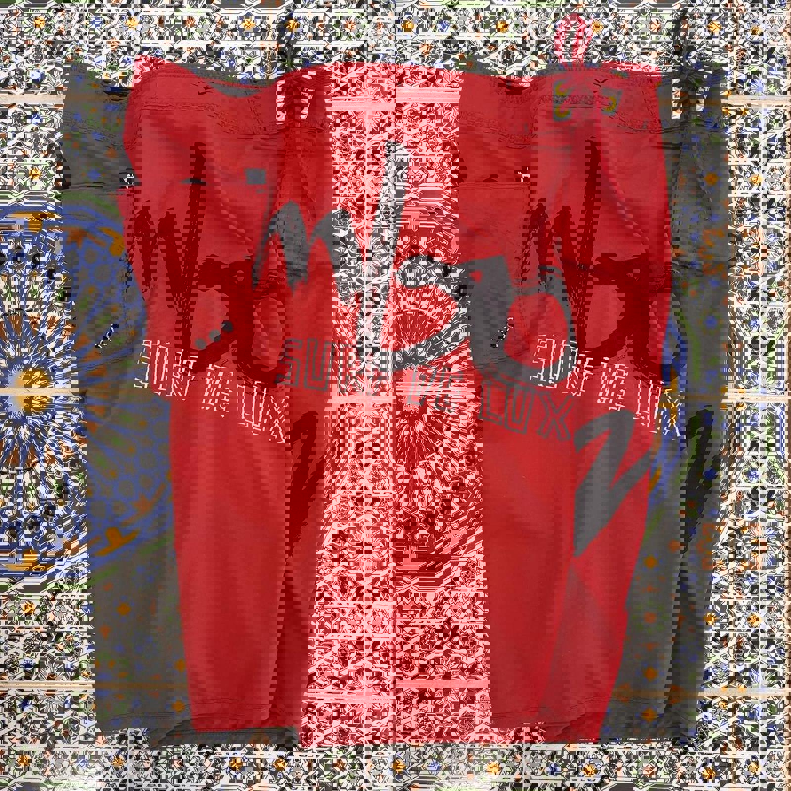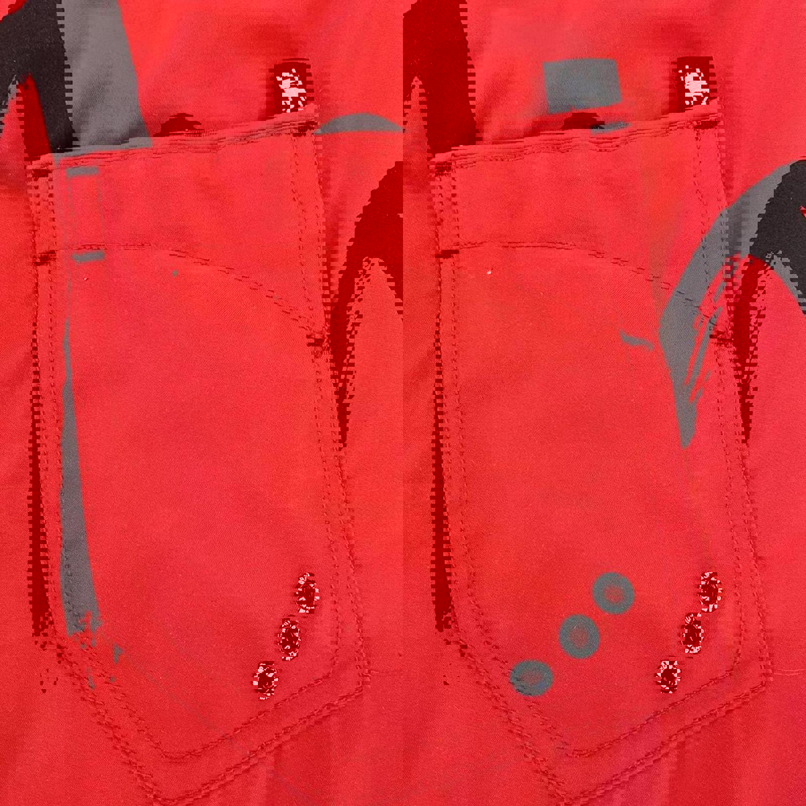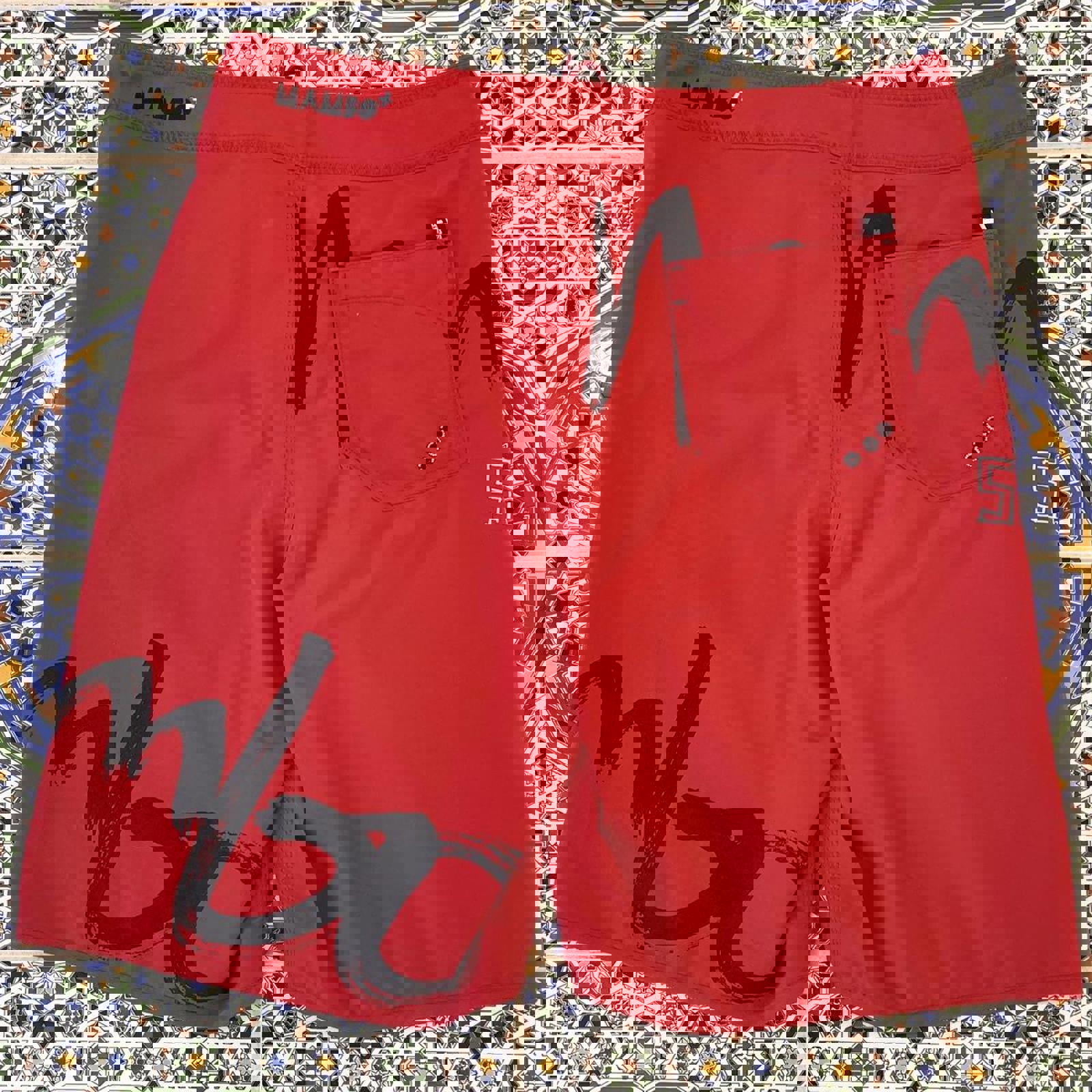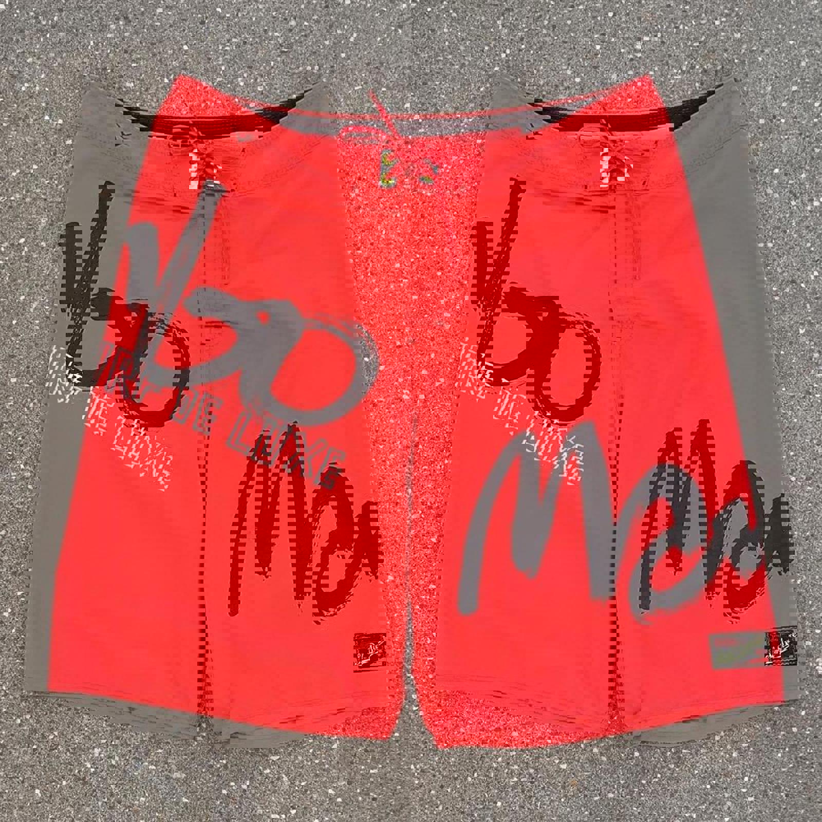 red, black and white mambo swimmers with 2 large mambo spellout graphics, an embroidered mamdo spell out on the hip and a farting dog tab on the back pocket