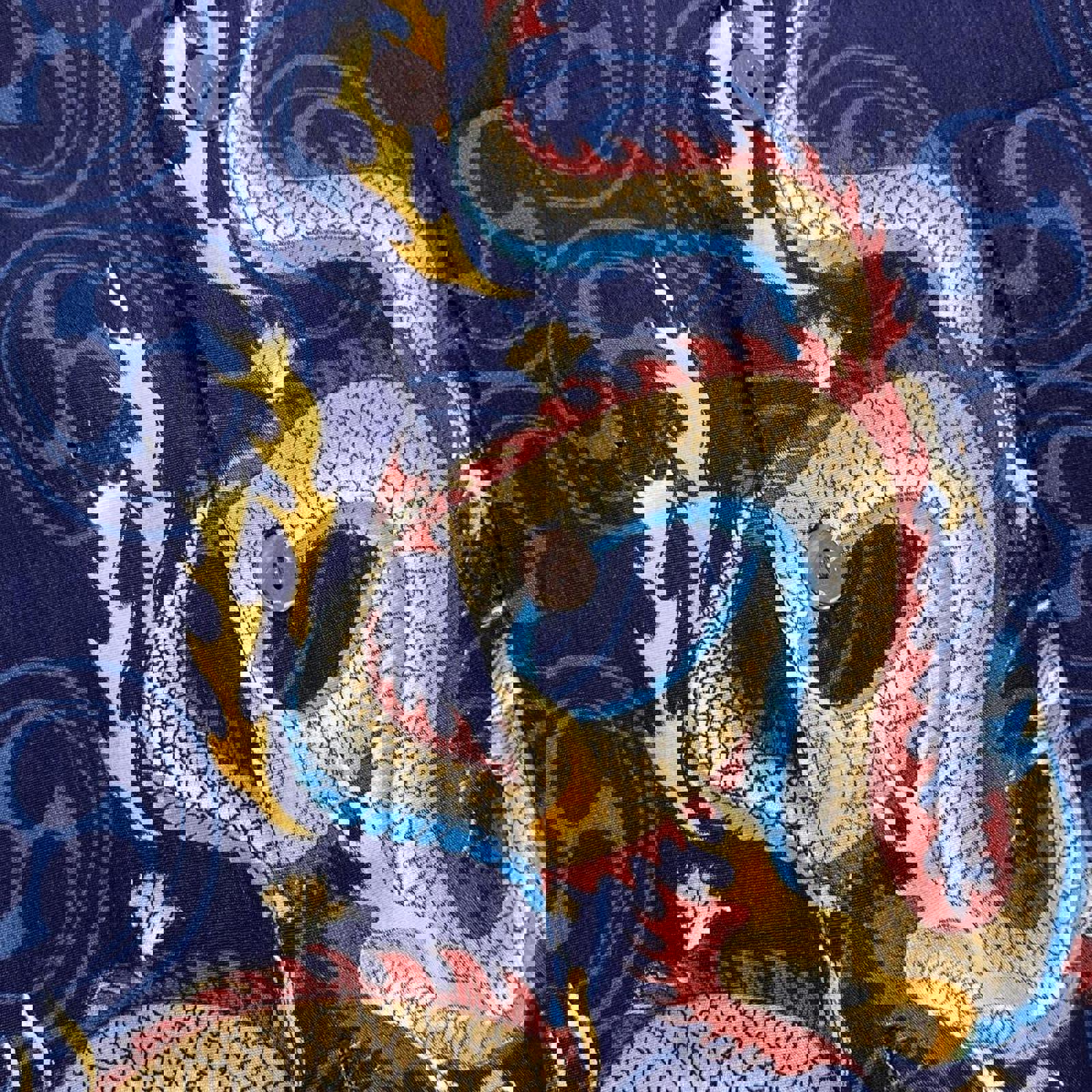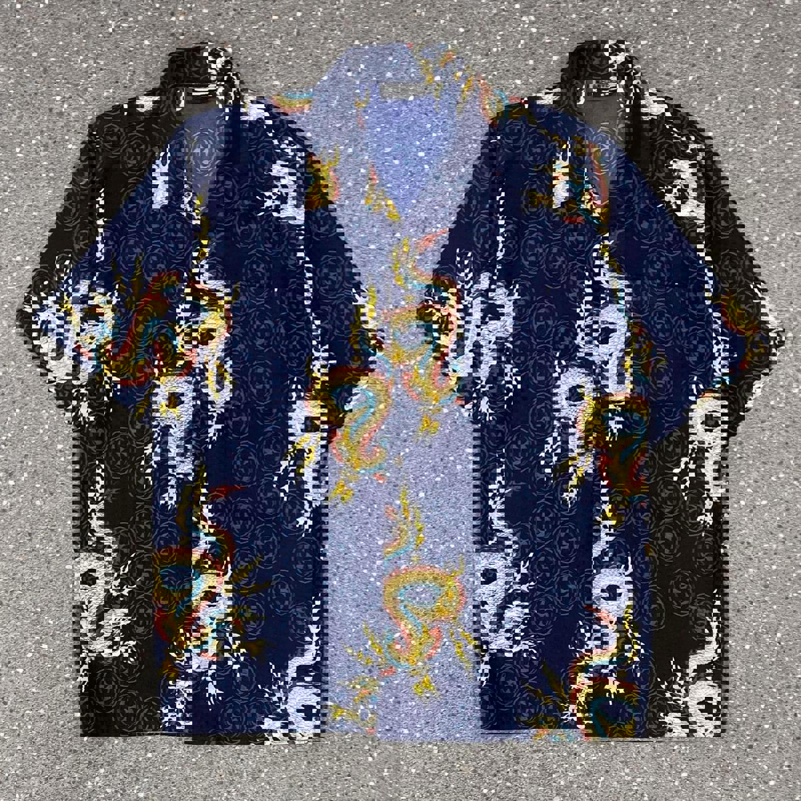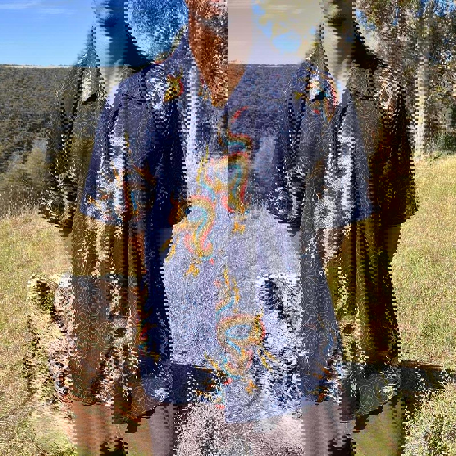 blue, tan, red and yellow maneuvers short sleeved button up shirt with woodern buttons and a dragon all over print