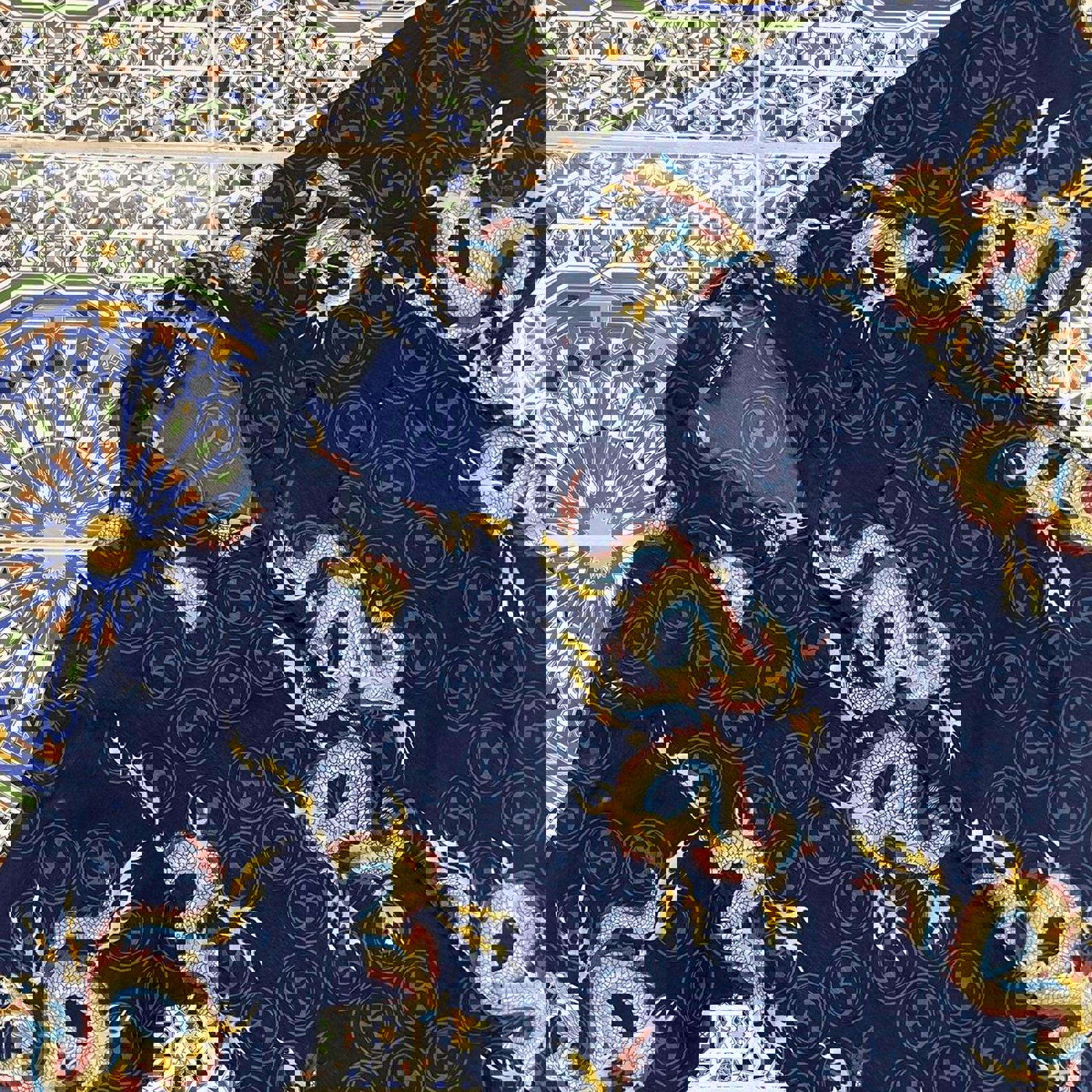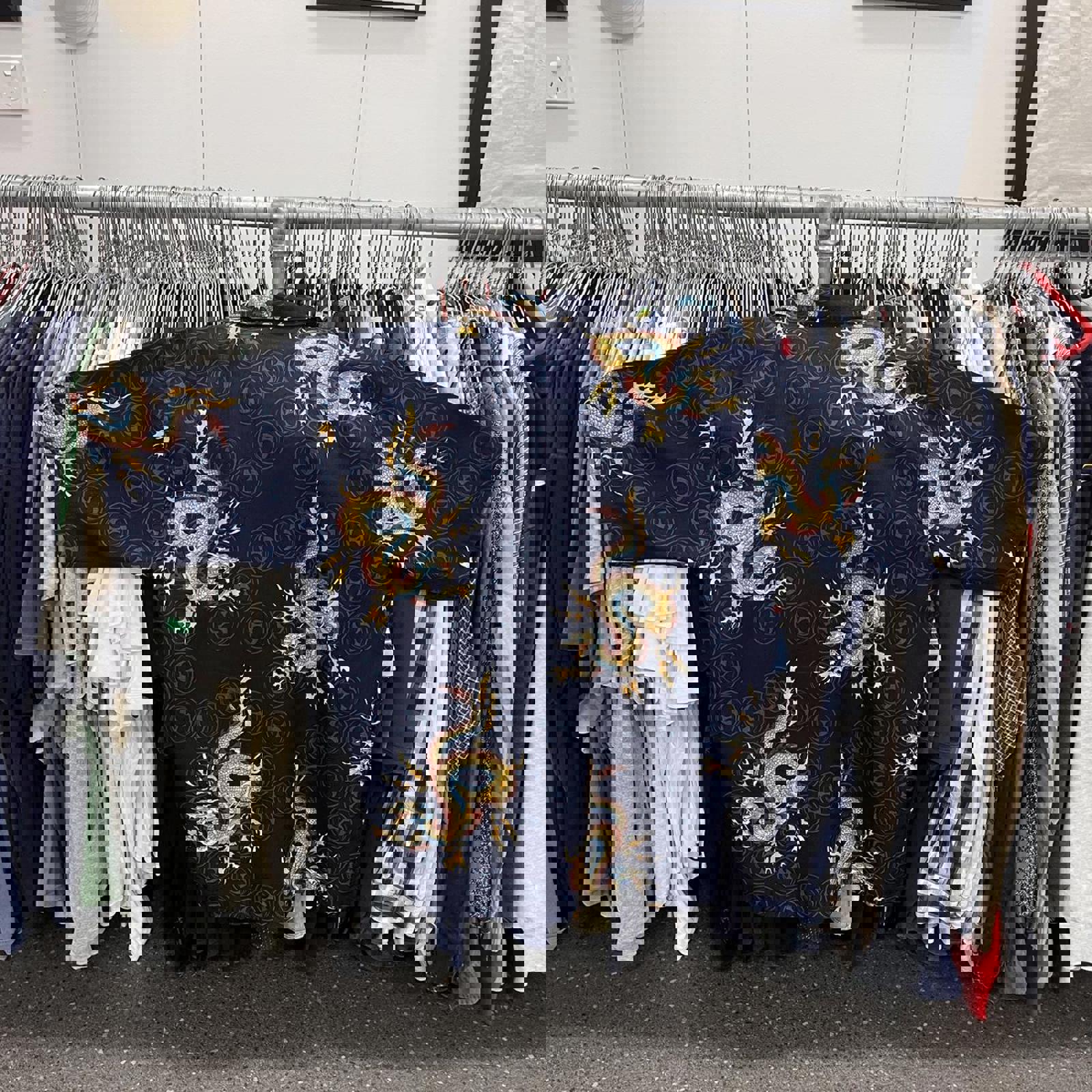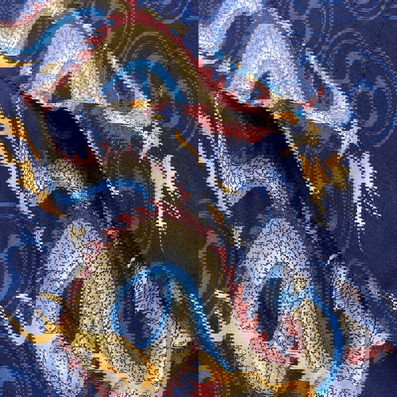 blue, tan, red and yellow maneuvers short sleeved button up shirt with woodern buttons and a dragon all over print