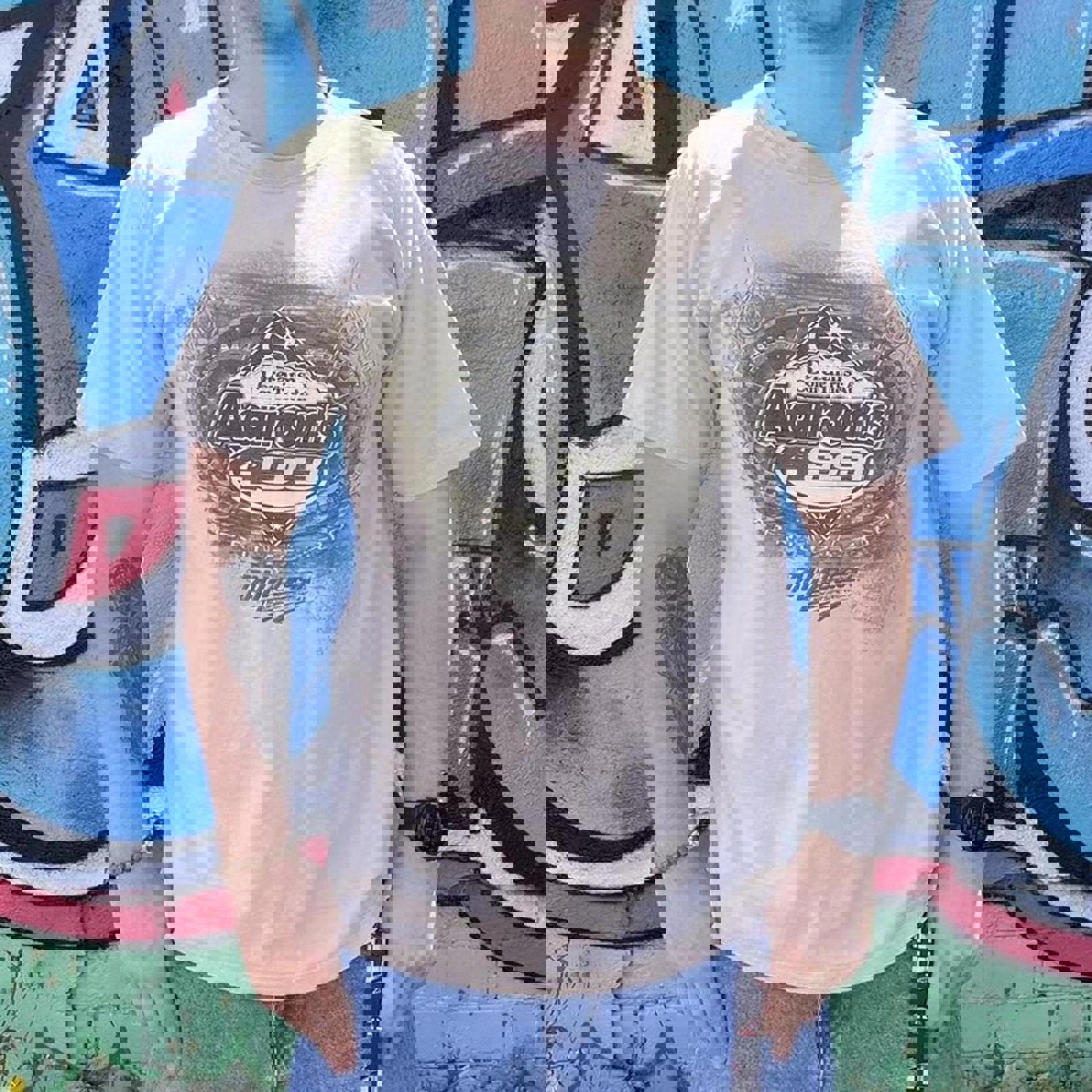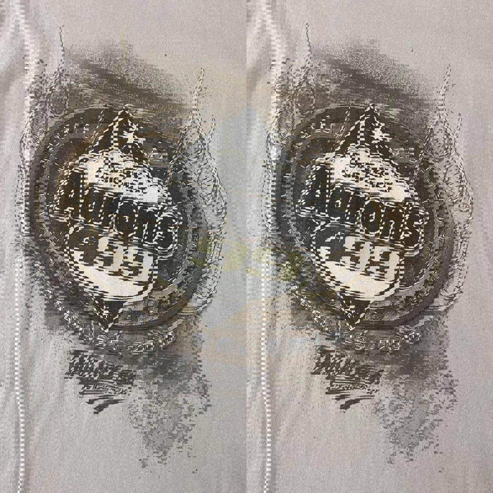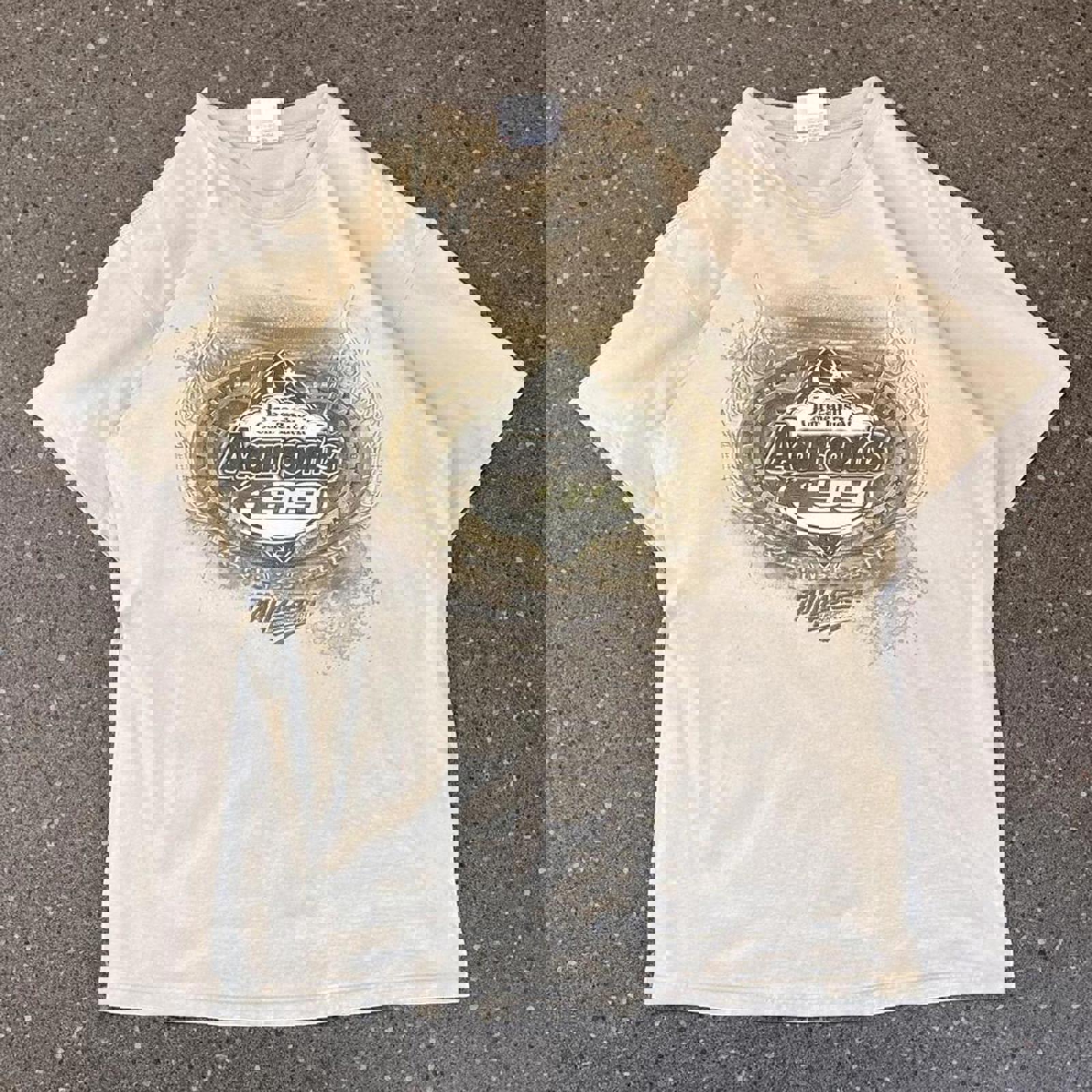 tan nascar tshirt with a dreams come true at aarons graphic on the front and a talladega graphic on the back
