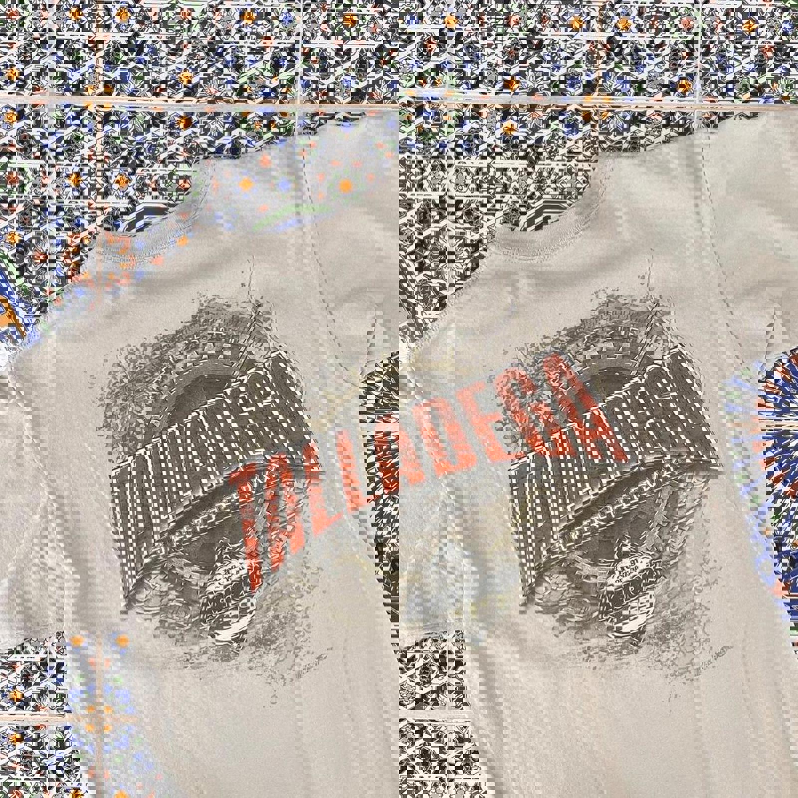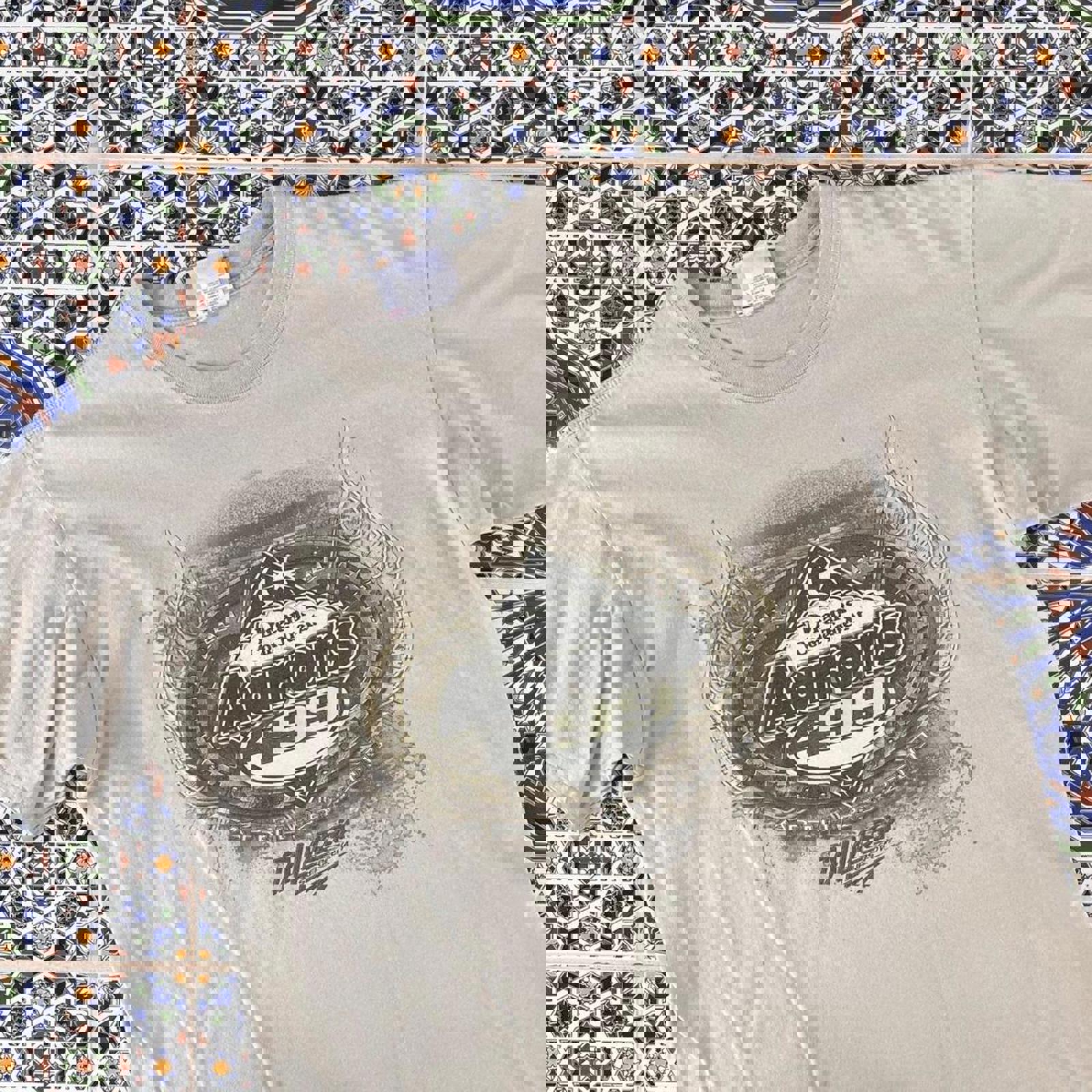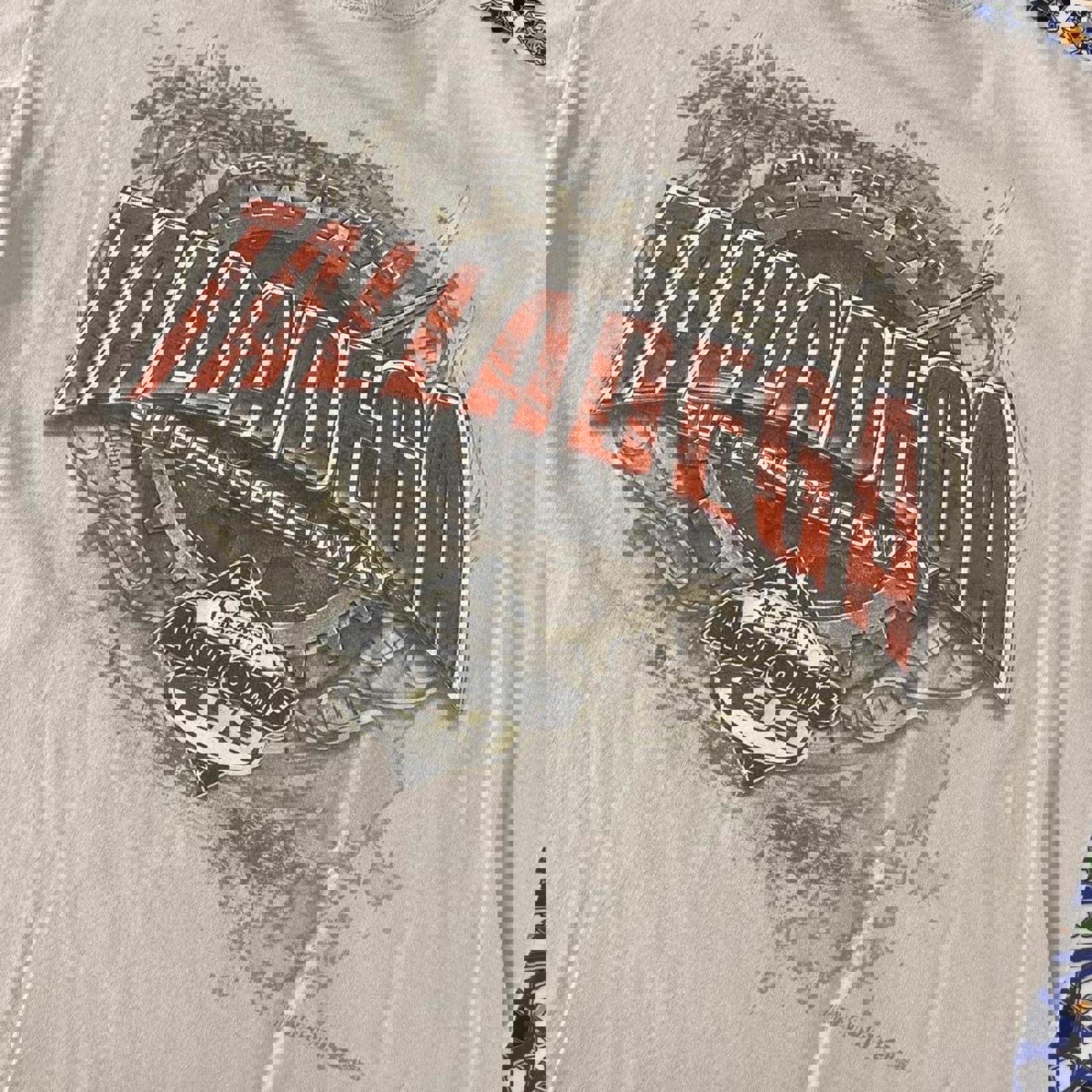 tan nascar tshirt with a dreams come true at aarons graphic on the front and a talladega graphic on the back