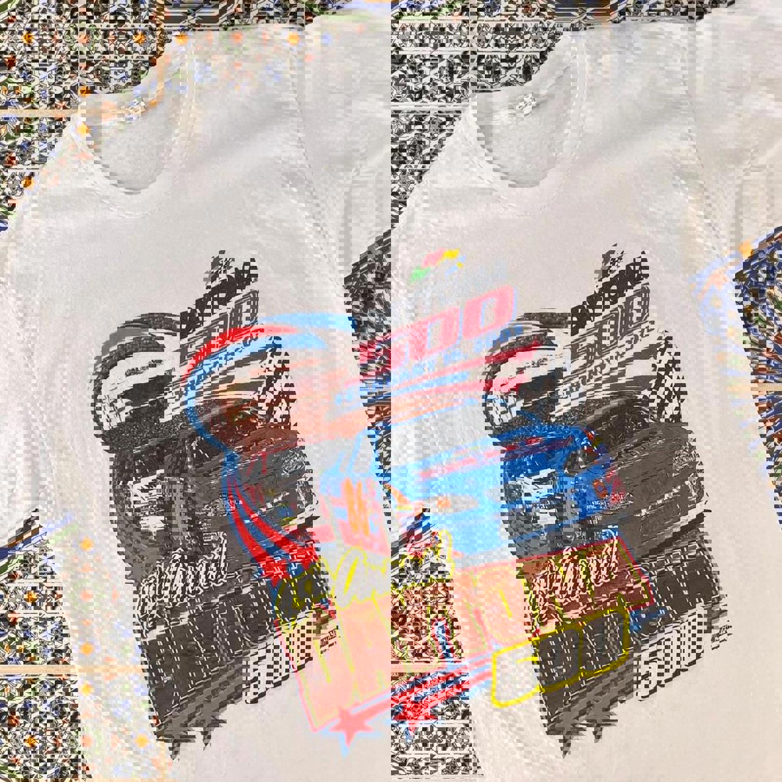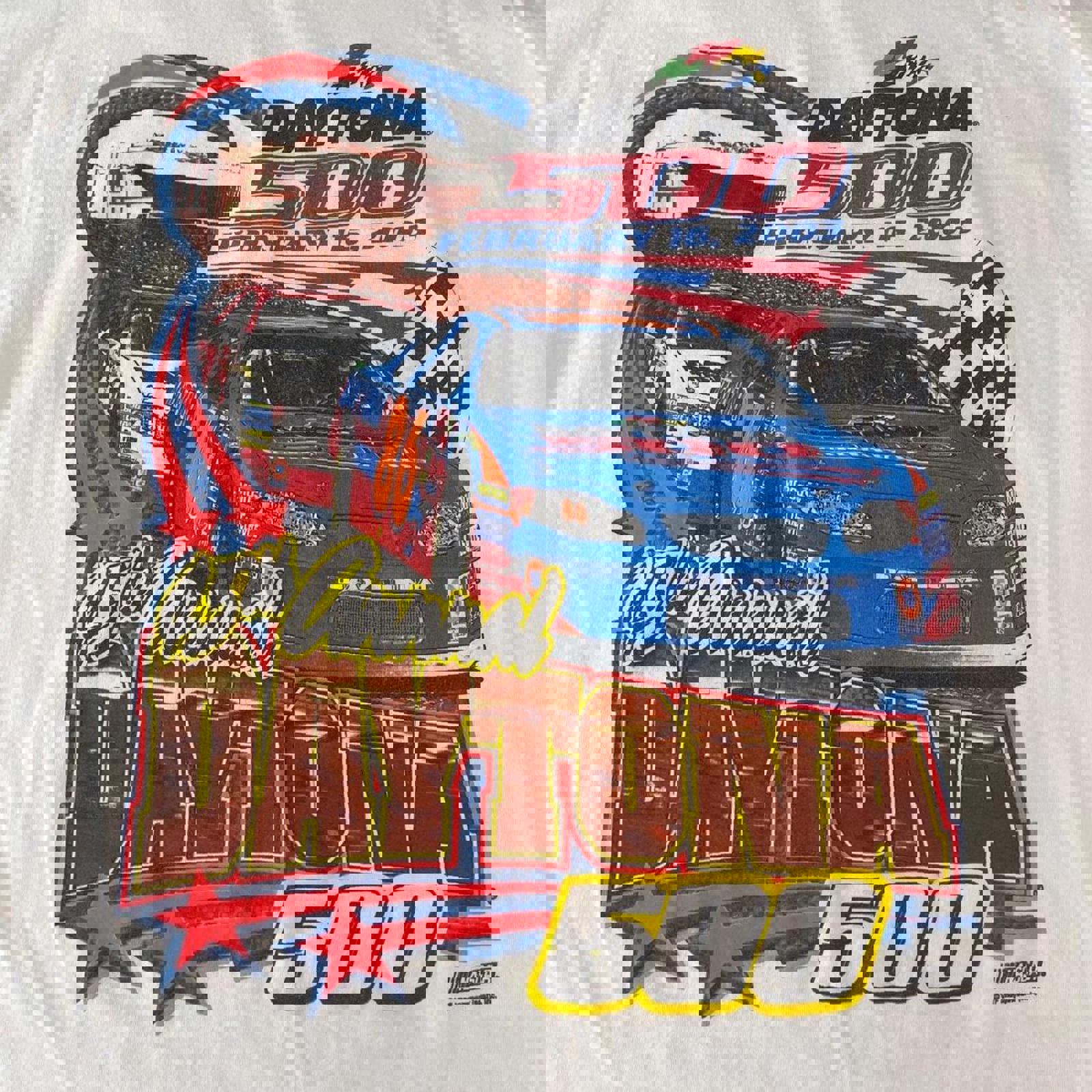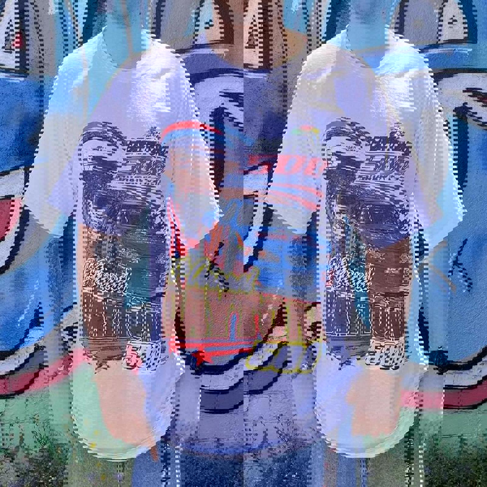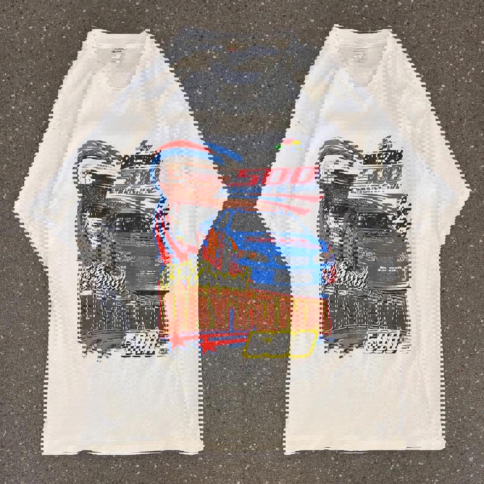 White chase authentics tshirt with a fluro coloured 2003 Daytona 500 graphic on the front