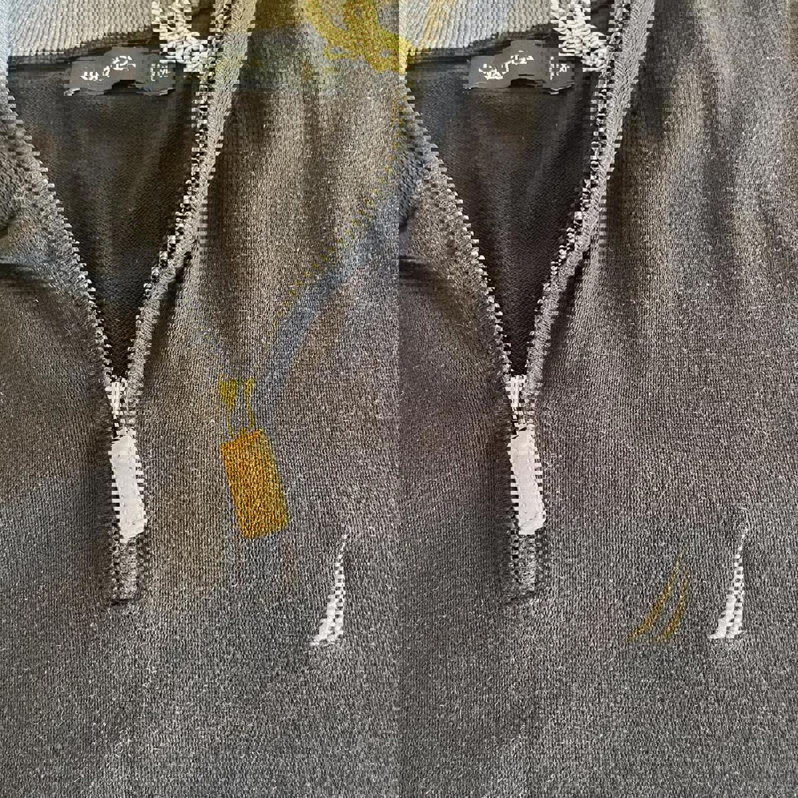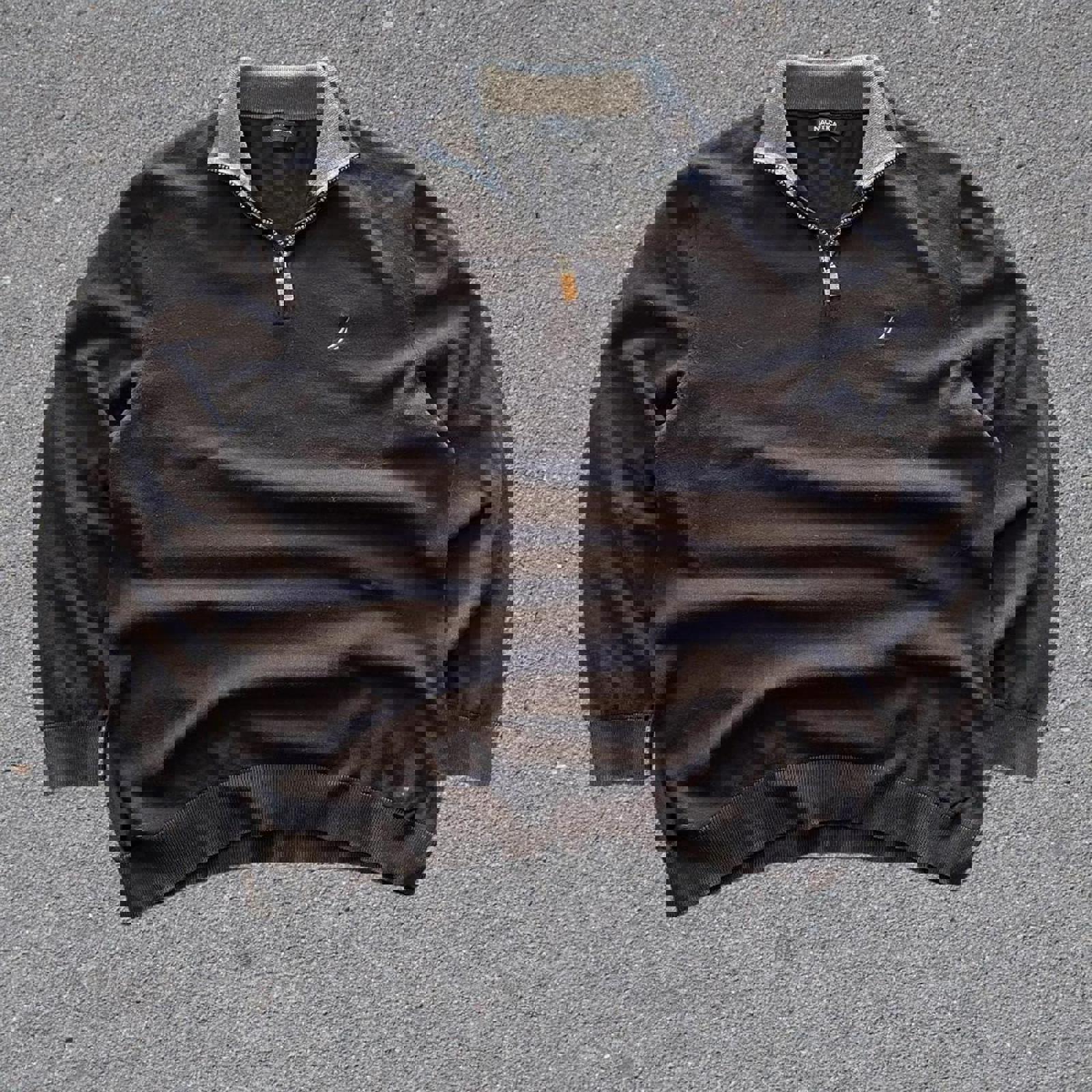 black nautica 1/4 zip jumper with grey embroidered sail on the chest, grey accent collar and a leather style zipper