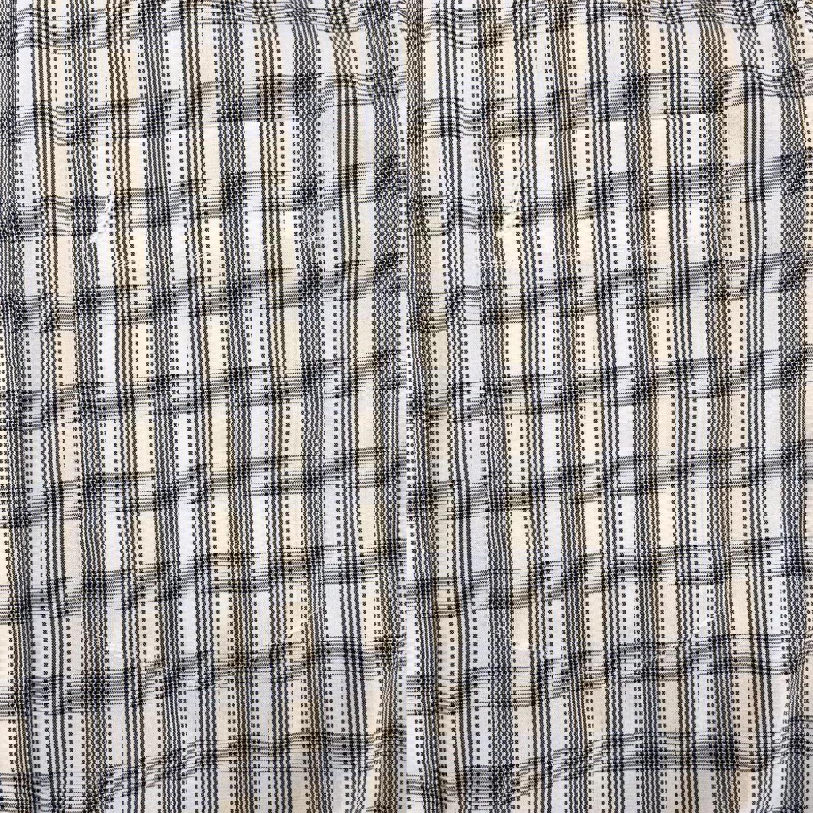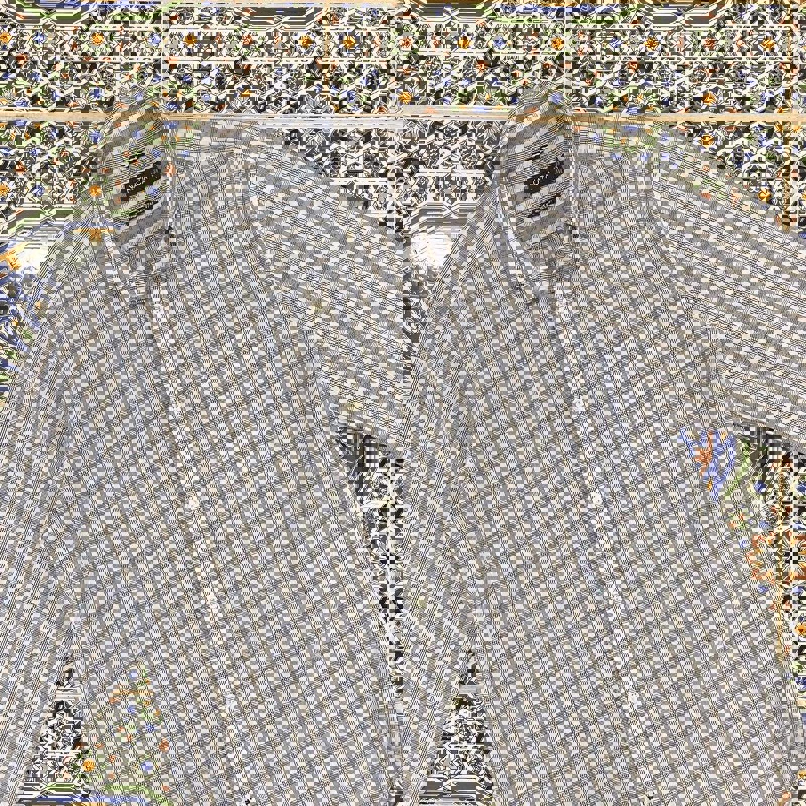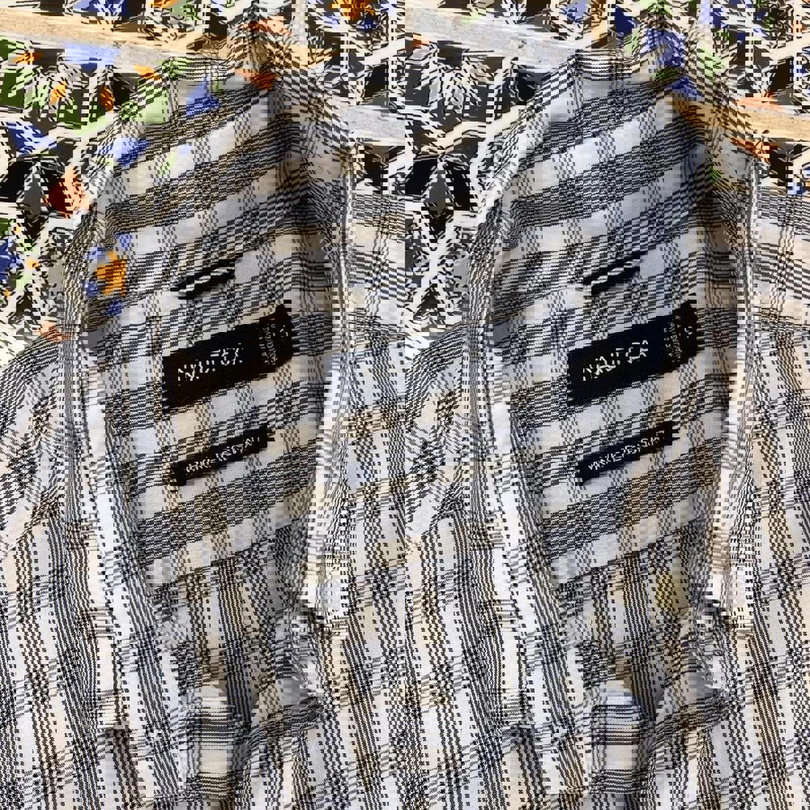 navy and white checkered wrinkle resistant nautica button up shirt with an embroidered white boat sail on the chest pocket
