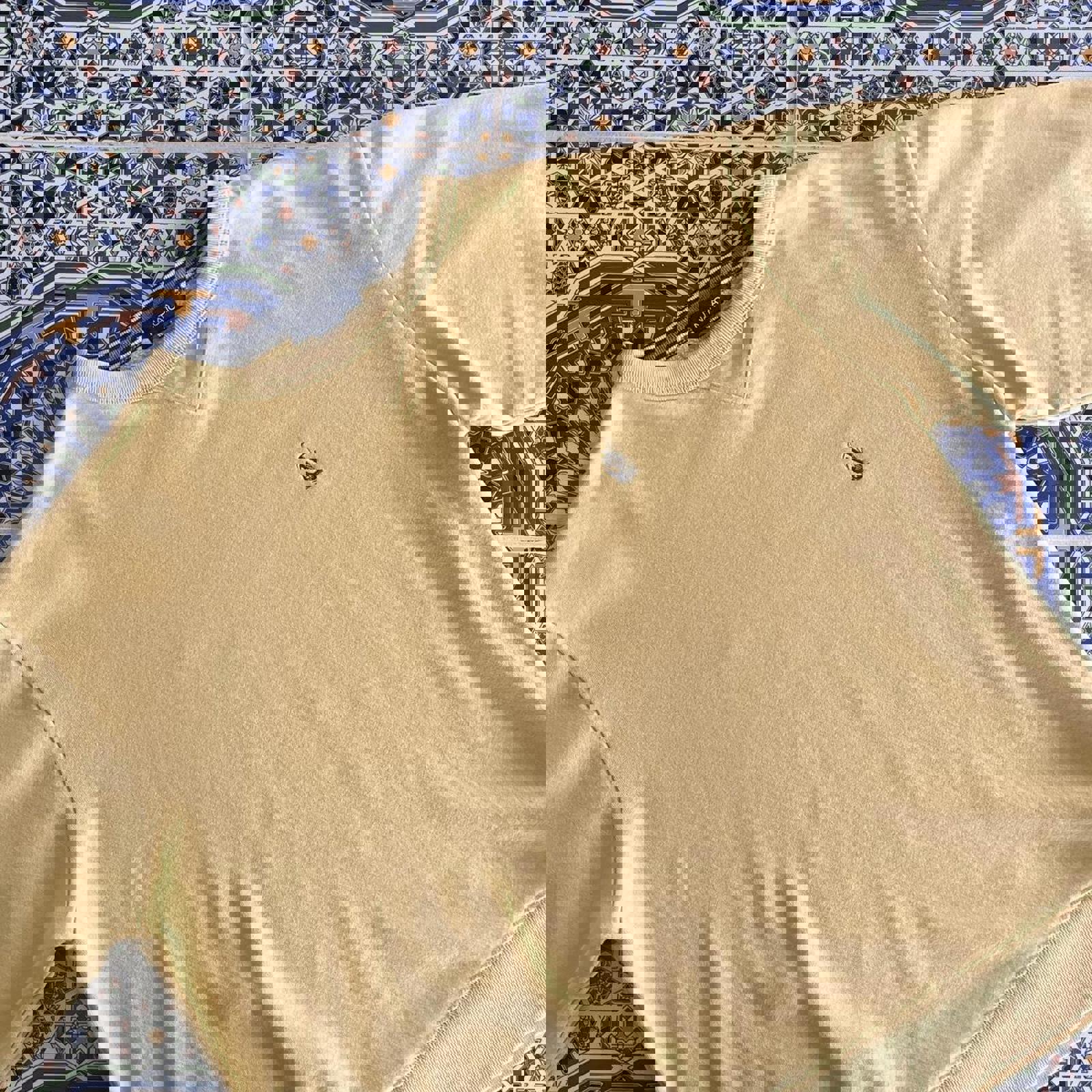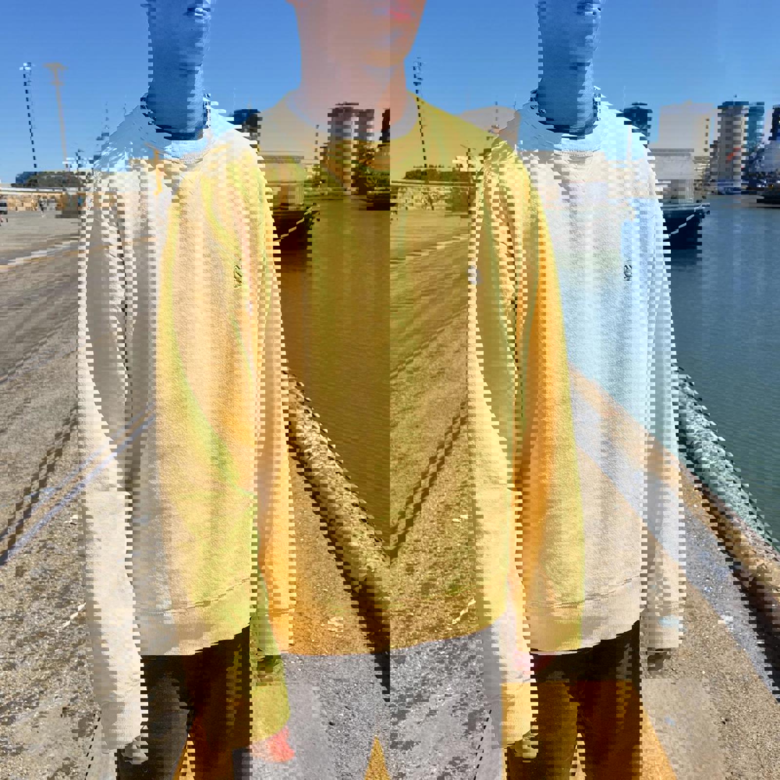 yellow nautica crewneck sweater with a navy embroidered sail boat