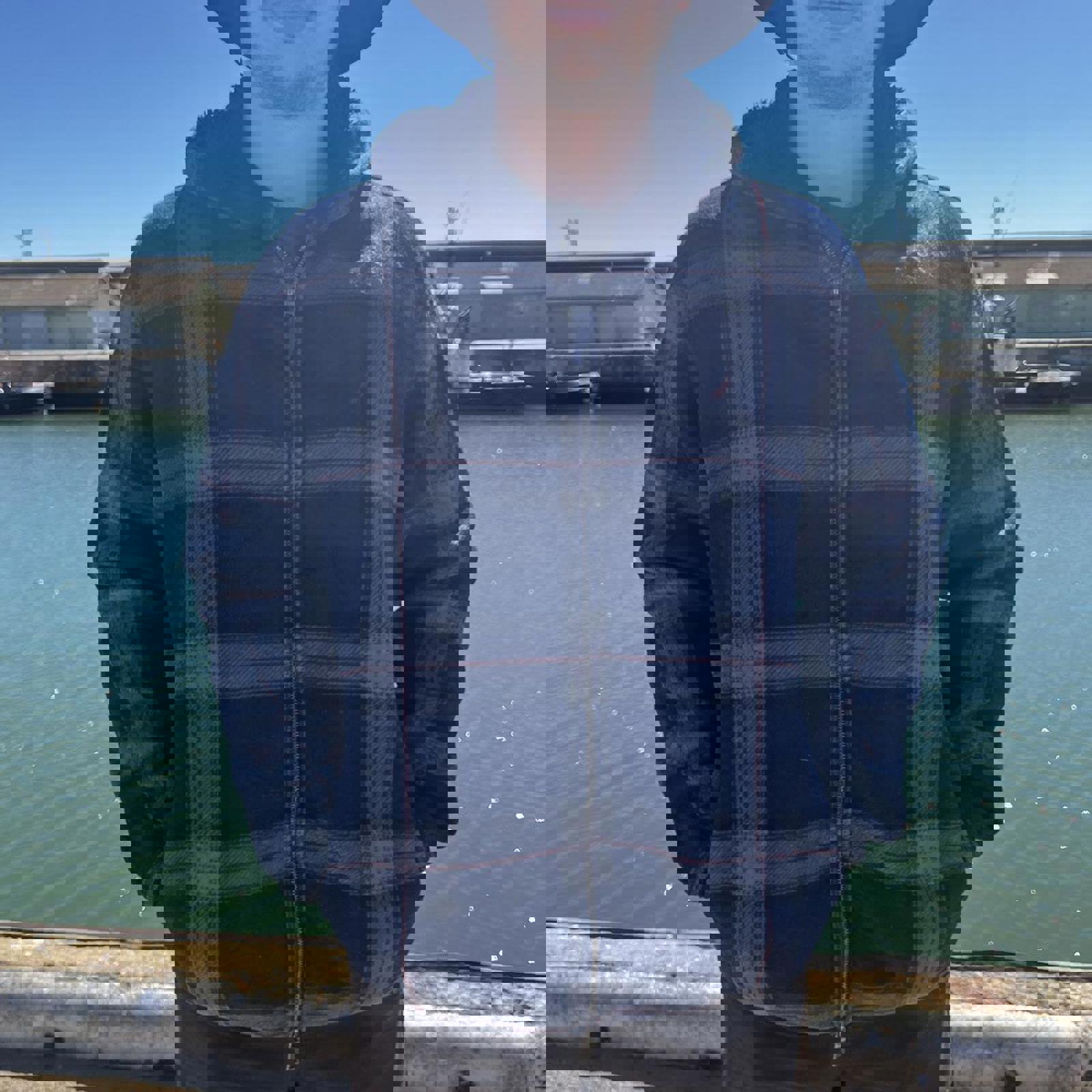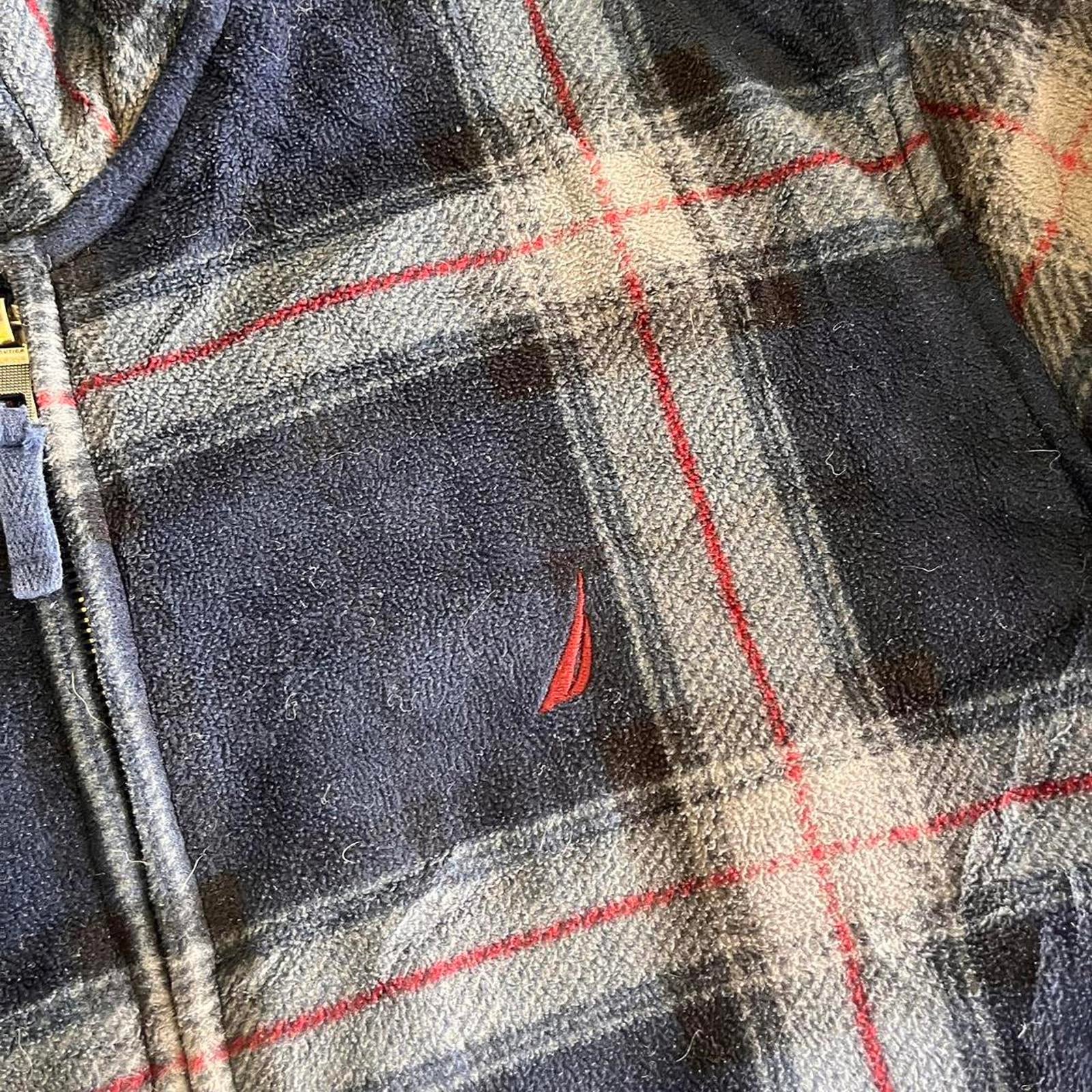 navy, white and red flannel style patterned nautica hoodie with red embroidered nautica sails and comfy fleece lined interior