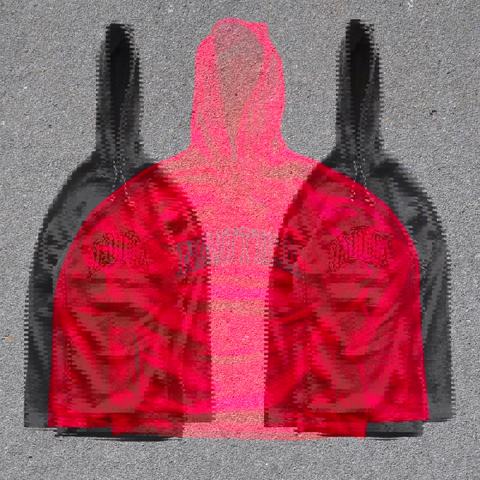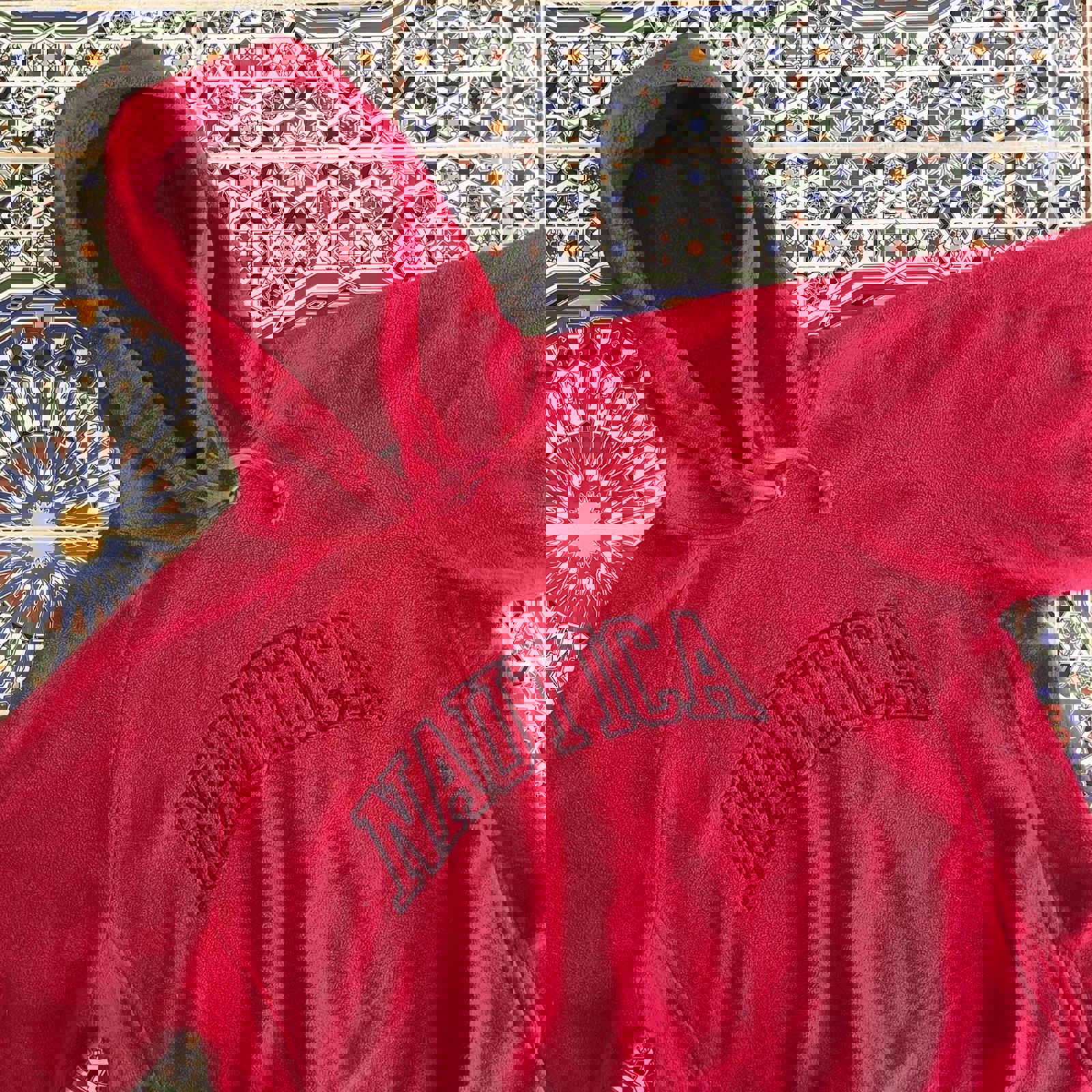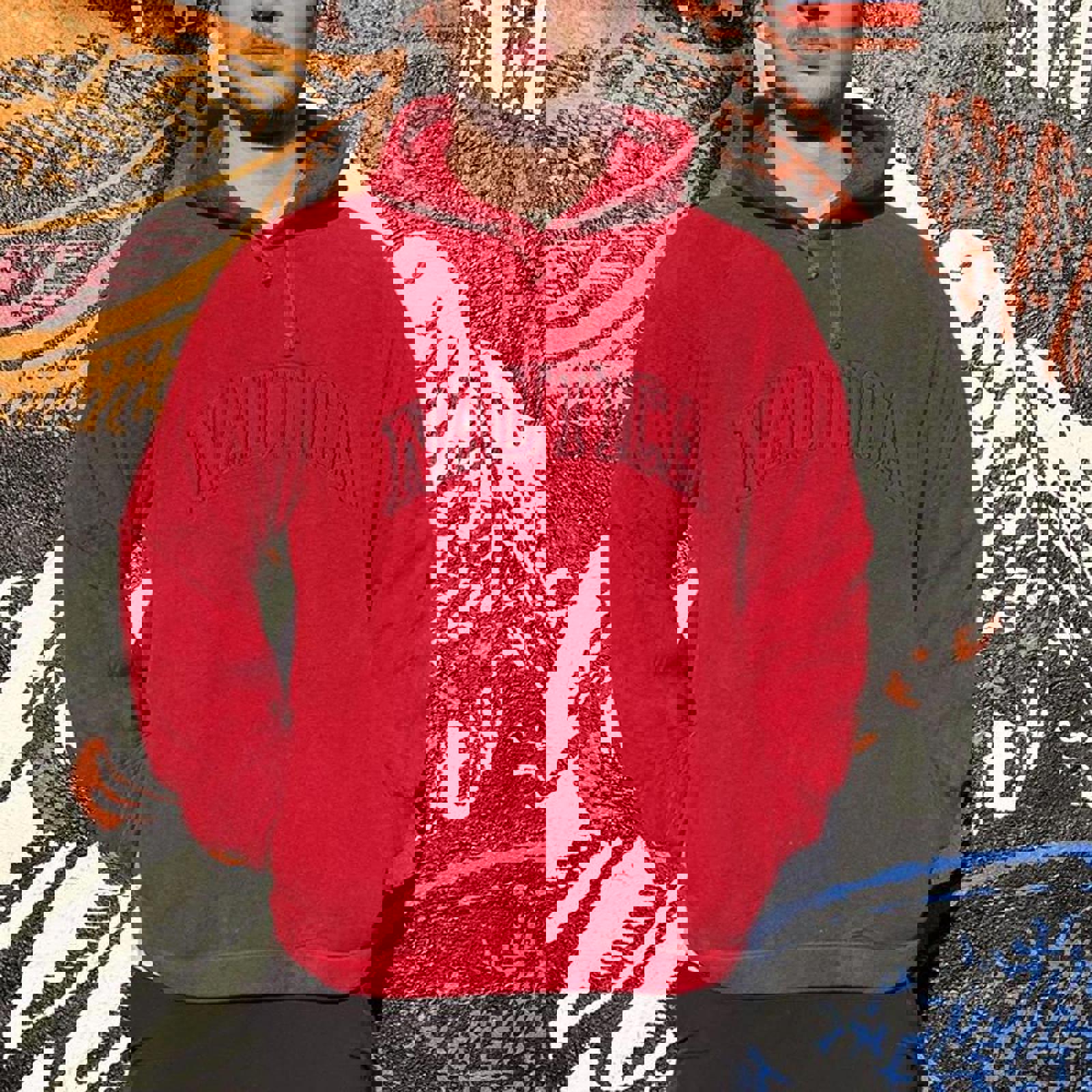 red nautica fleece hoodie with embroidered navy nautica spell out over the chest