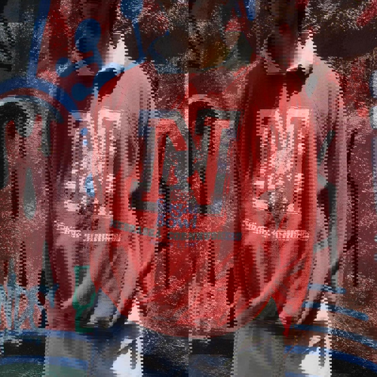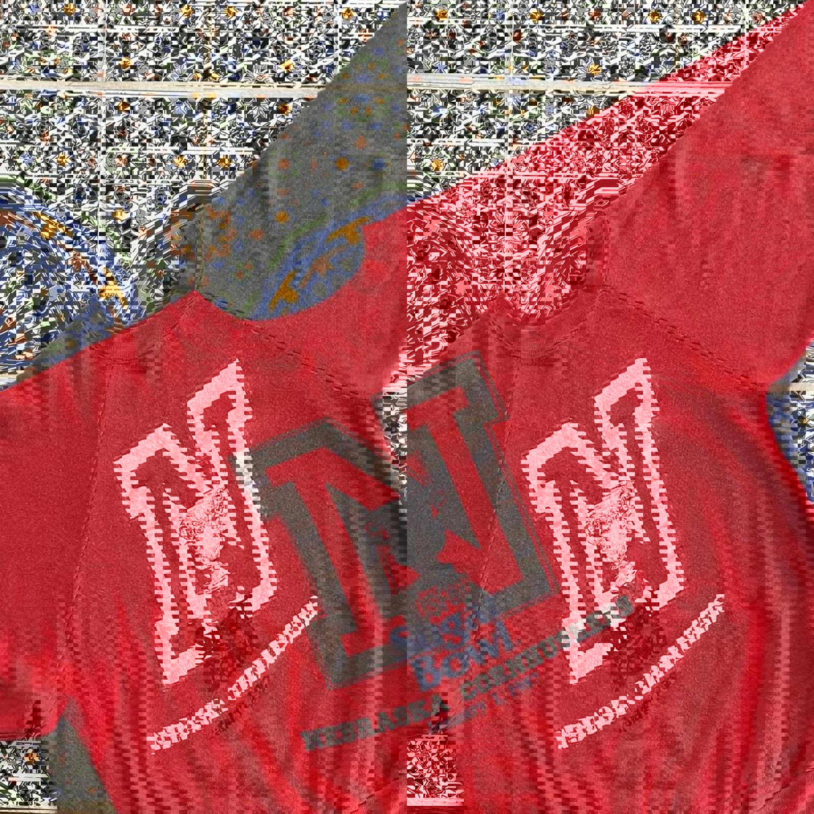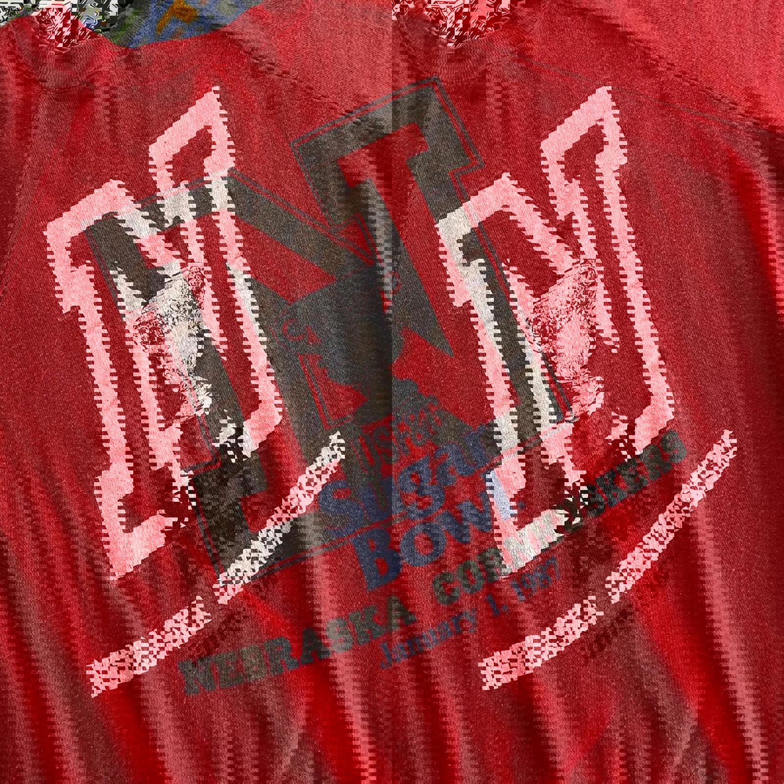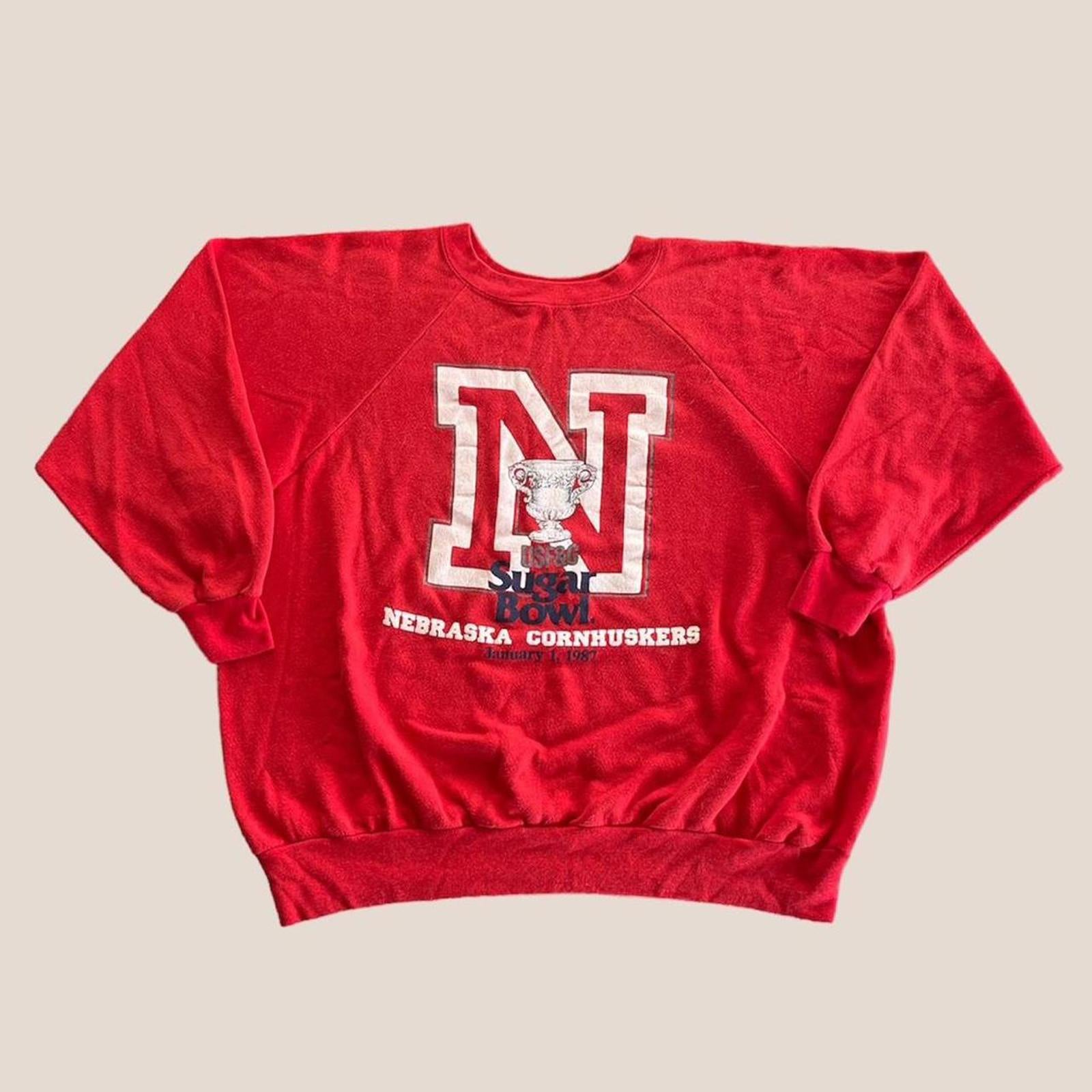1987 sugar bowl college sweatshirt in red with big white, navy and grey graphic