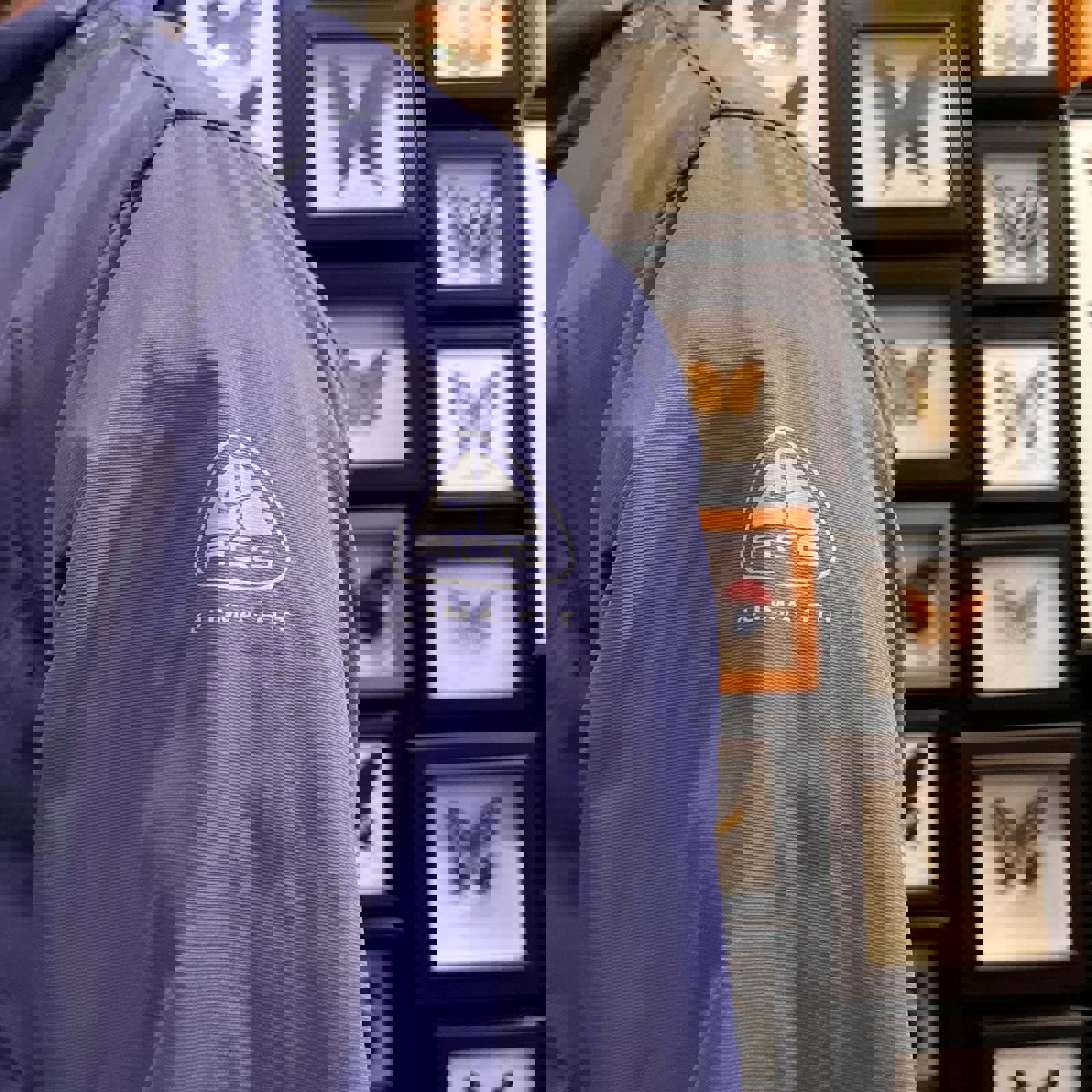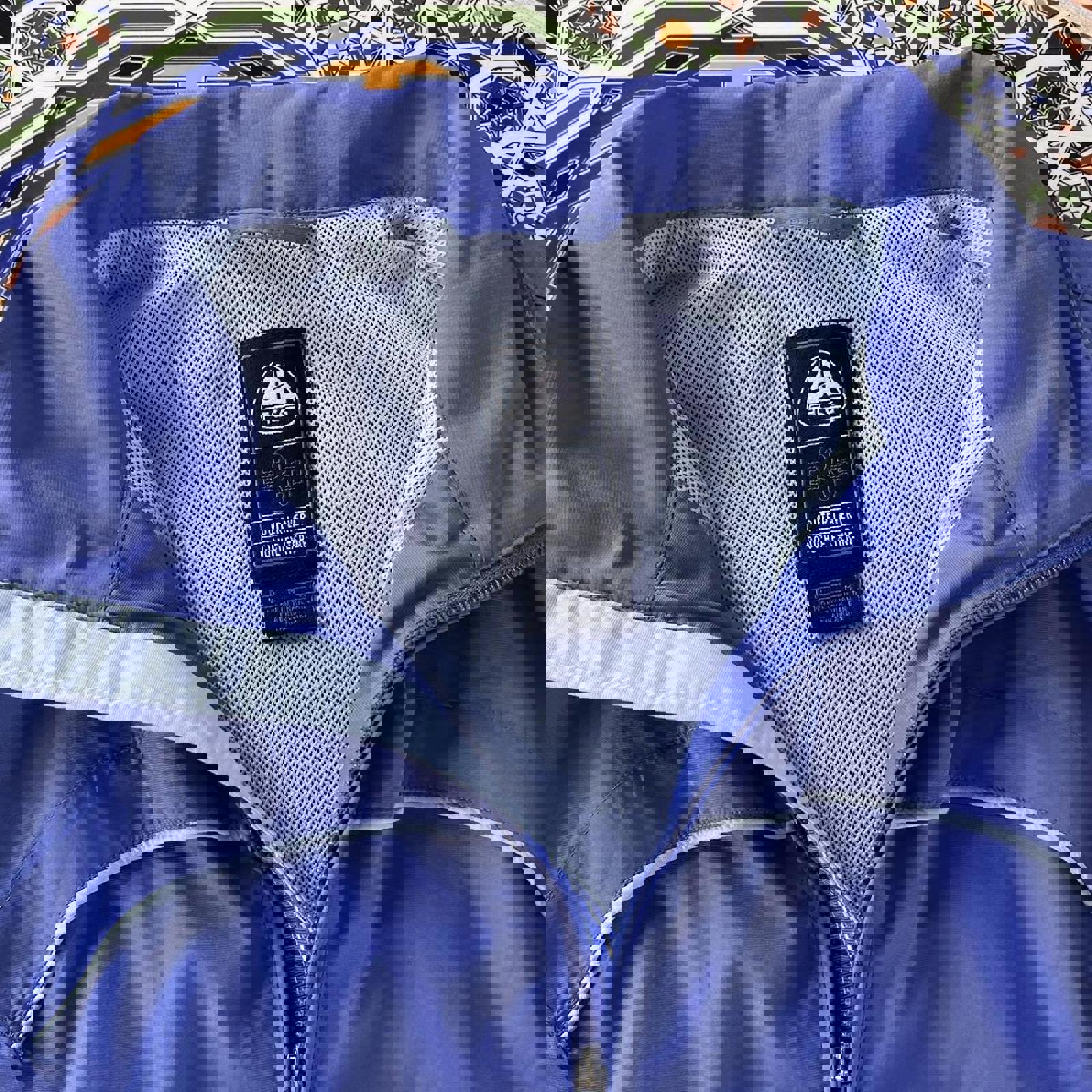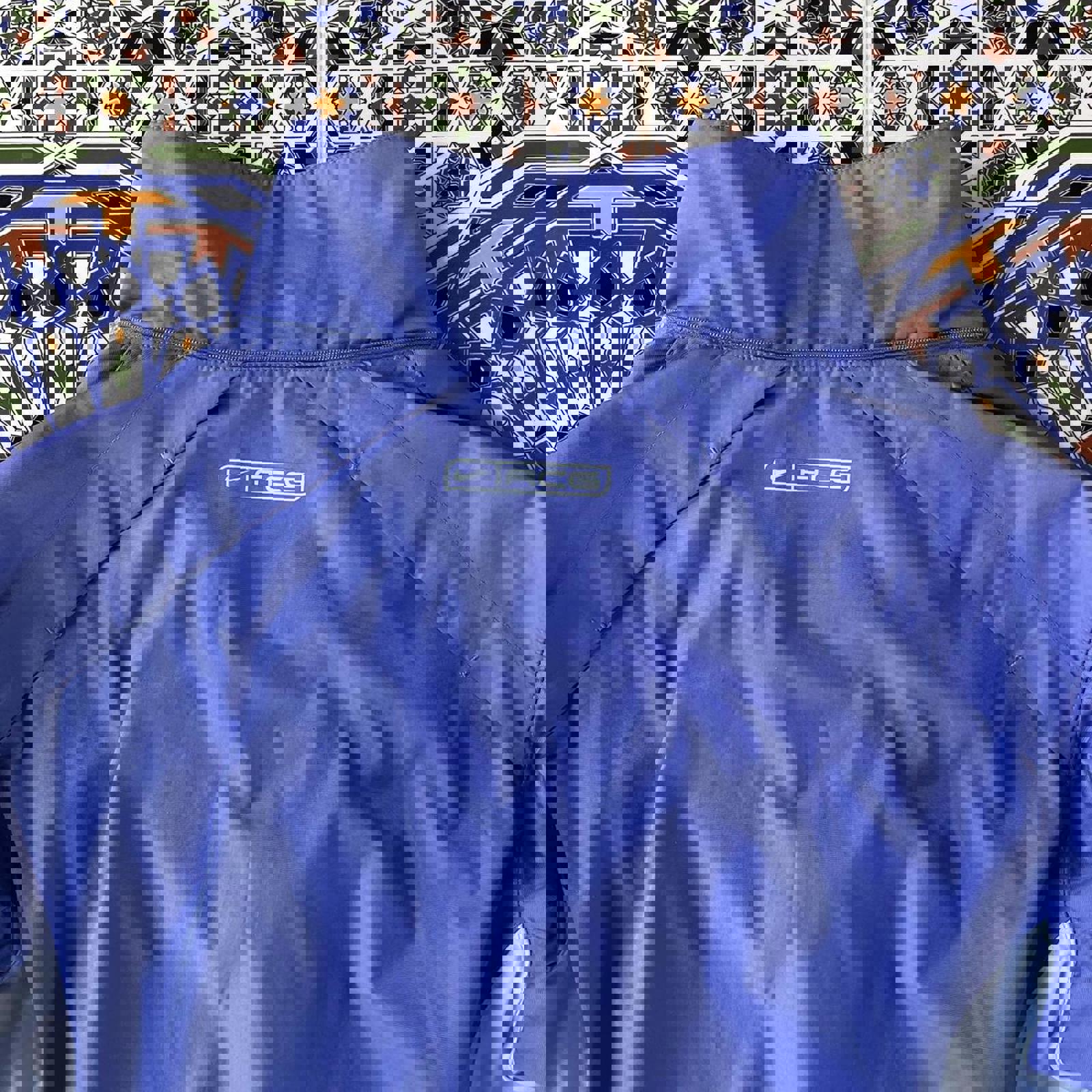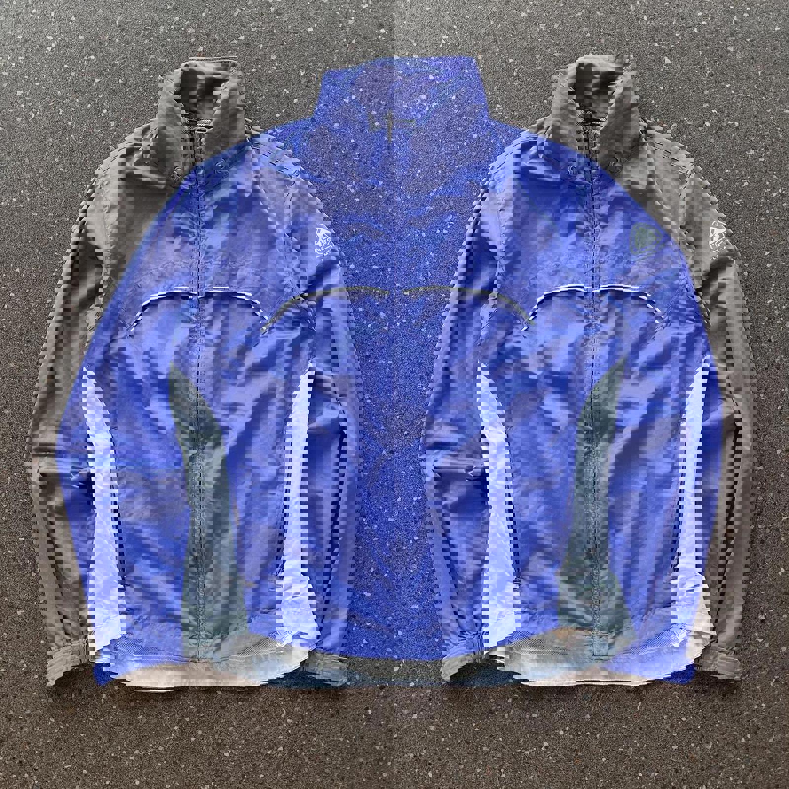 lavender and baby blue / sky blue nike acg jacket with graphics on the shoulder and back. has zip-able side pockets and missing hood