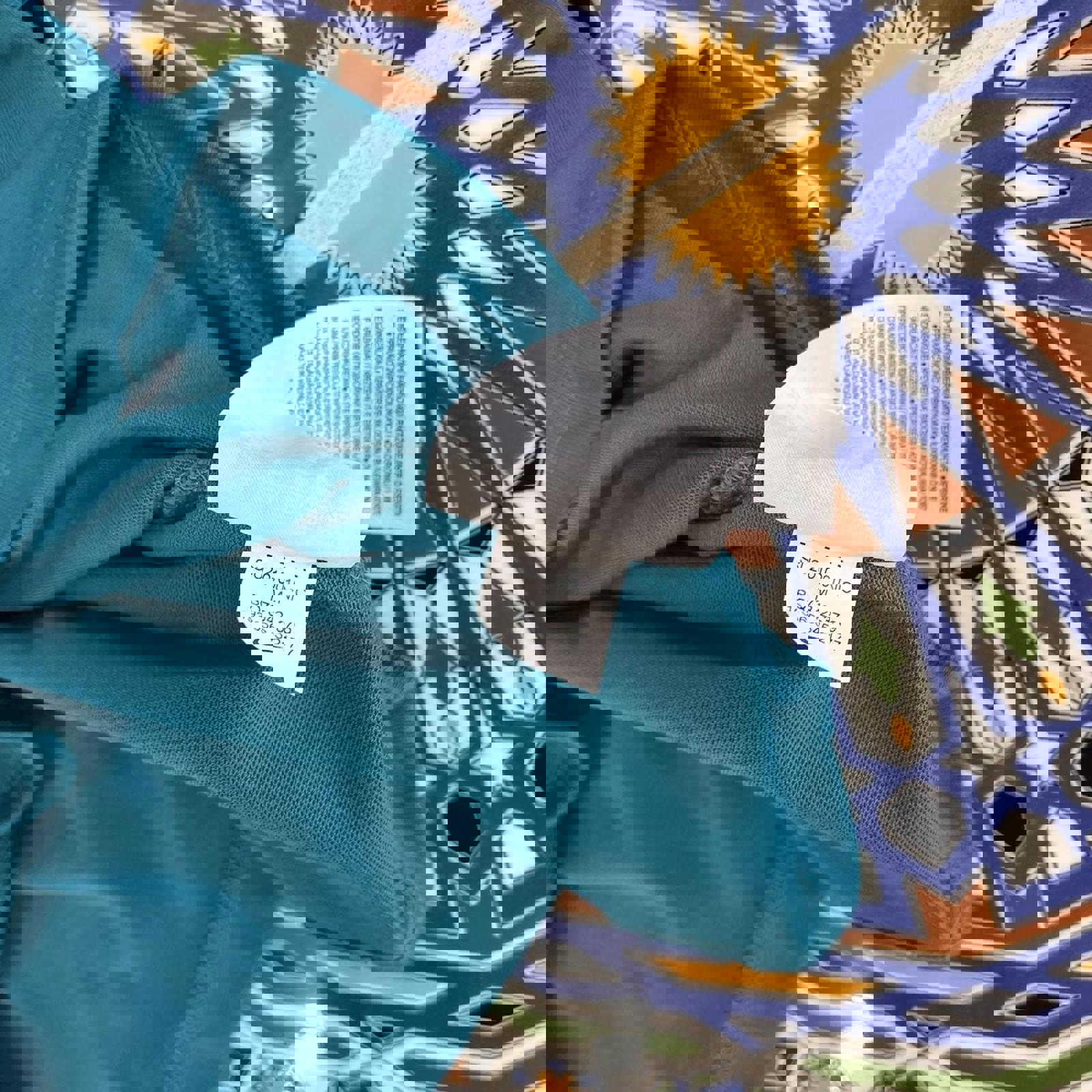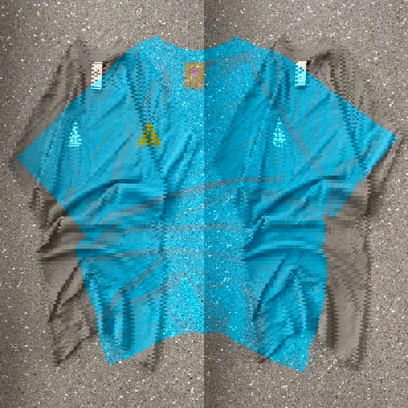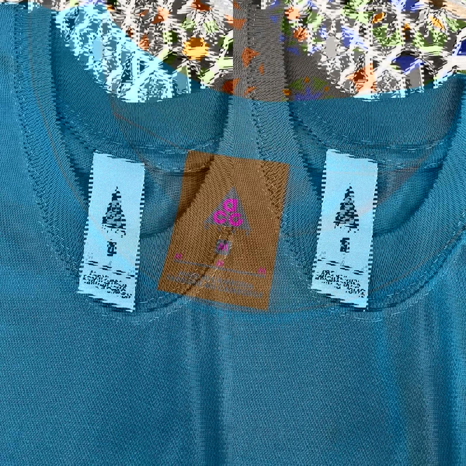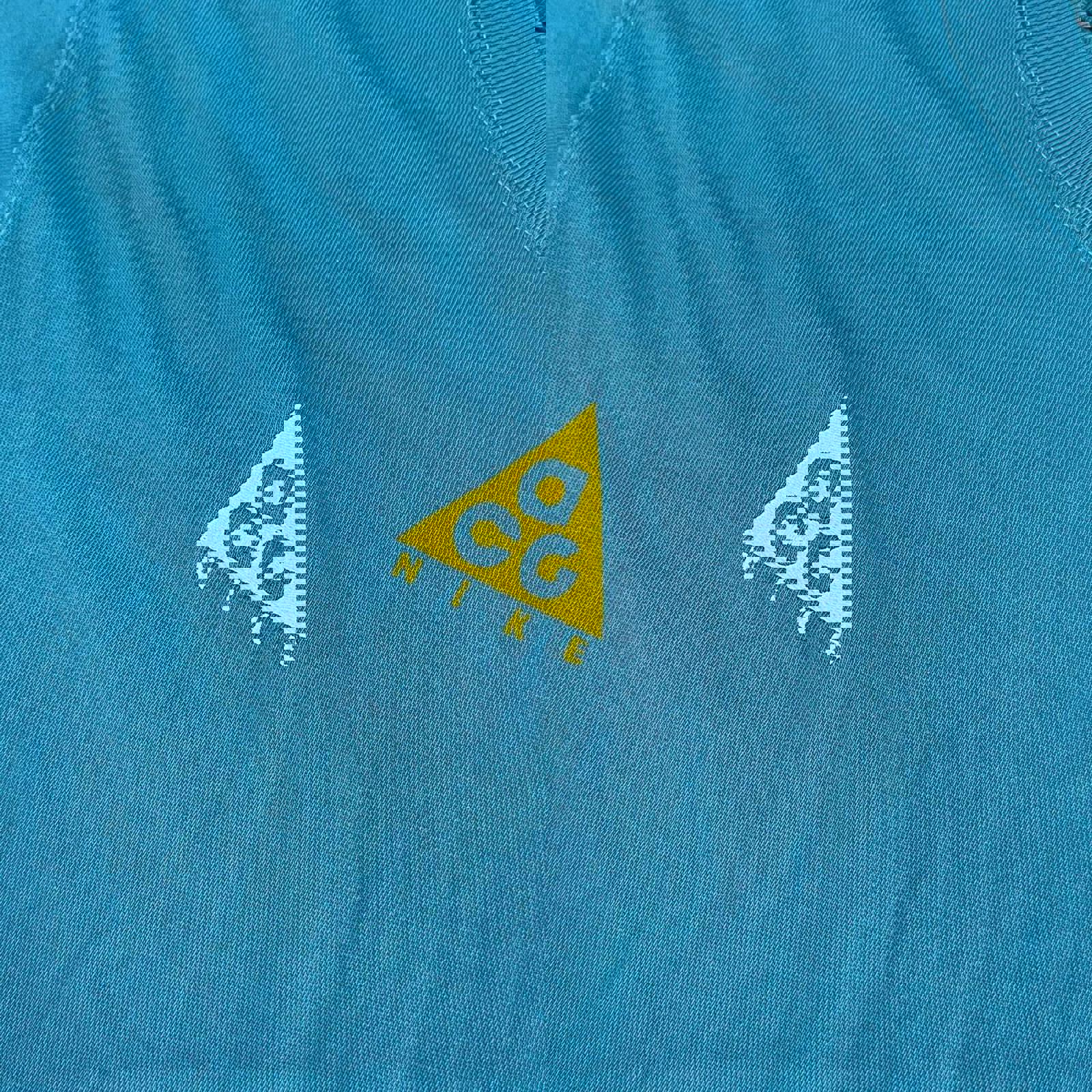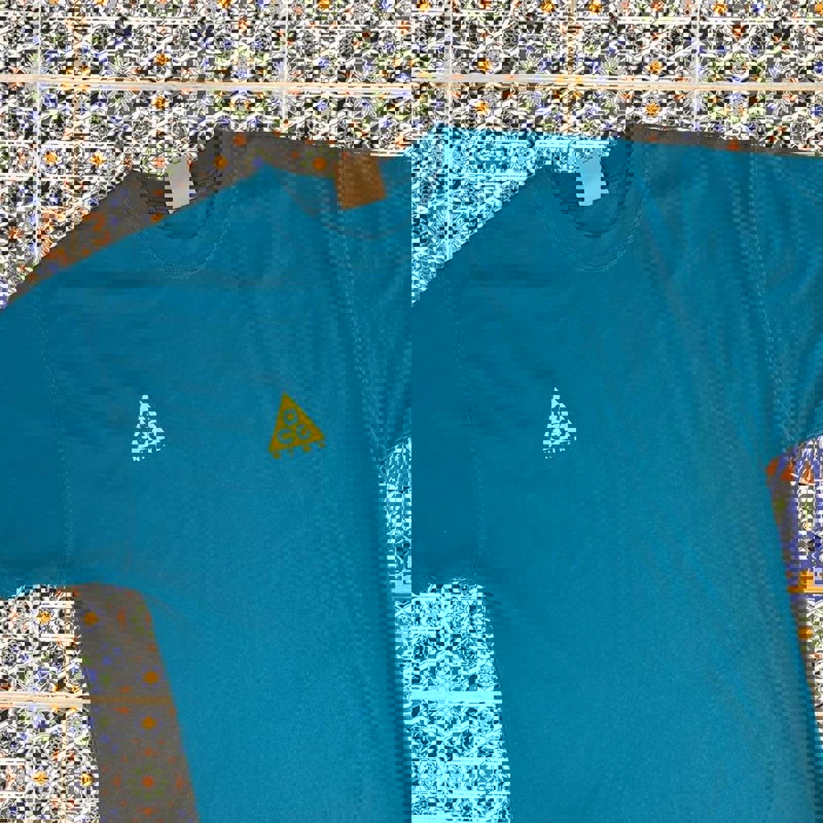Turquoise Nike acg tshirt with a yellow embroidered acg logo on the chest