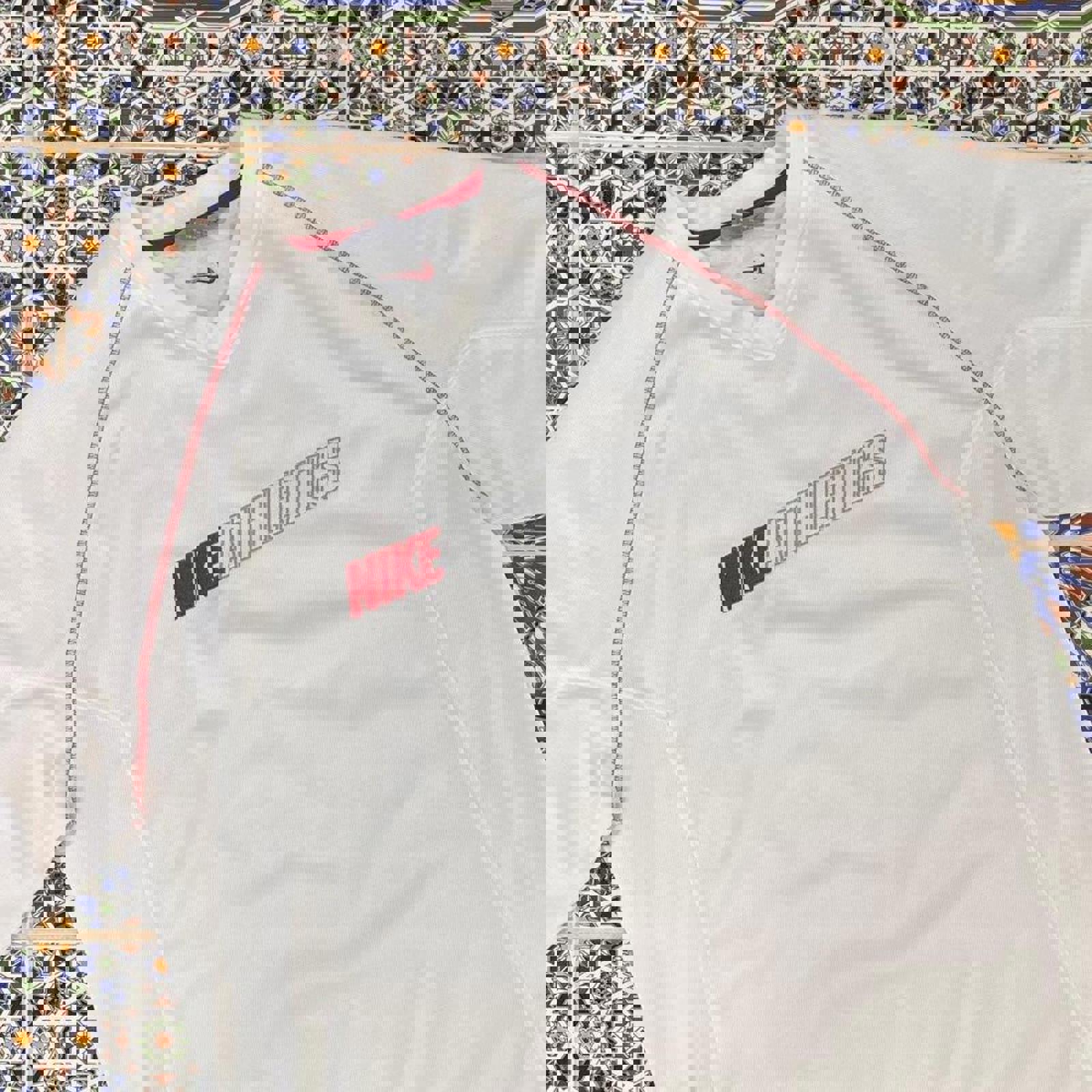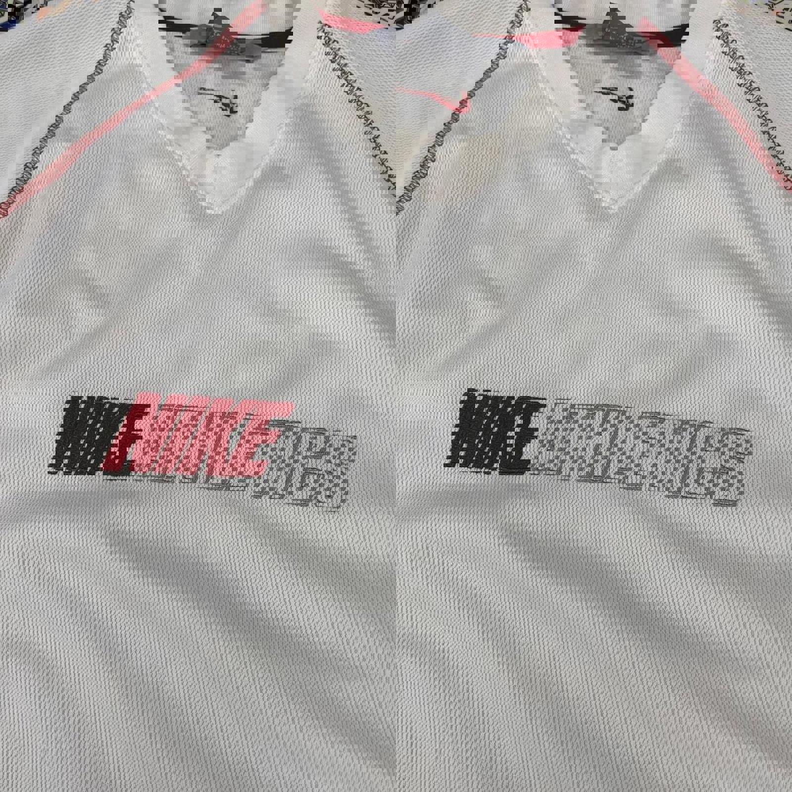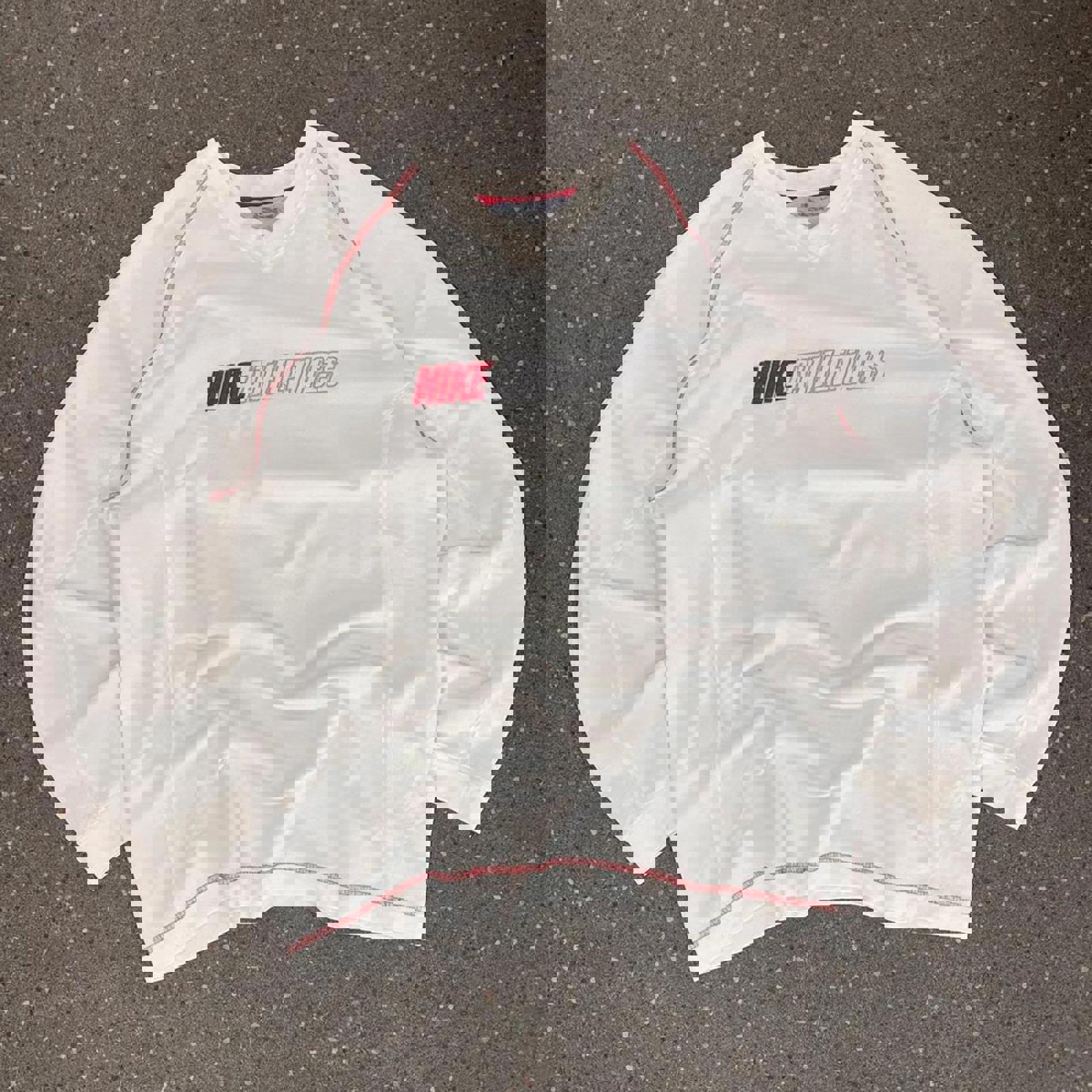 Vintage white Nike athletics long sleeve tshirt with a grey and red embroidered Nike athletics spell out on the chest