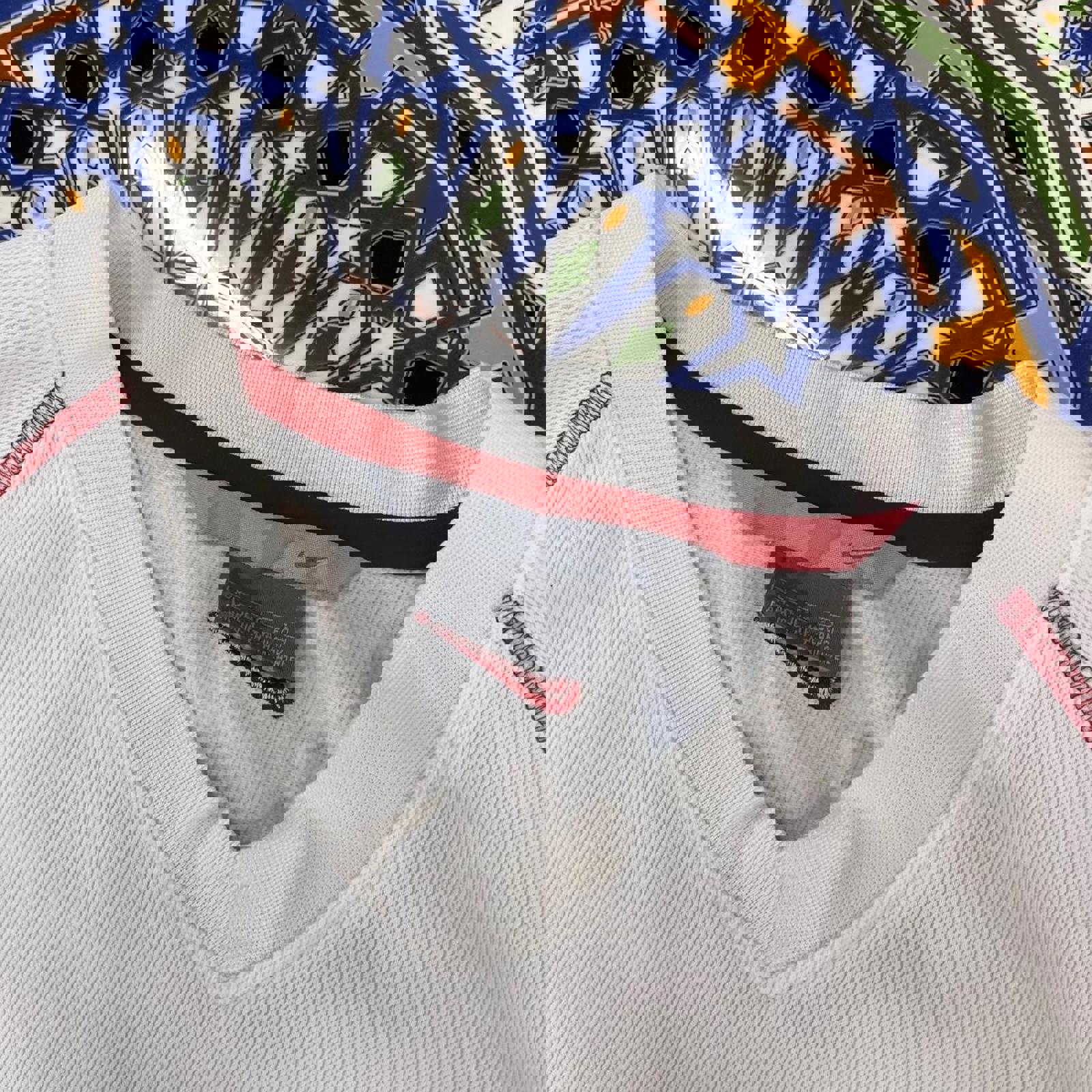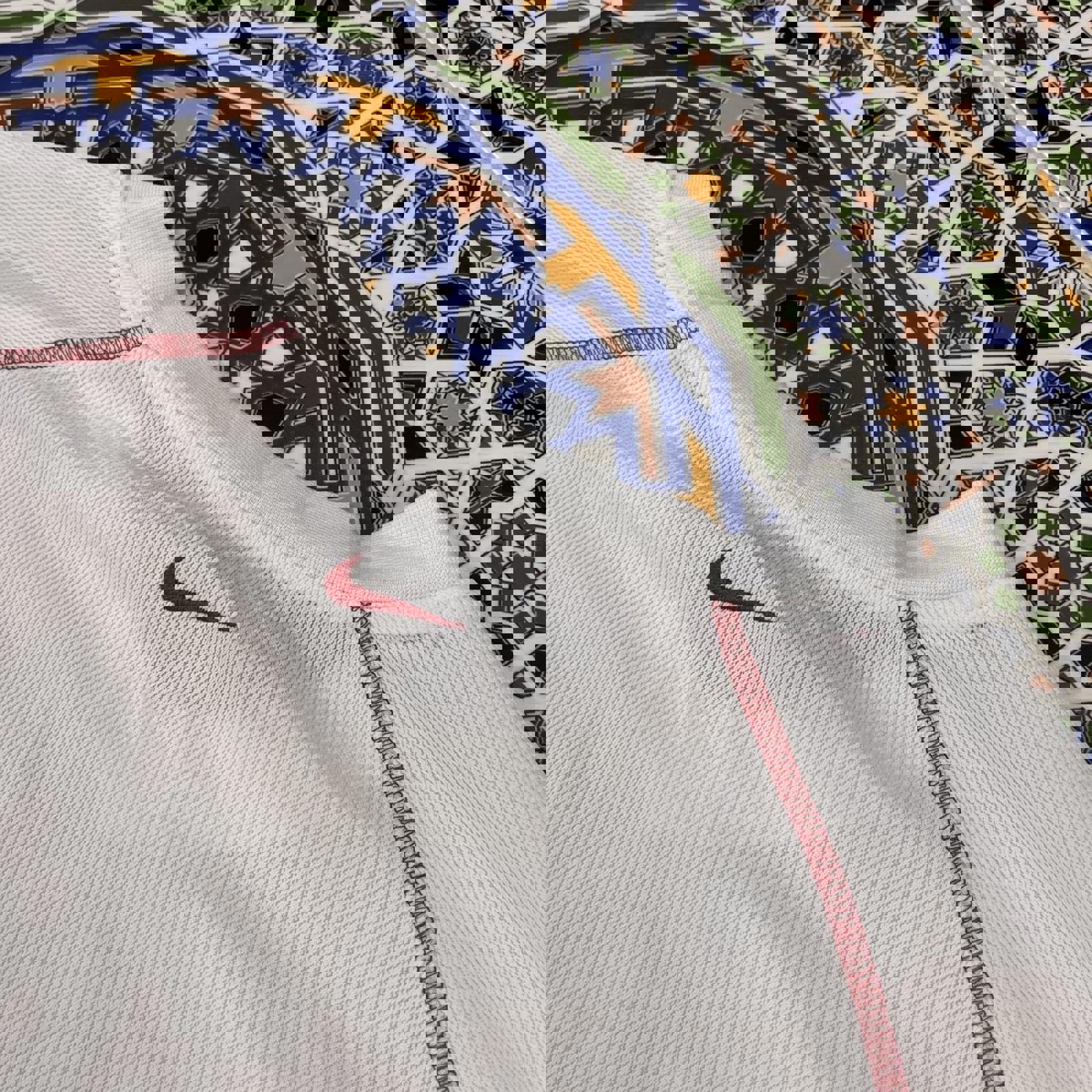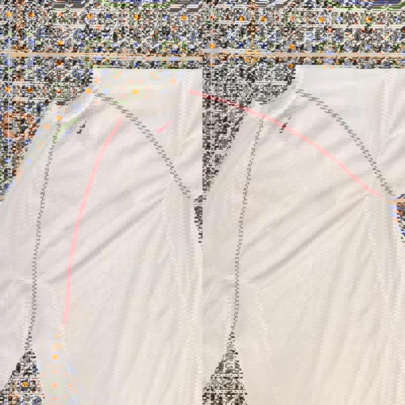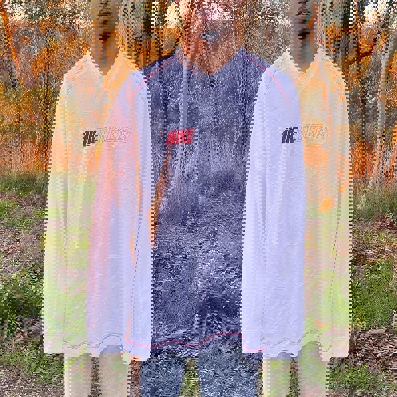 Vintage white Nike athletics long sleeve tshirt with a grey and red embroidered Nike athletics spell out on the chest