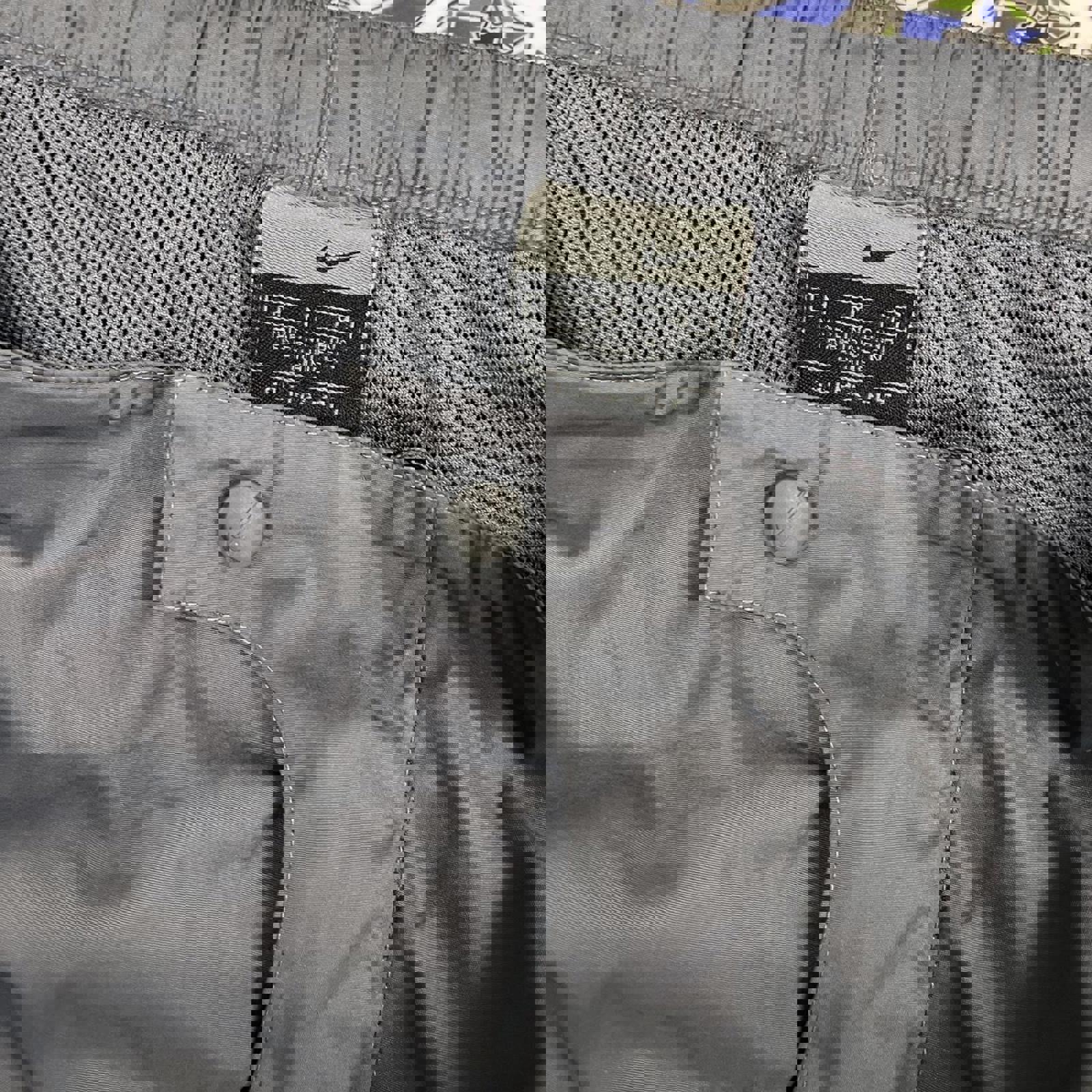 grey nike sweatpants with a white embroidered check on the hip, detailed button and mesh interior
