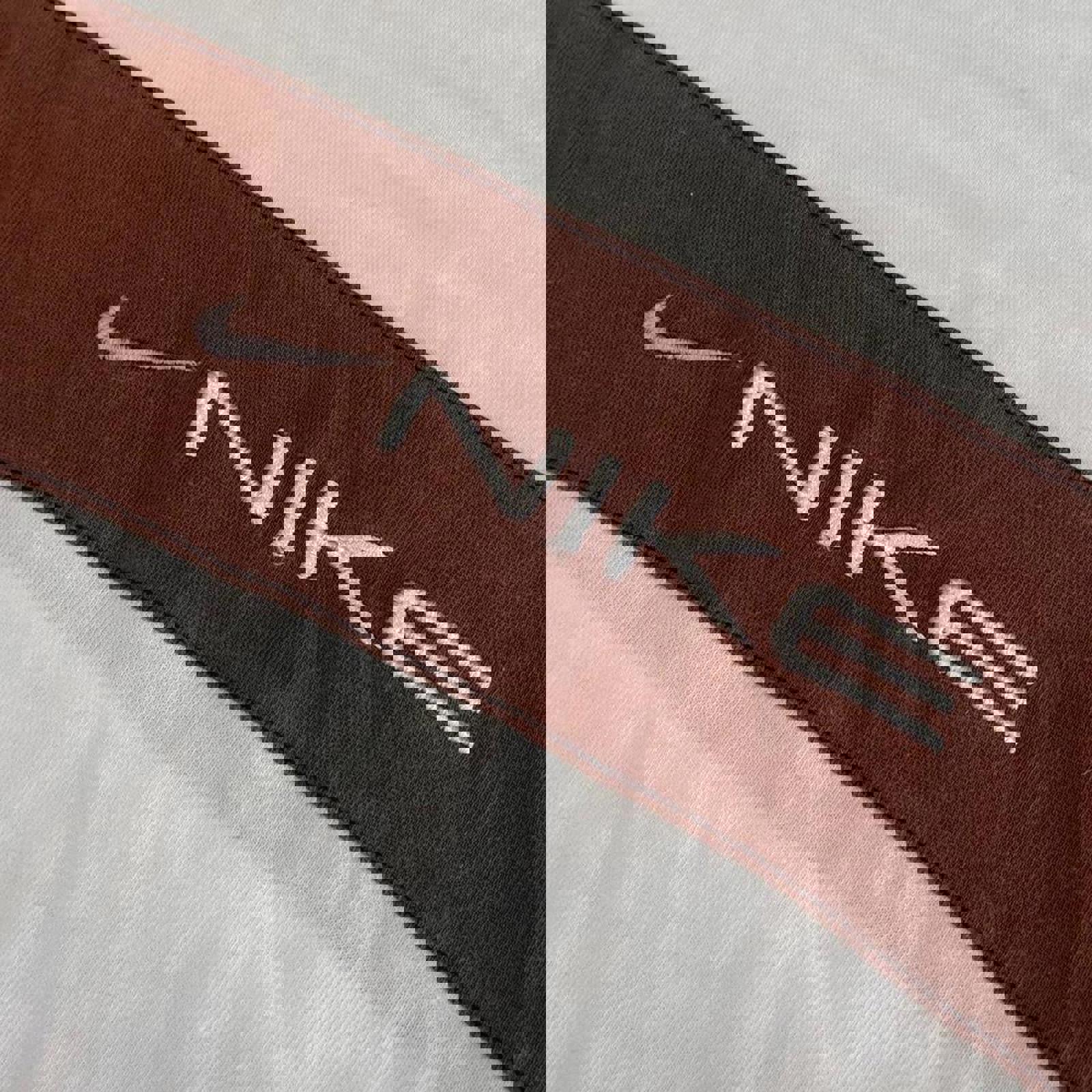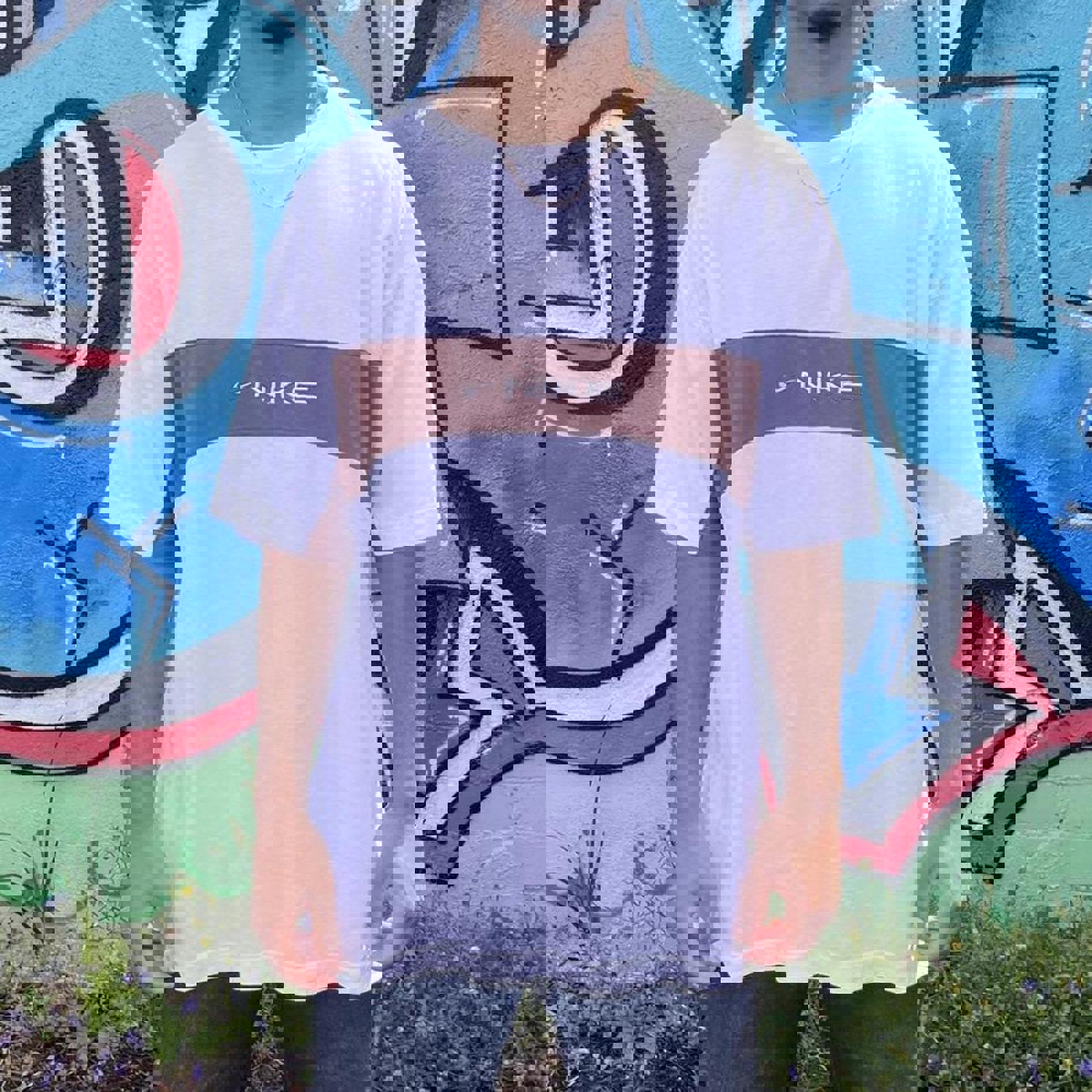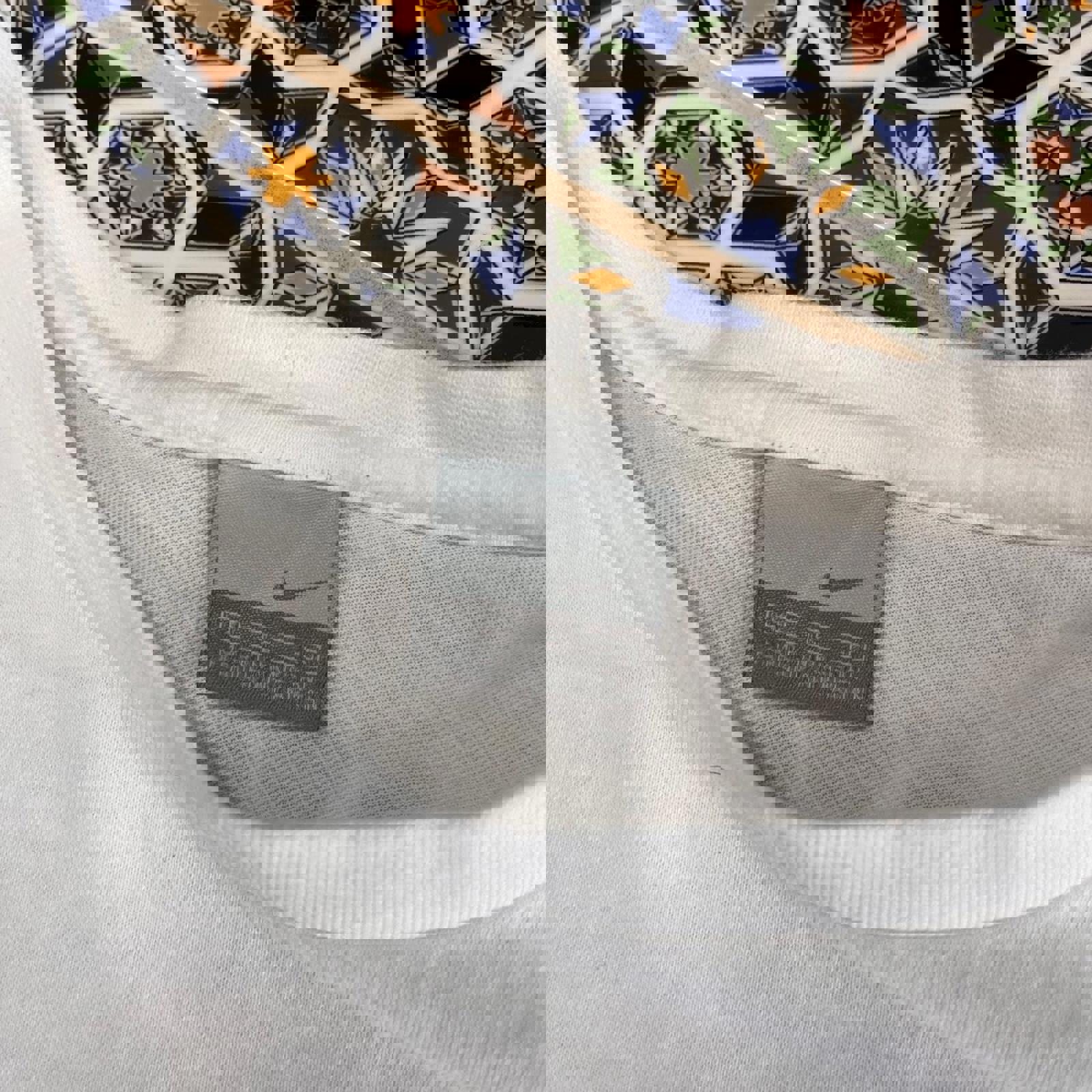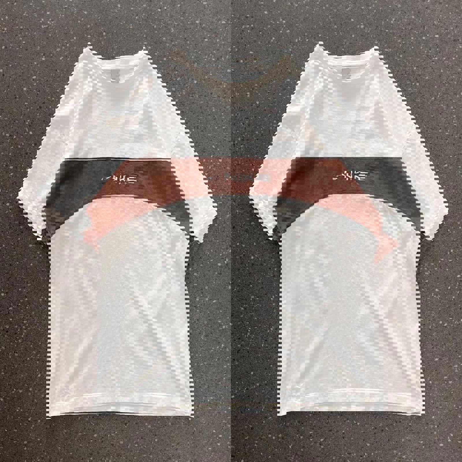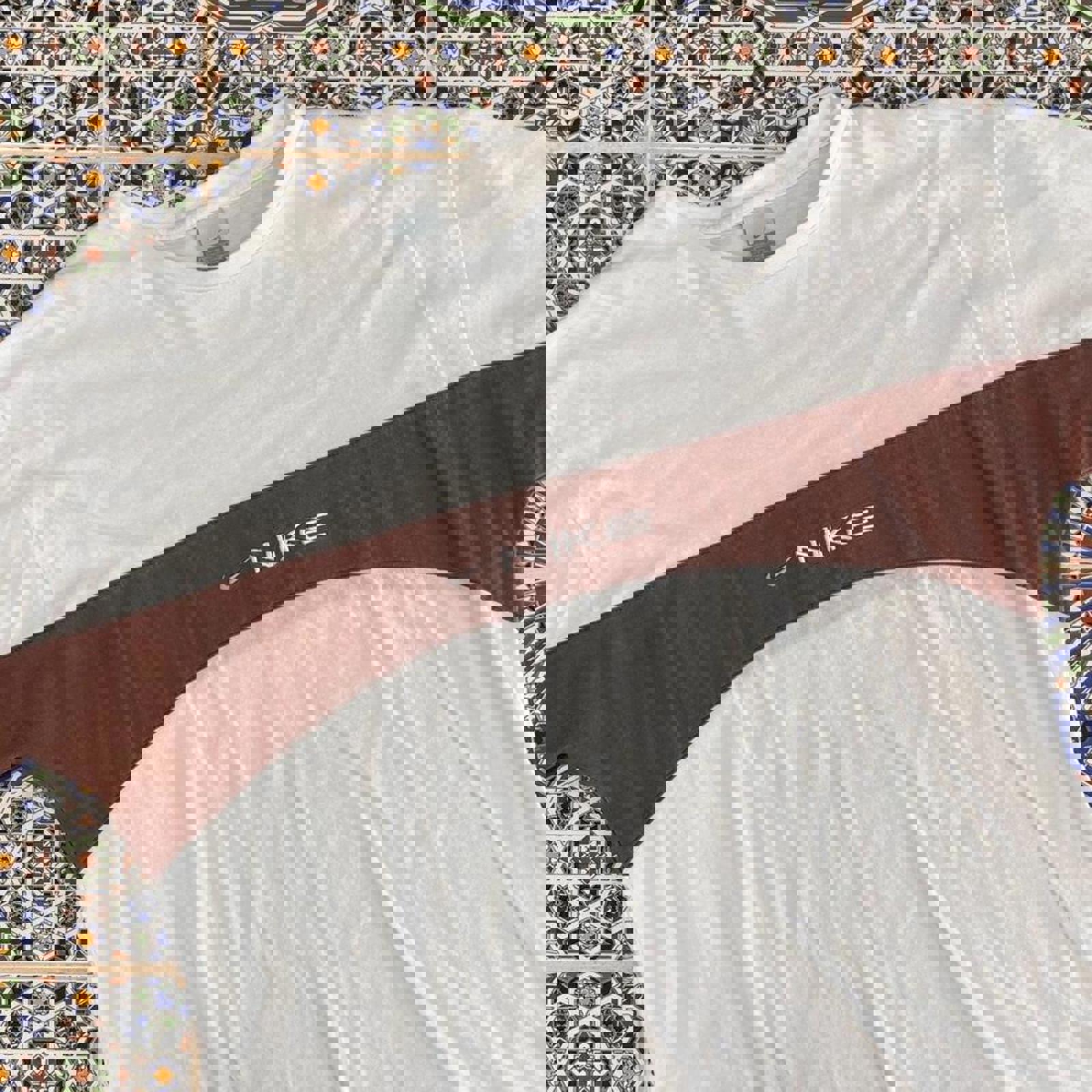 White and brown early 2000s Nike tshirt with a grey and white embroidered check and Nike on the front