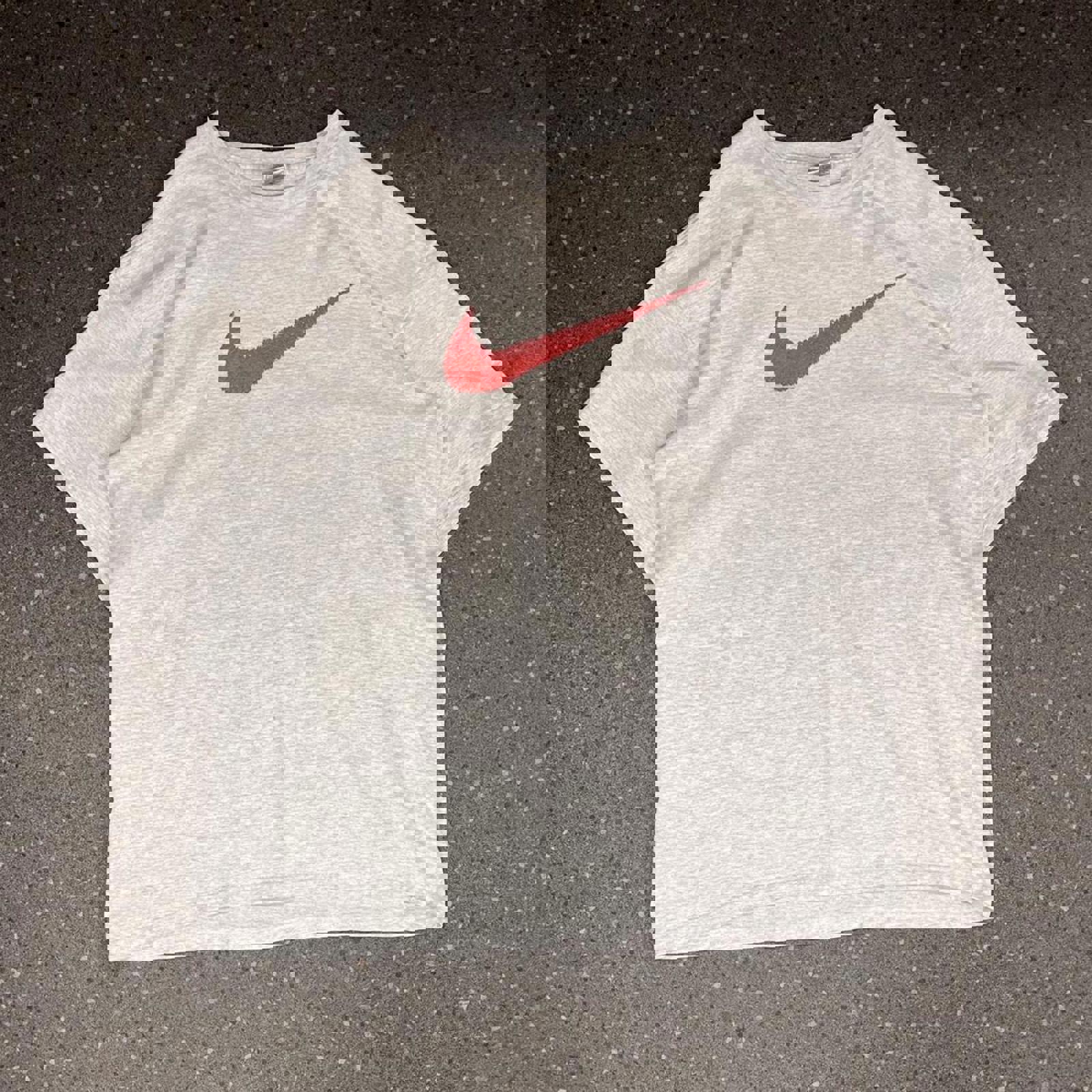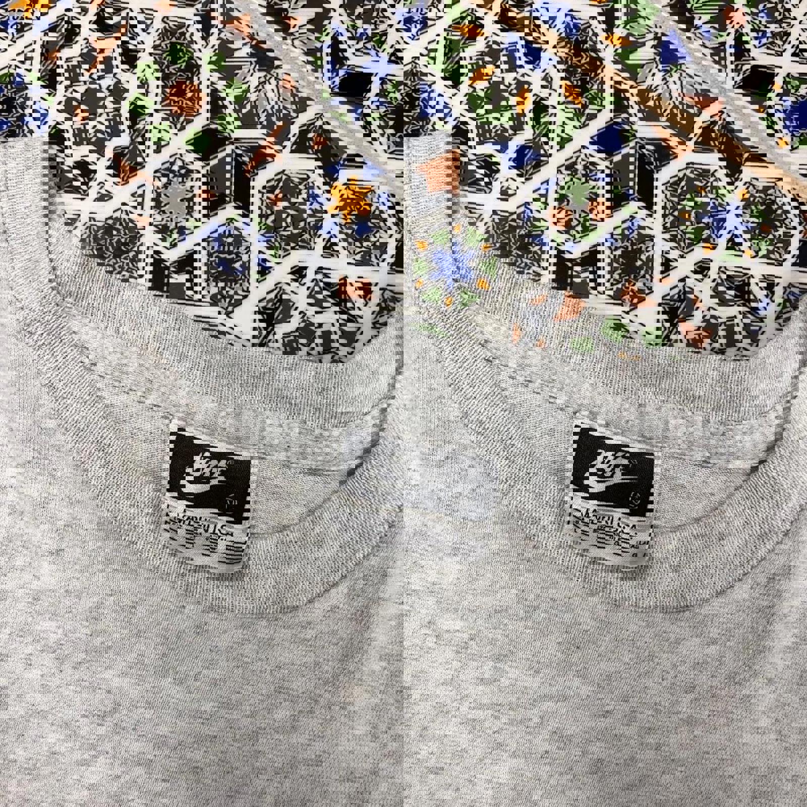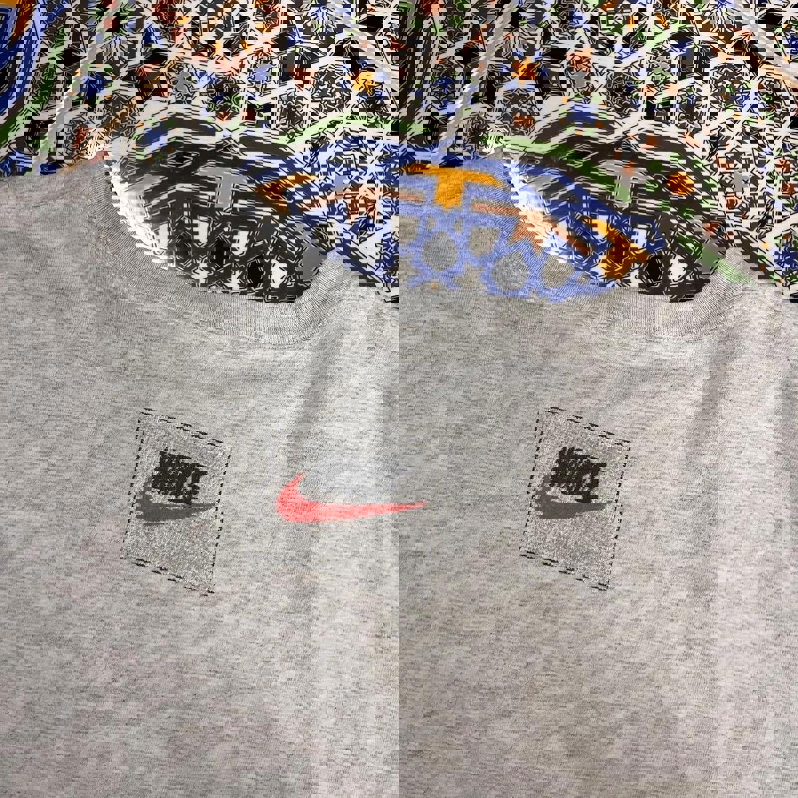 Grey 90s Nike tshirt with a large red check graphic that looks like it’s sewn on and a small patch graphic on the back