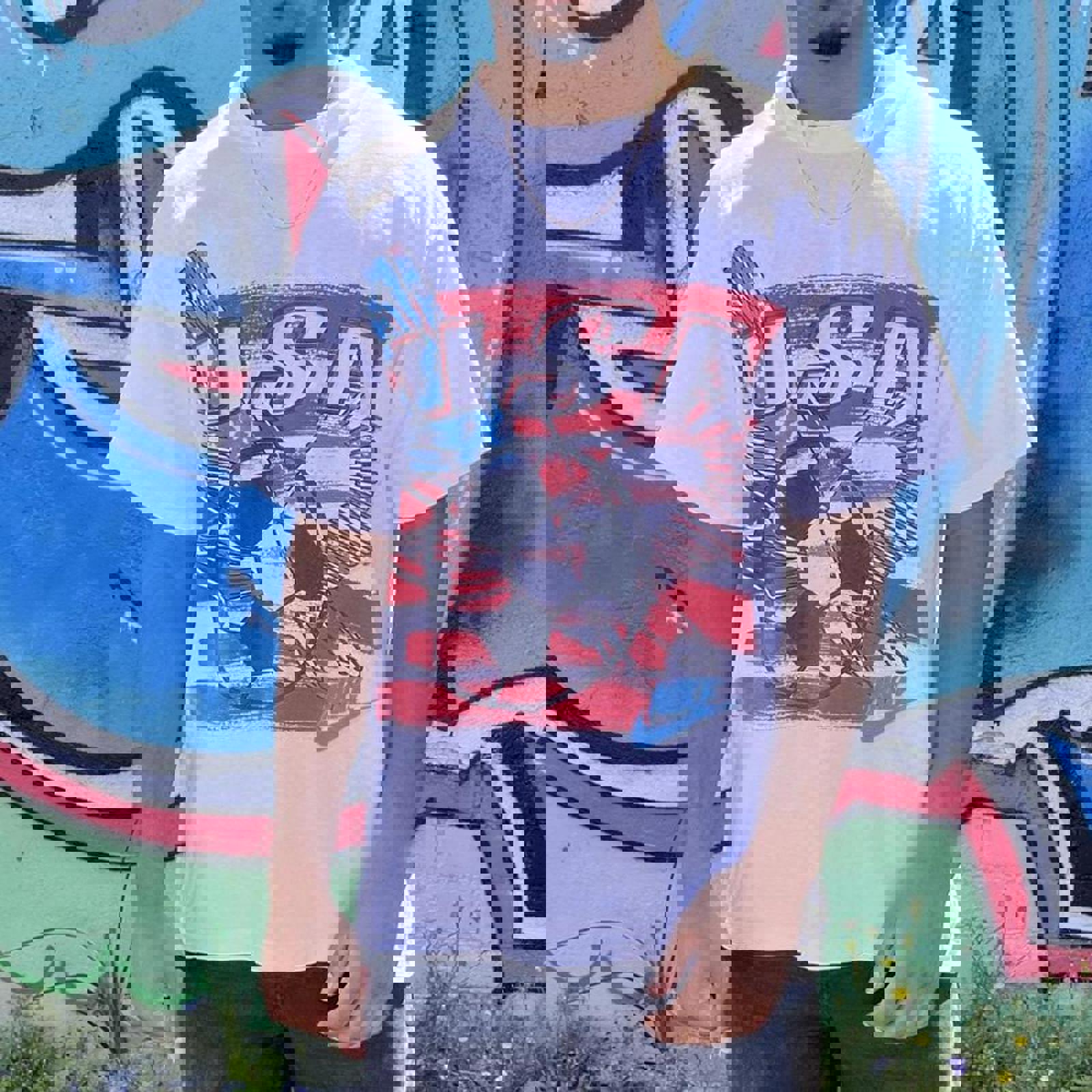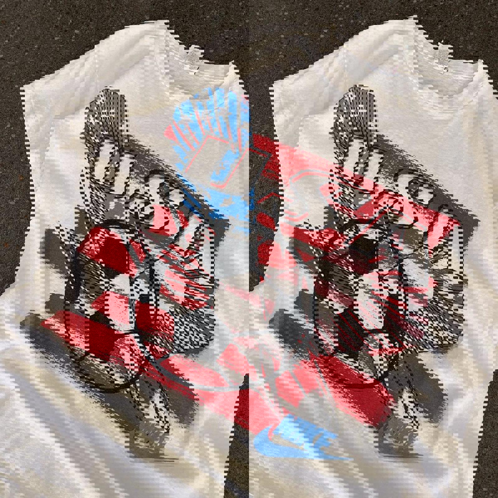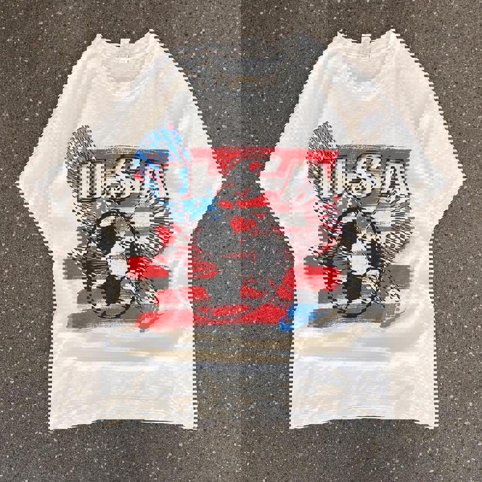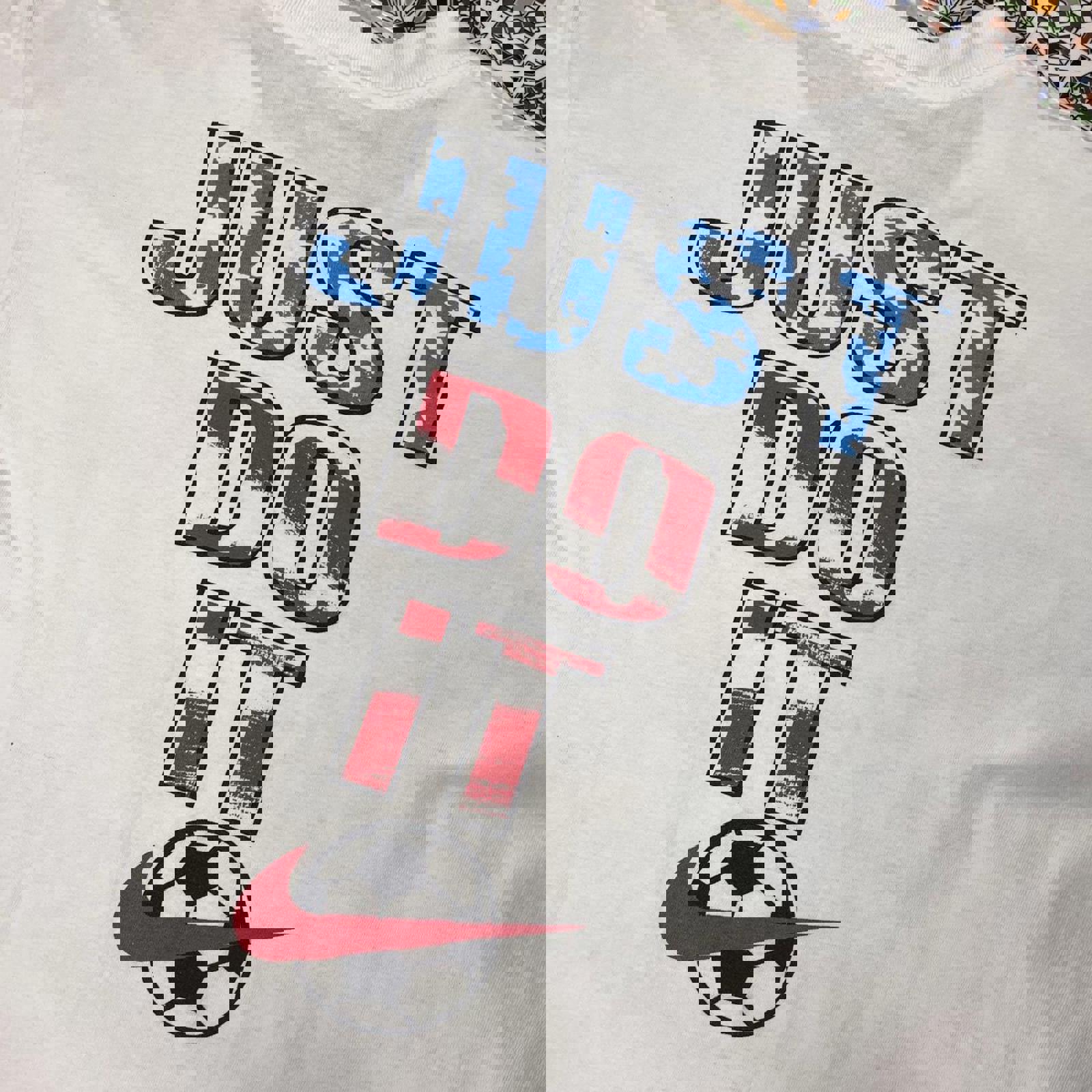 White early 90s Nike tshirt with a large red, blue and black USA football graphic on the front. With a similar schemed just do it graphic on the back