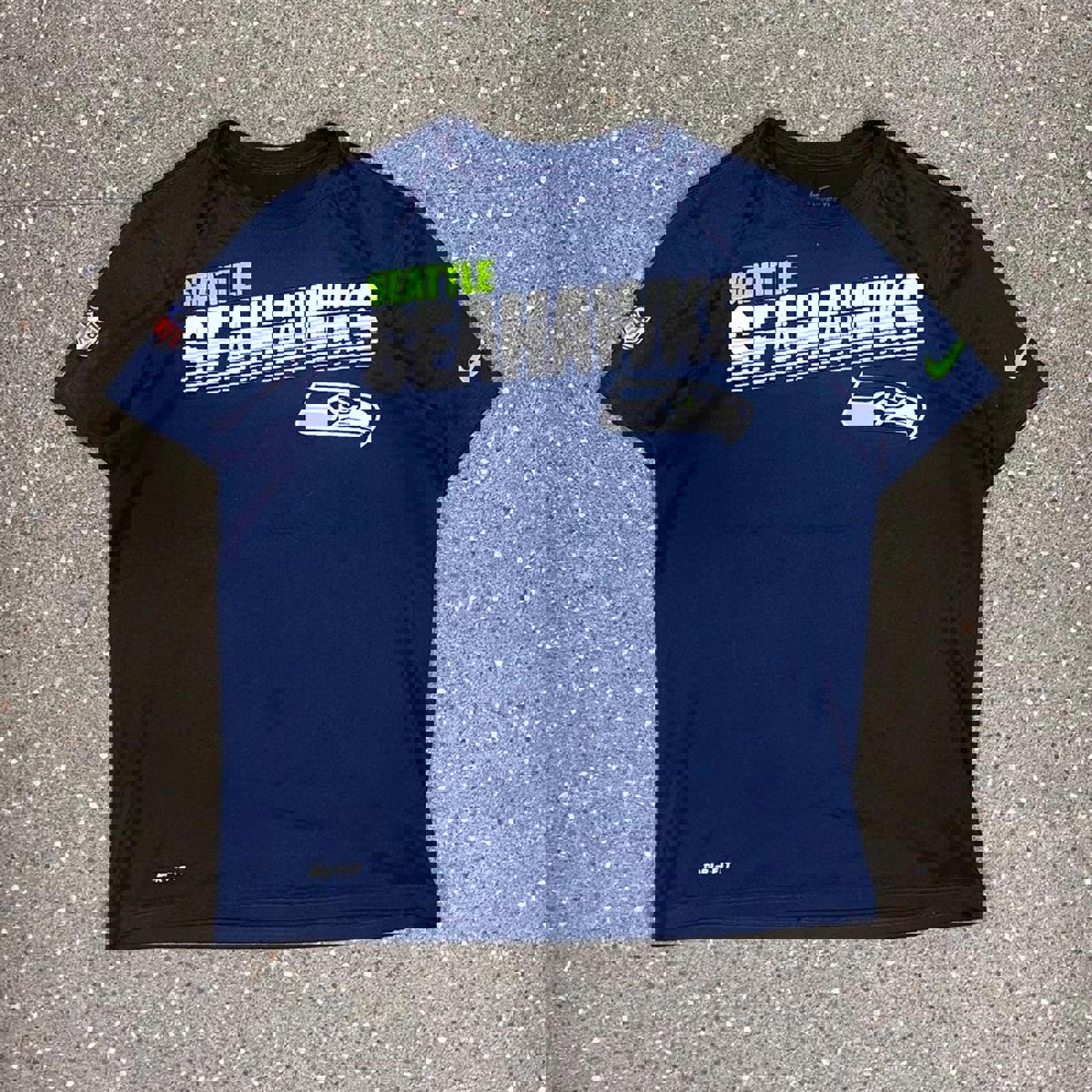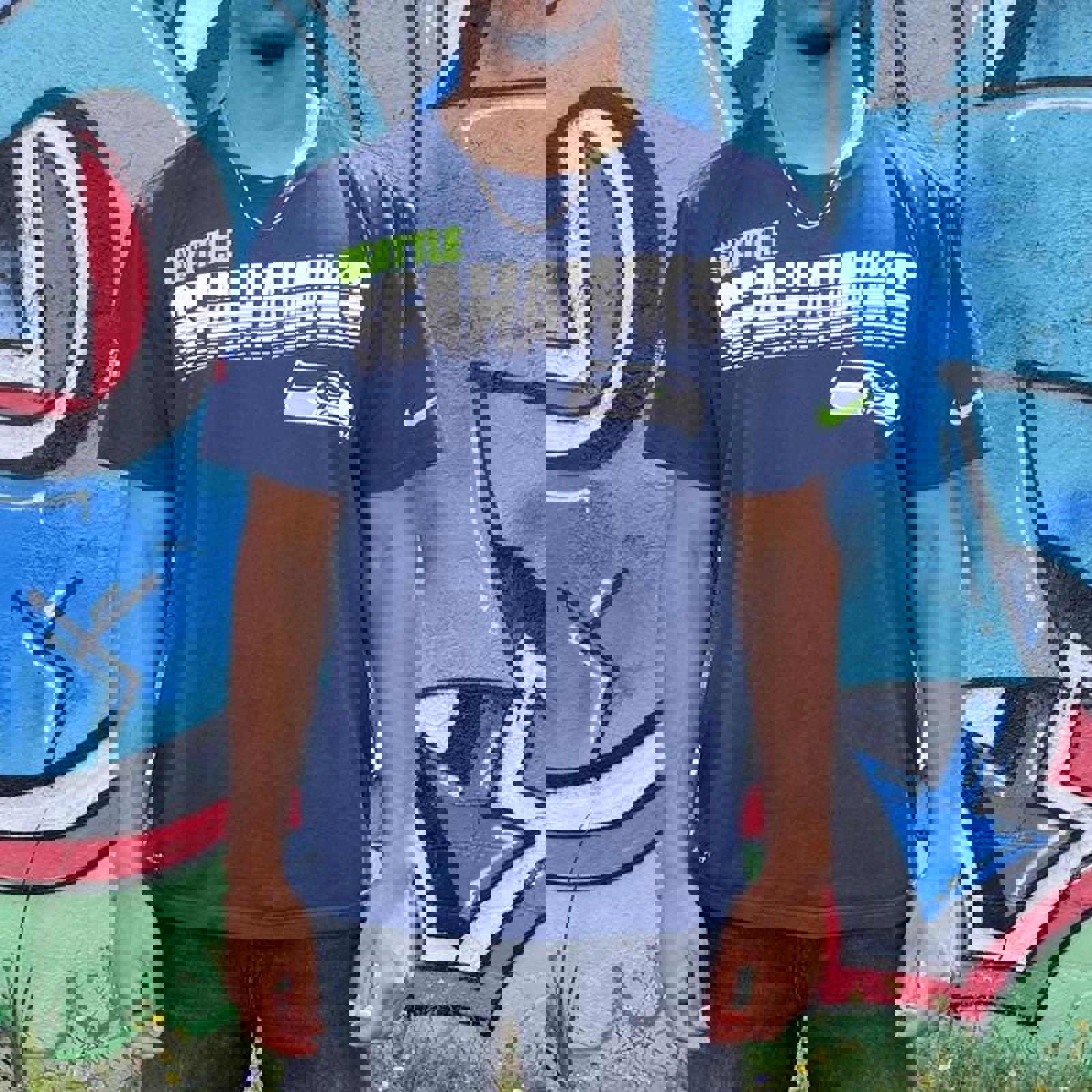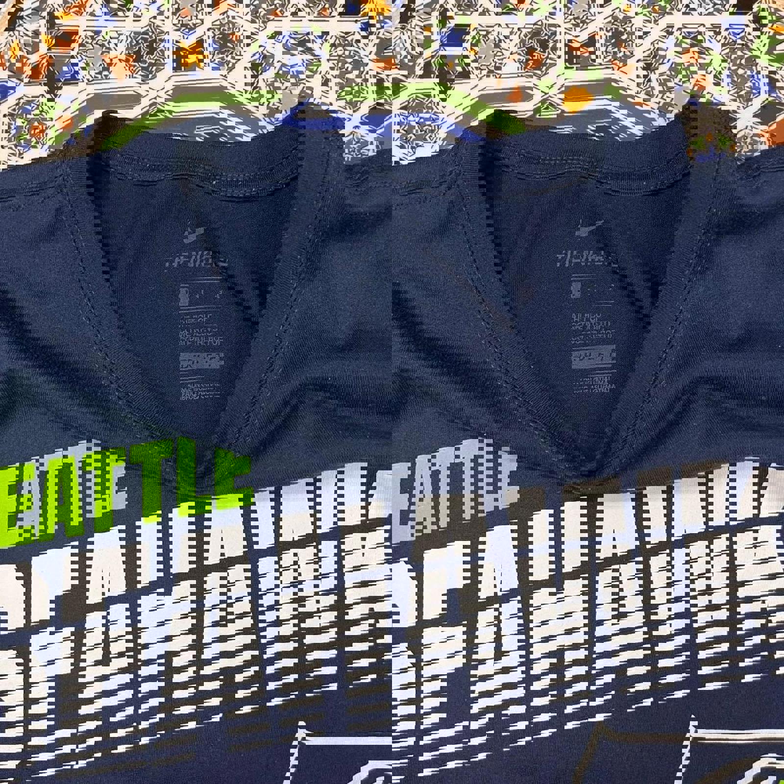 Navy Nike drifit tshirt with a white and green Seattle Seahawks graphic on the chest and Nike check on the sleeve