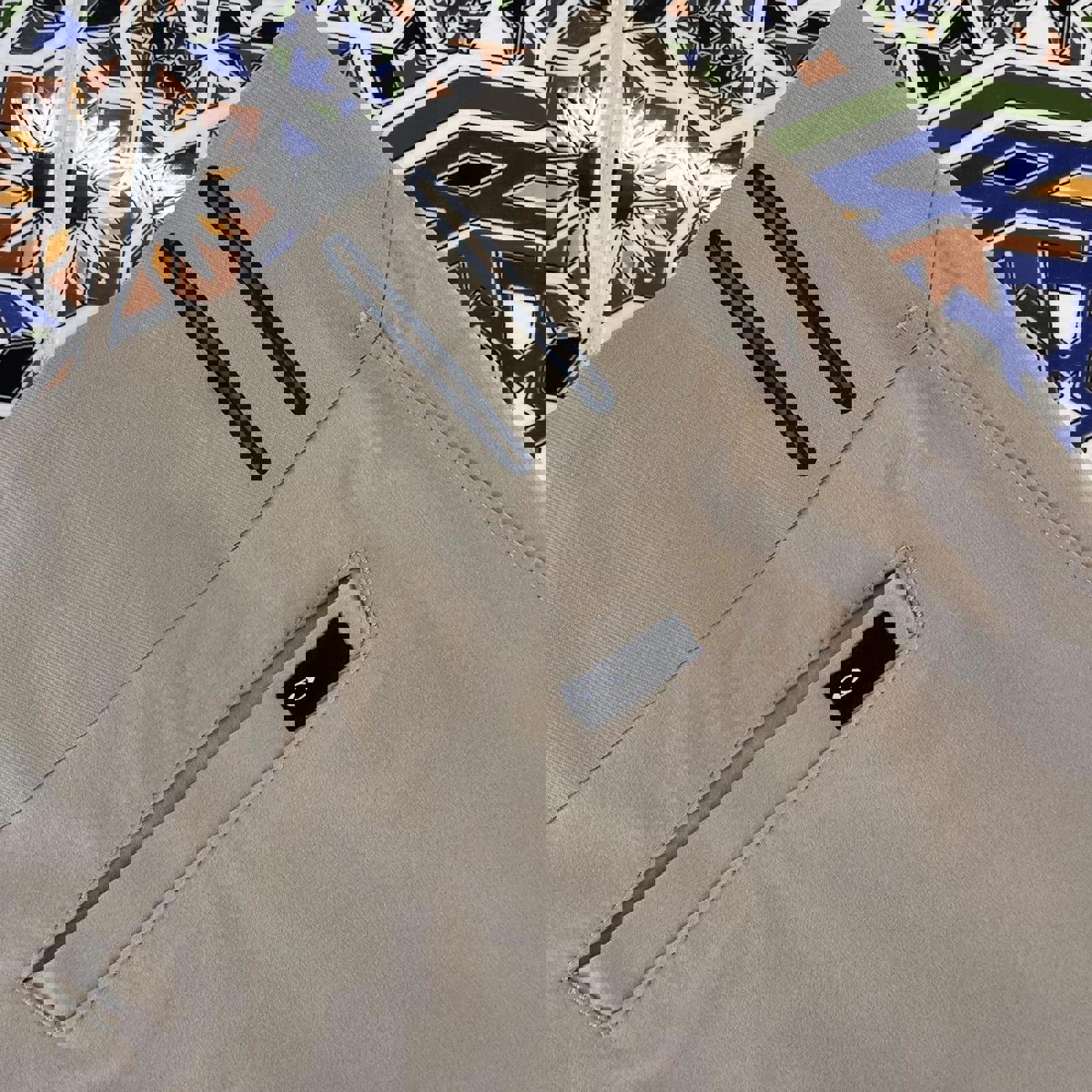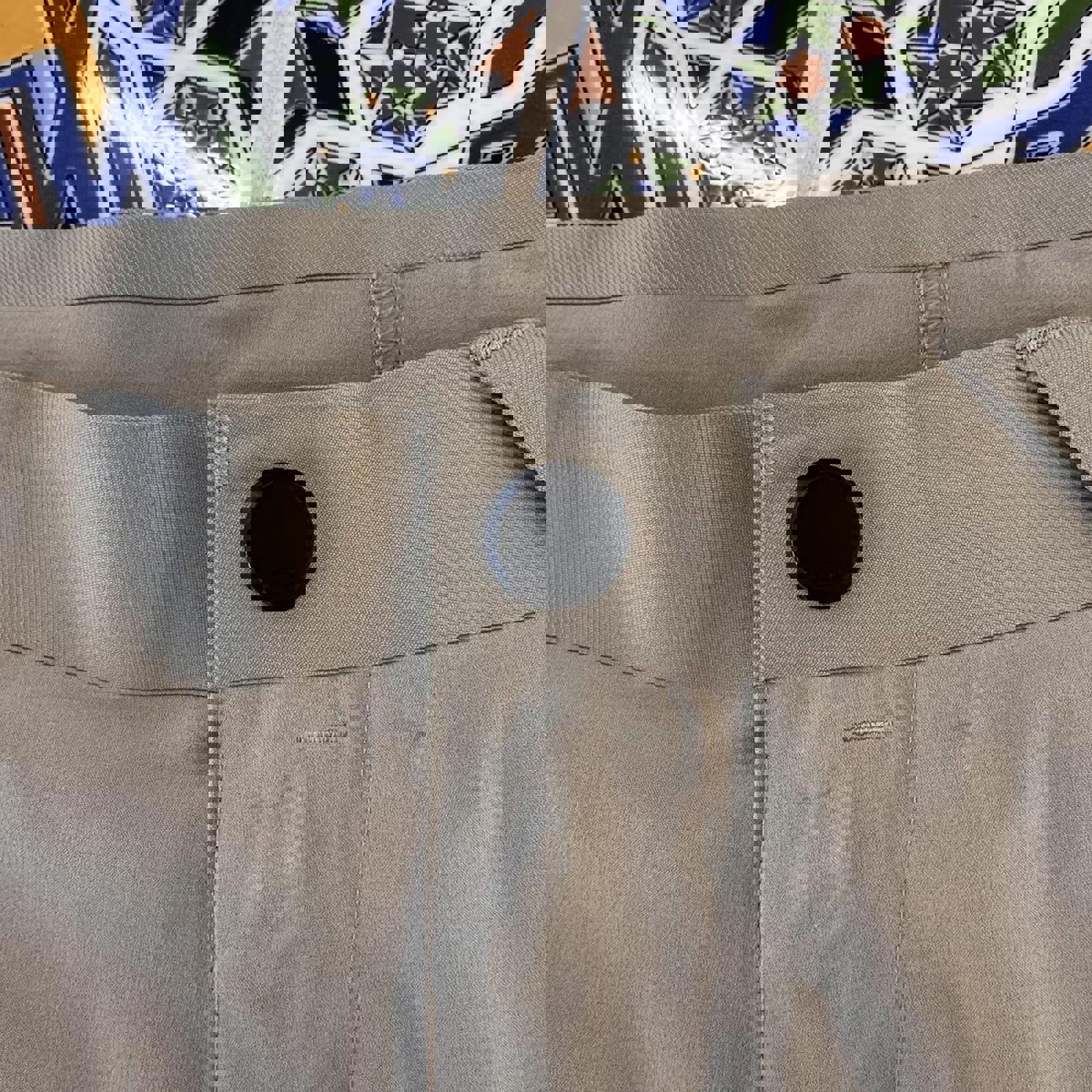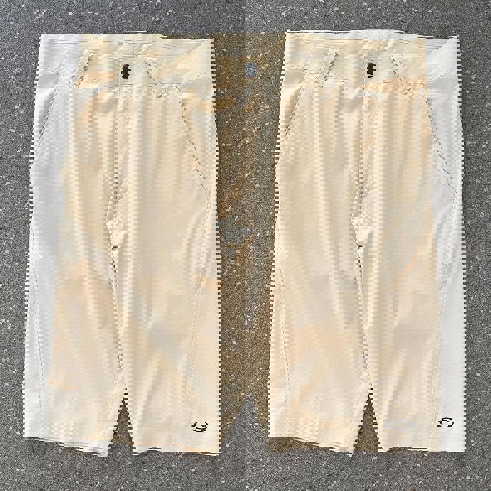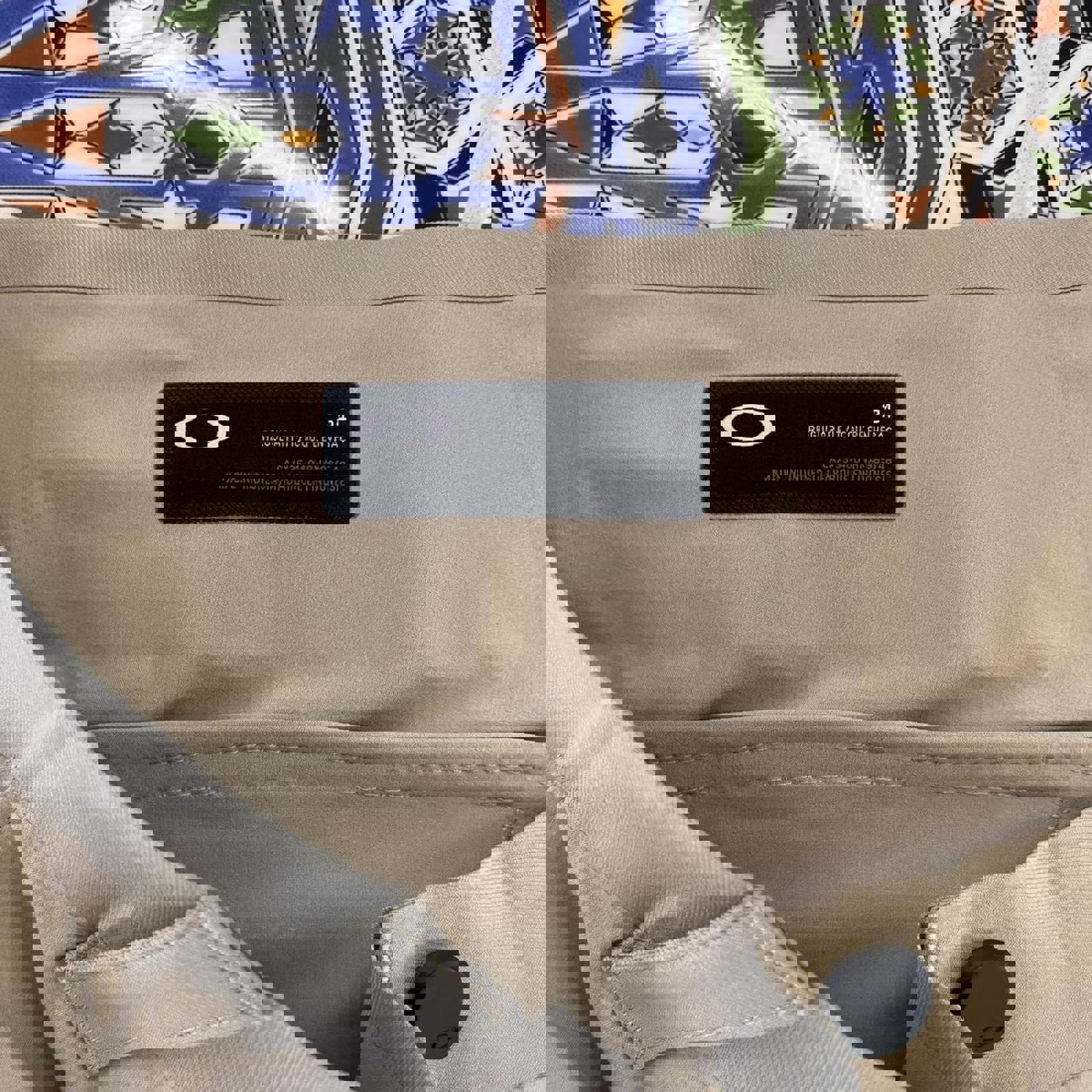 tan oakley shorts with detailed belt loops, an oakley patch on the back, an oakley logo on the front leg and a detailed button