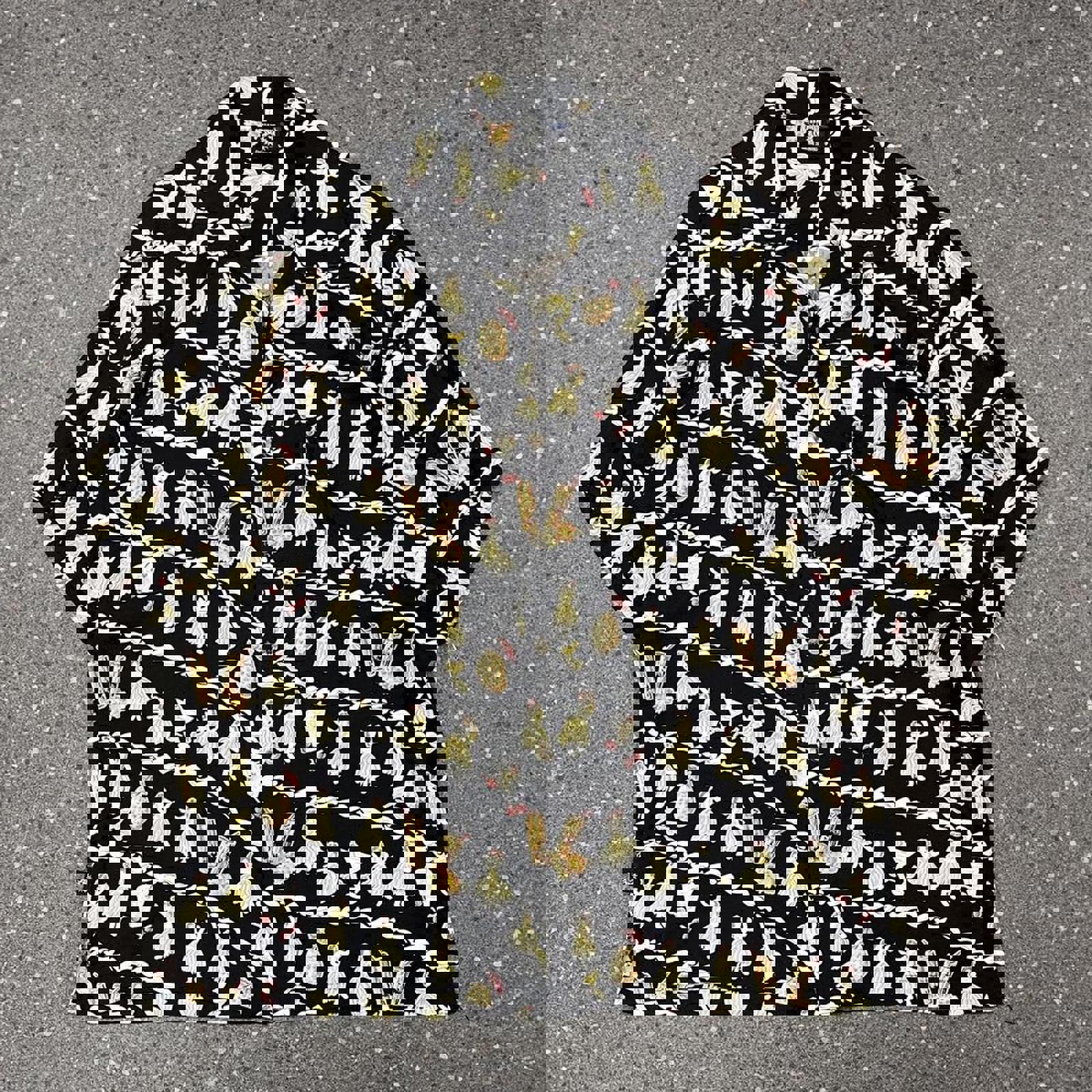 Black Hawaiian ocean motion short sleeved button up shirt with a cocktail and Hawaiian dancer all over print