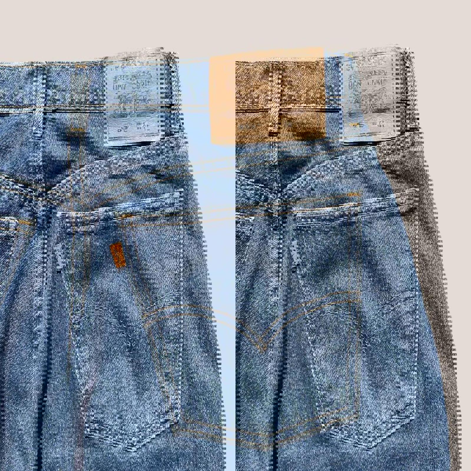 655 orange tab levis in a light blue with a contrasting tan patch on the back hip and orange tab
