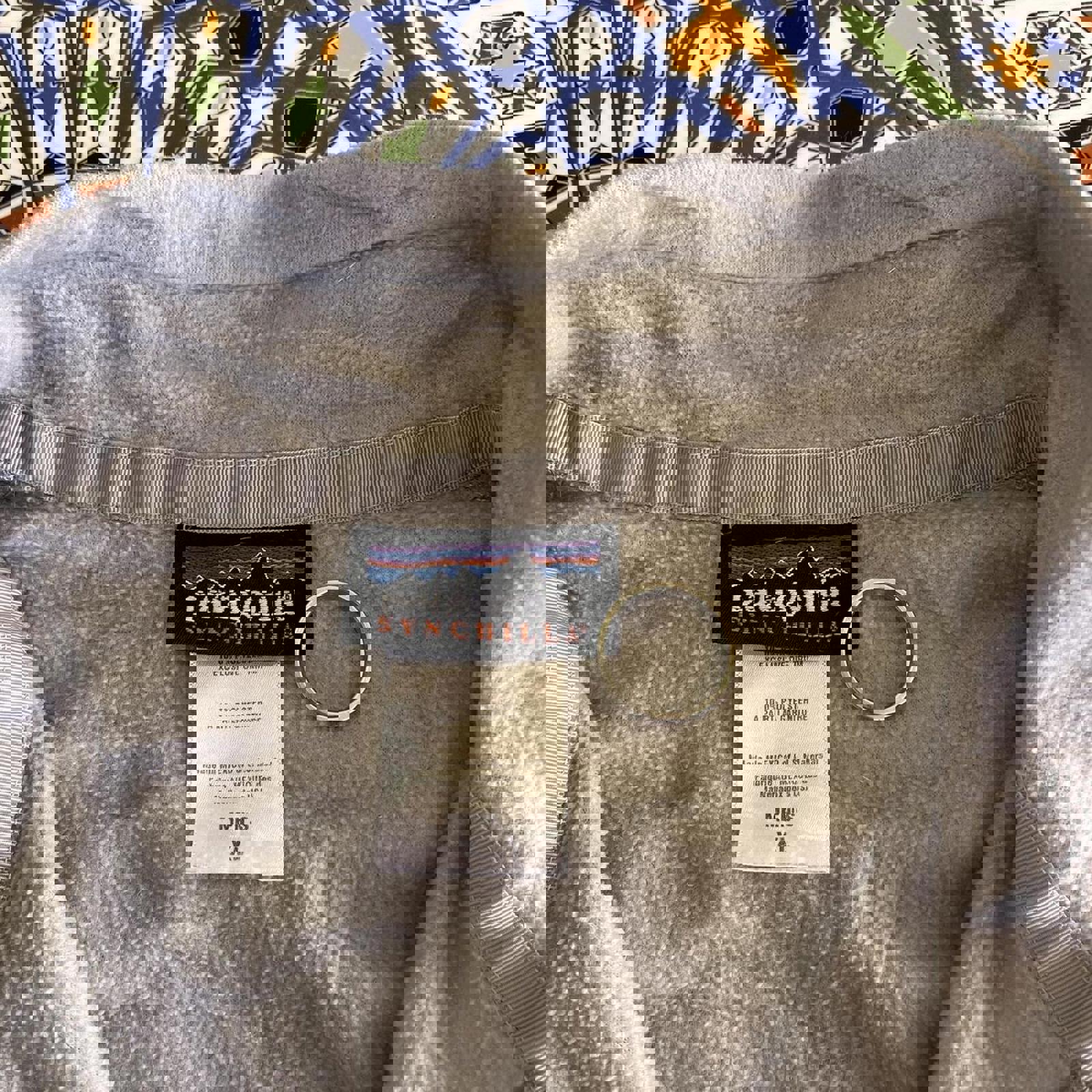 grey patagonia fleece jumper with small embroidered patagonia spellout on the chest