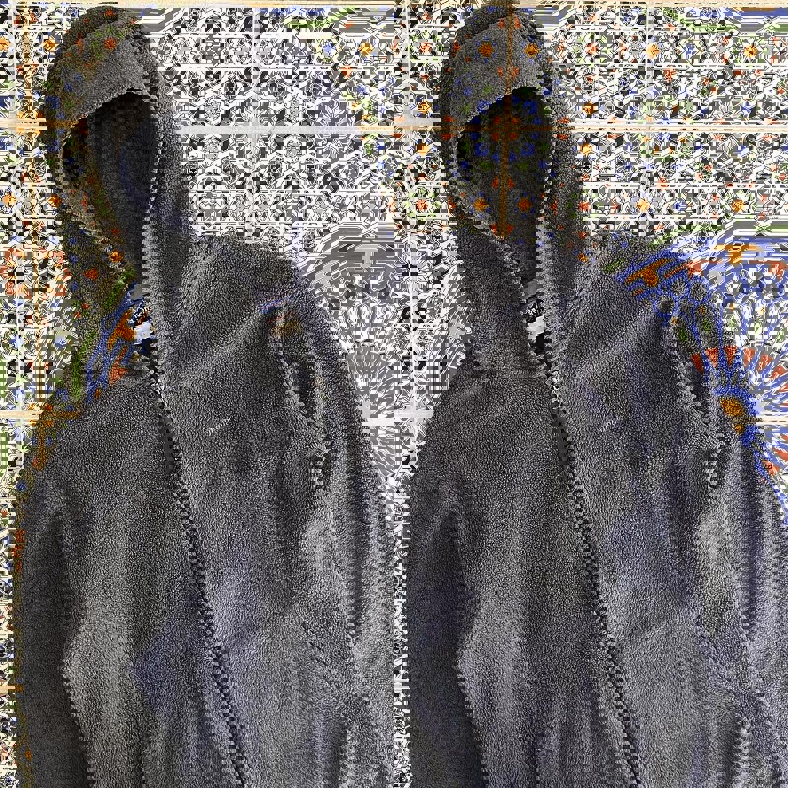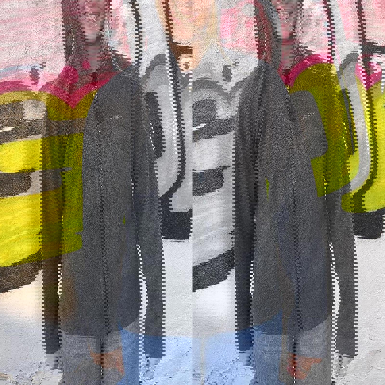 charcoal grey Patagonia fleece hoodie with an embroidered Patagonia spell out on the chest