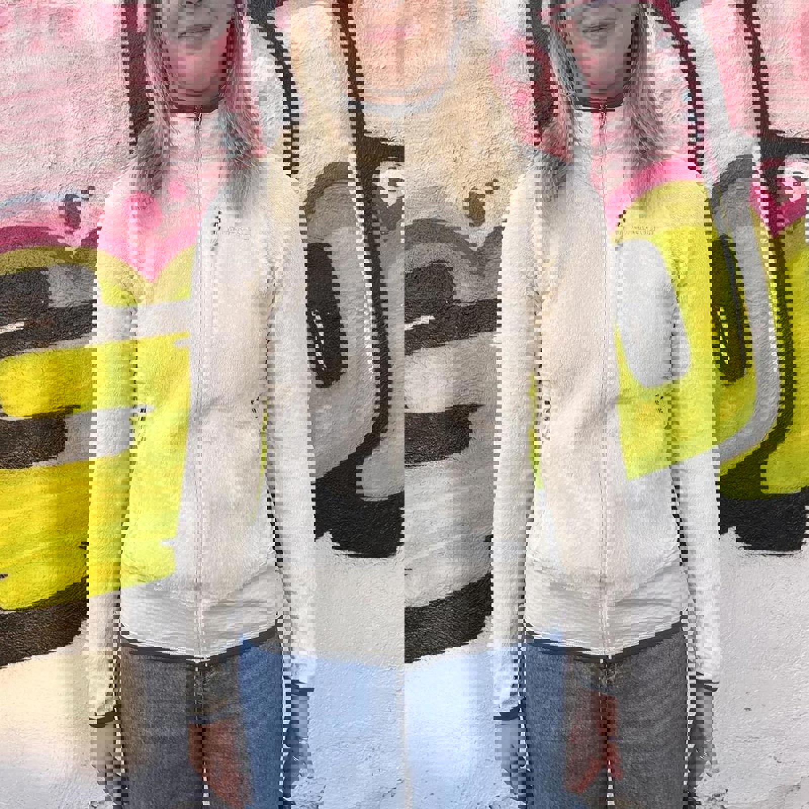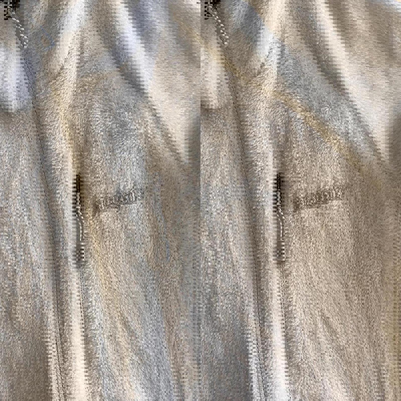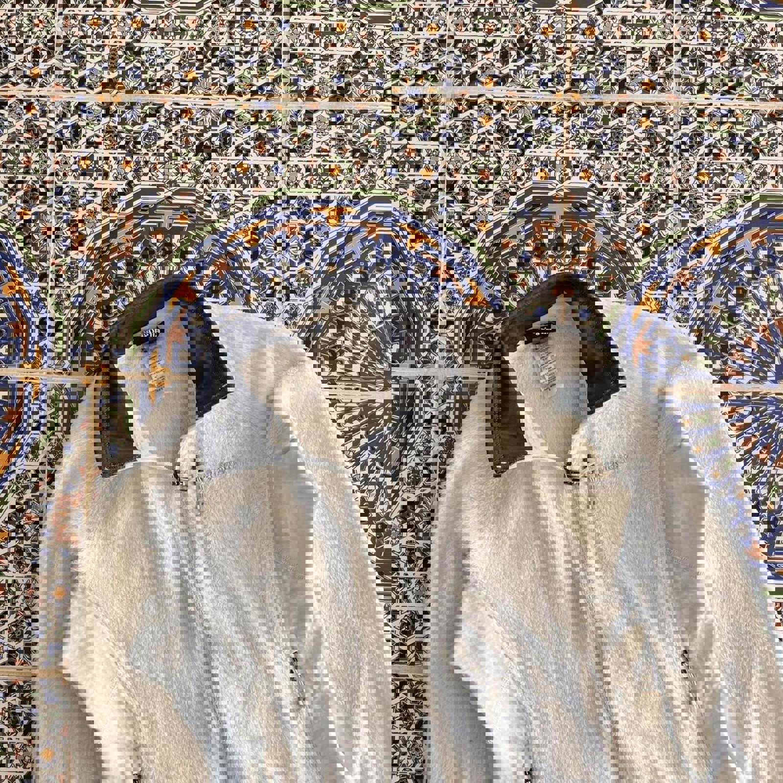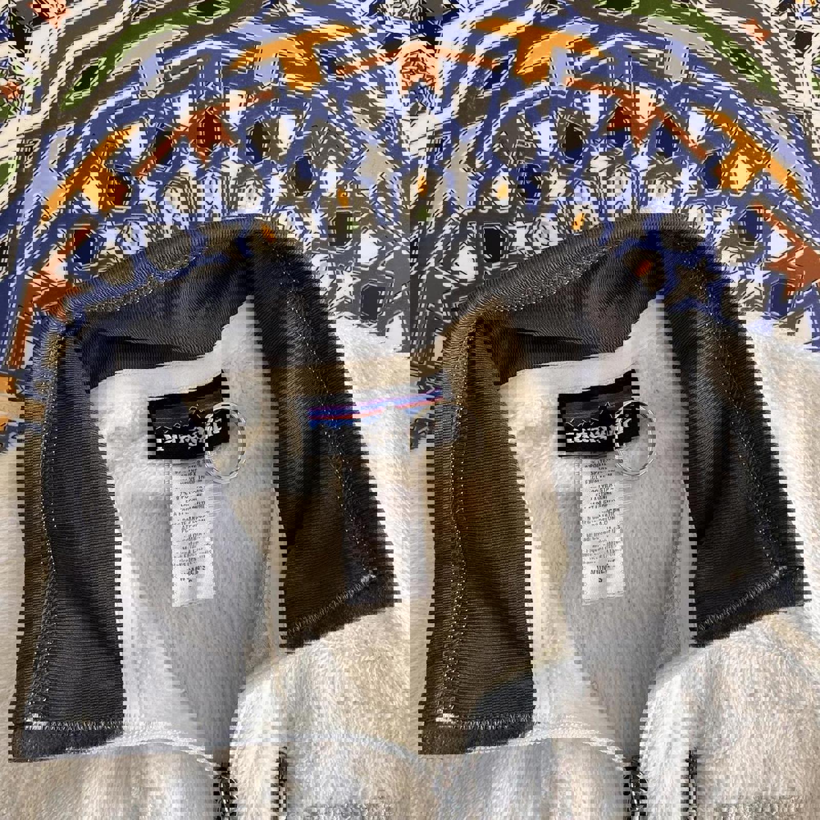 white fleece Patagonia sweater jacket with zip-able pockets on the sizes and chest, grey embroidered Patagonia spell out on the chest and dark grey accents on the collar and cuffs