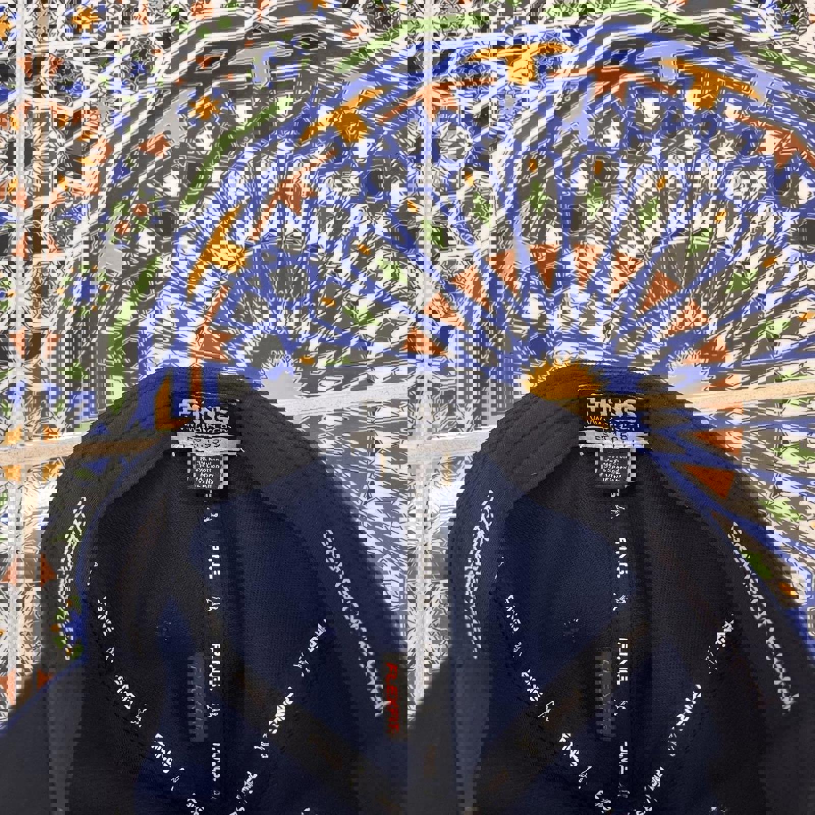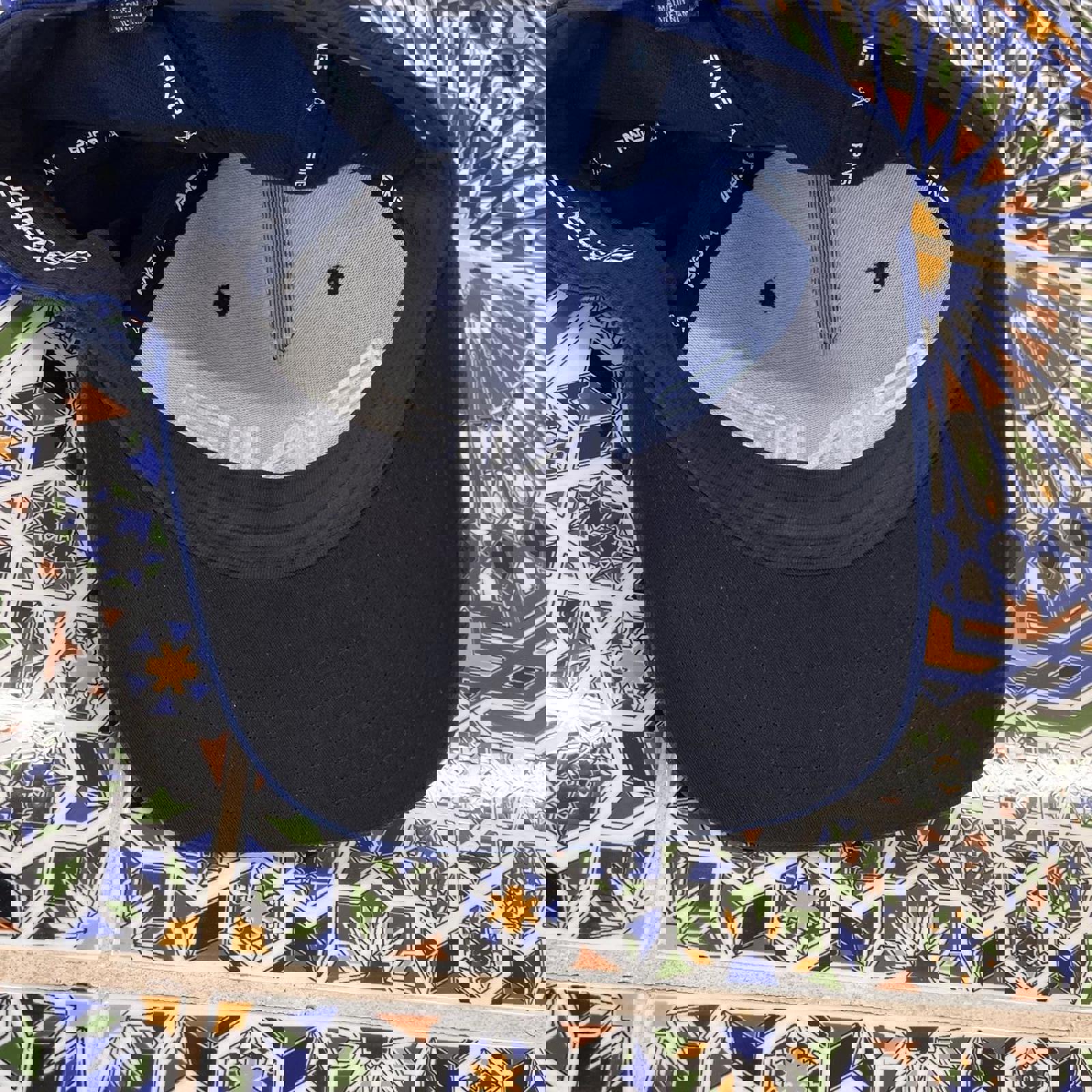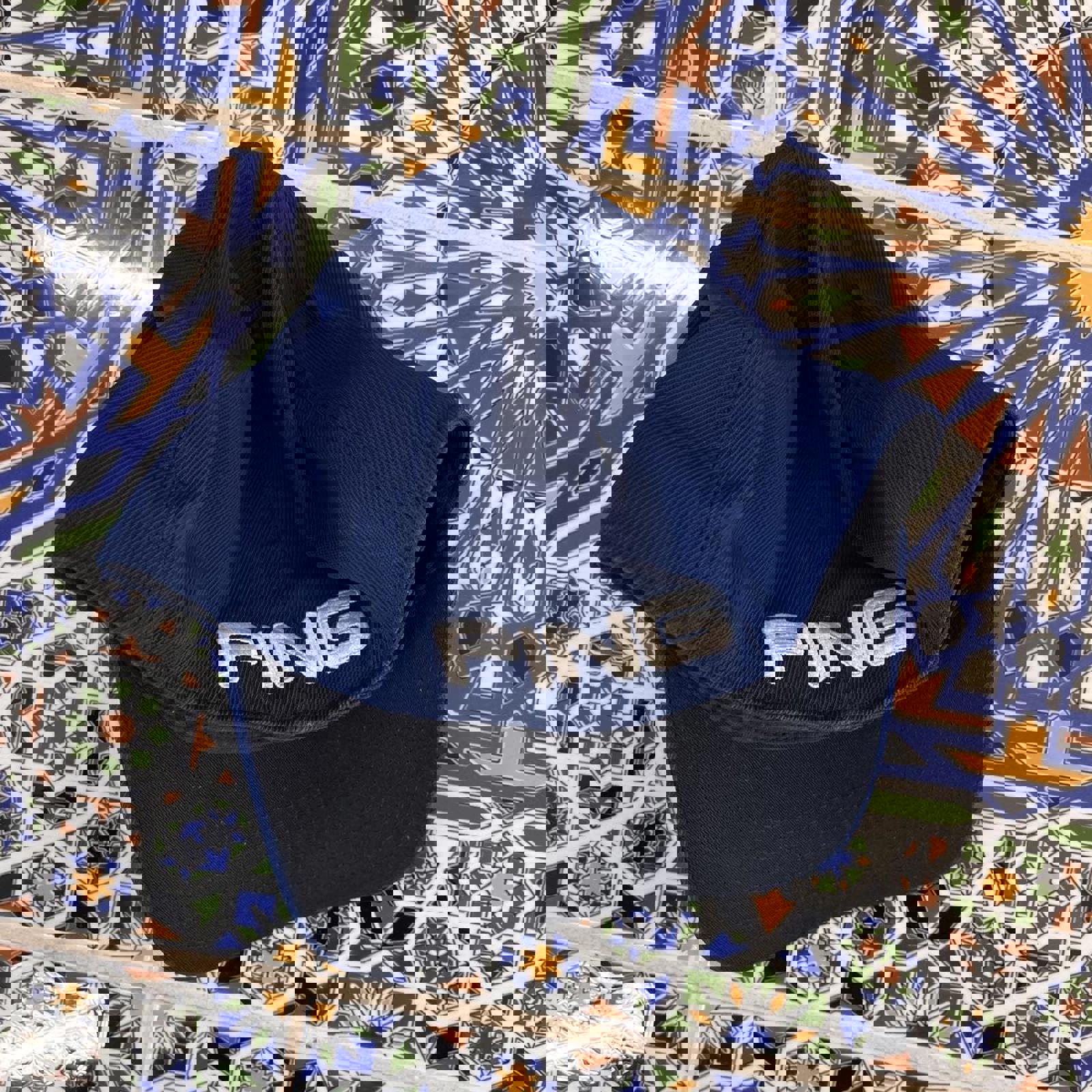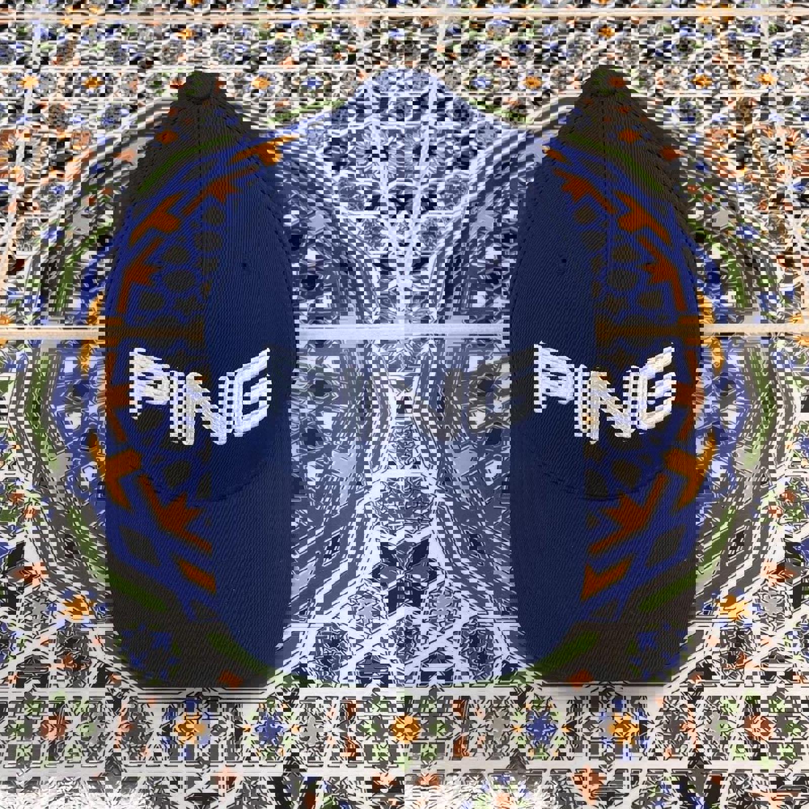 Navy ping hat with a black under brim and embroidered white ping spell outs on the front and back