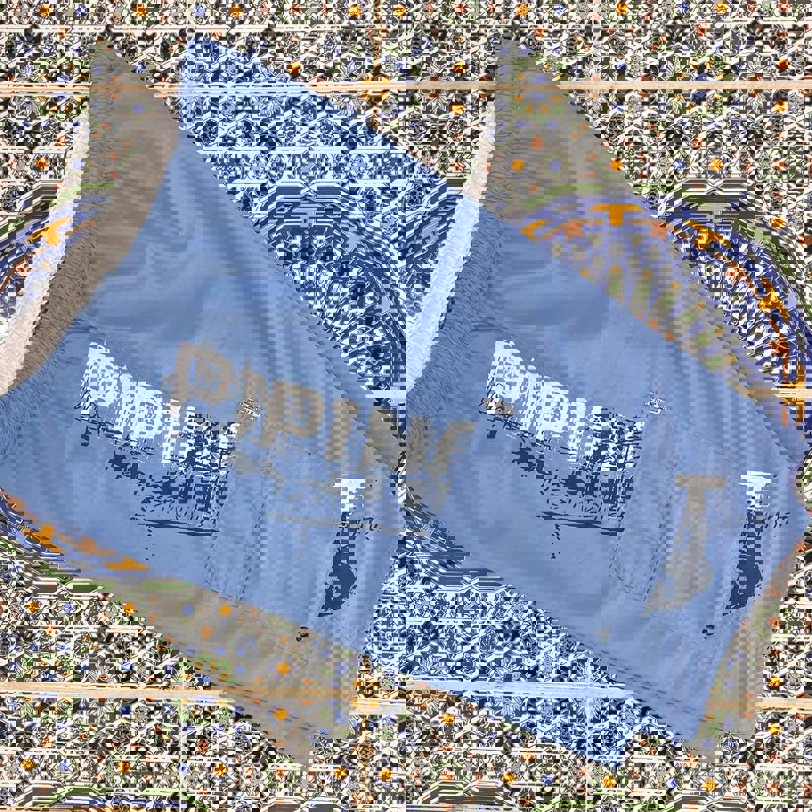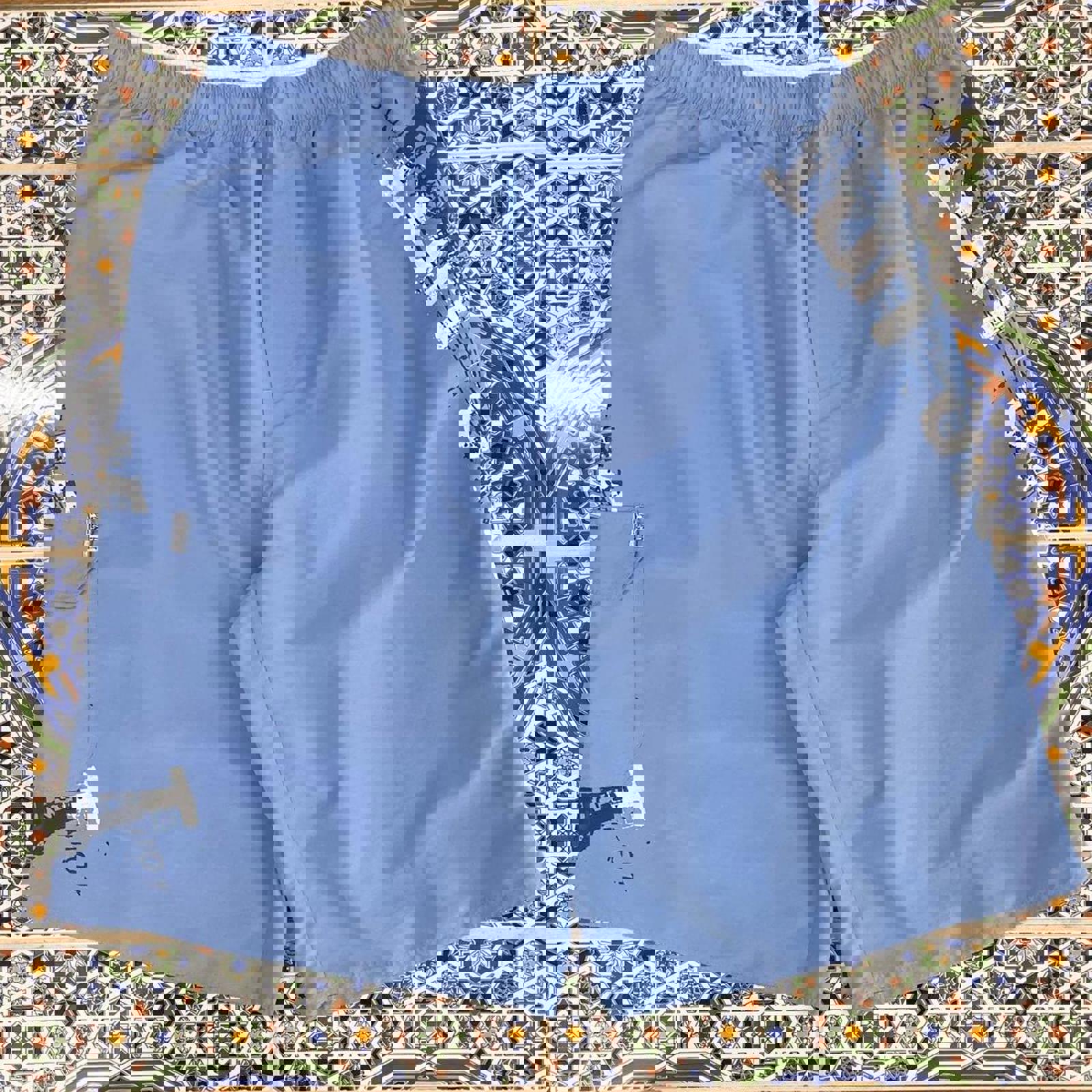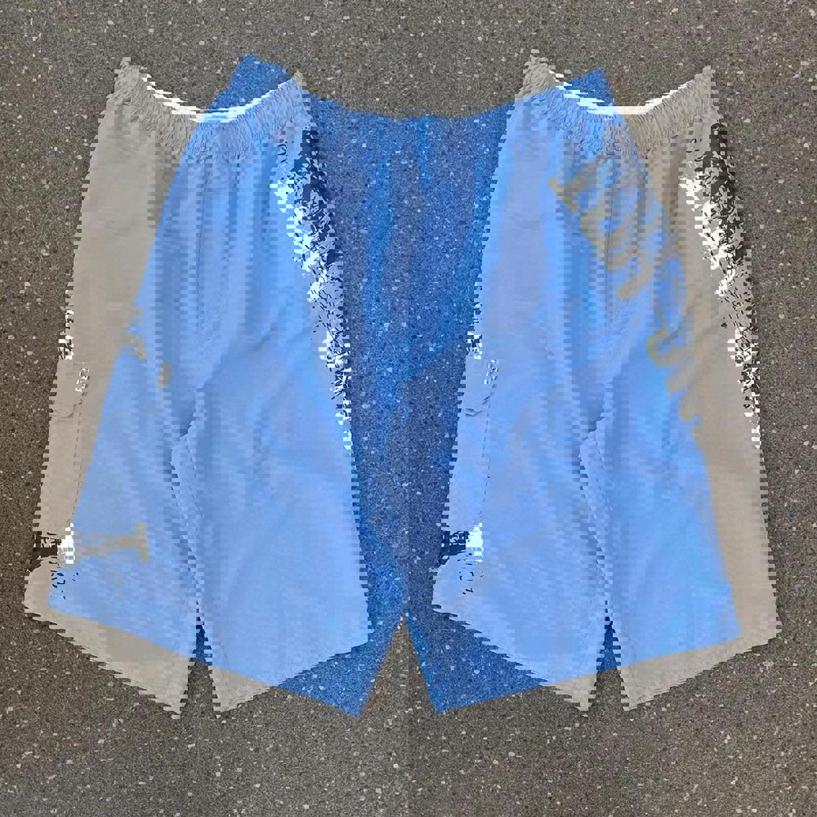 Baby blue piping hot board shorts with black and white graphics down both legs