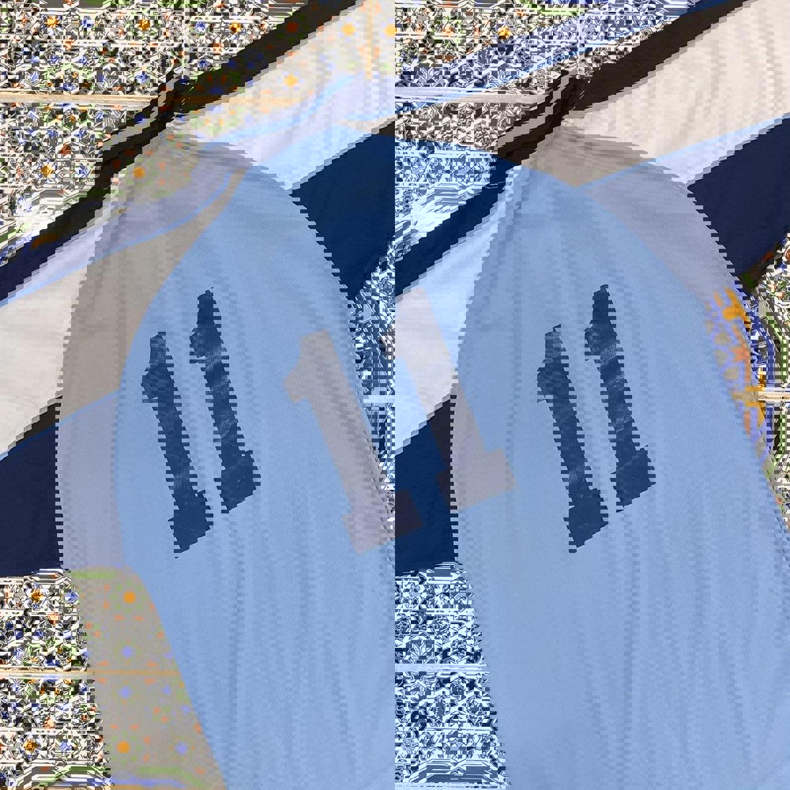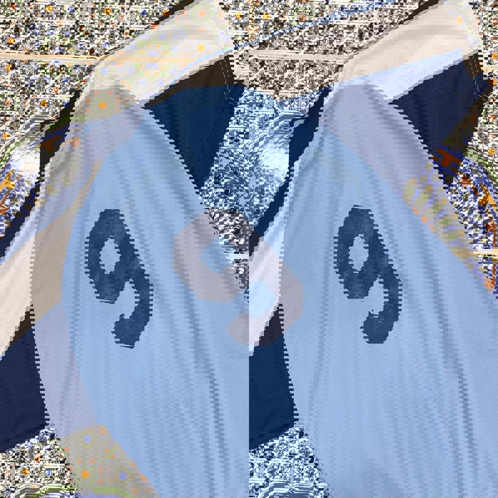 White, navy and baby blue vintage plain soccer jersey with number 9 or 11 on the back