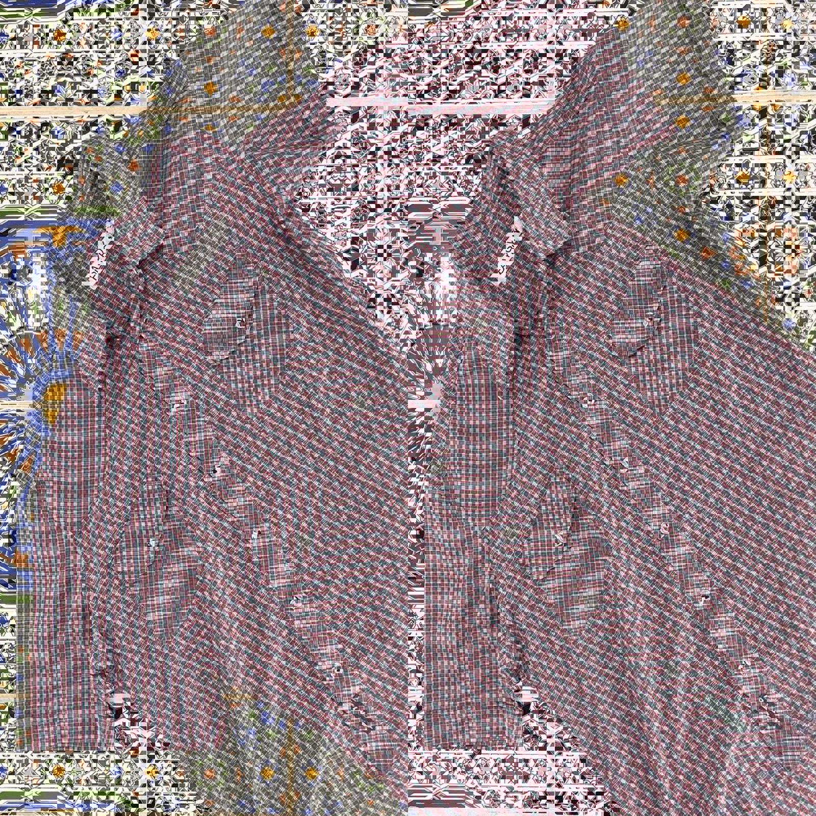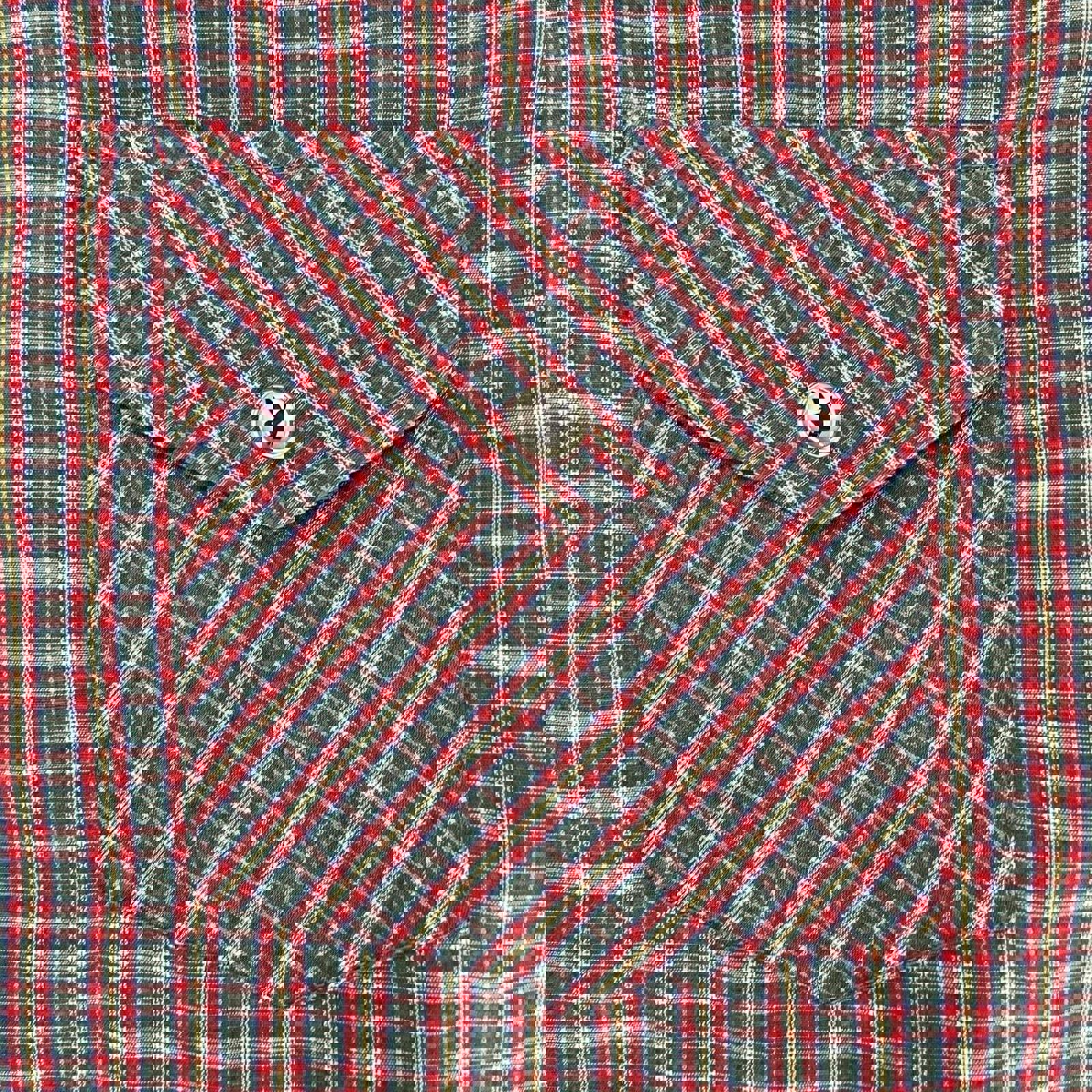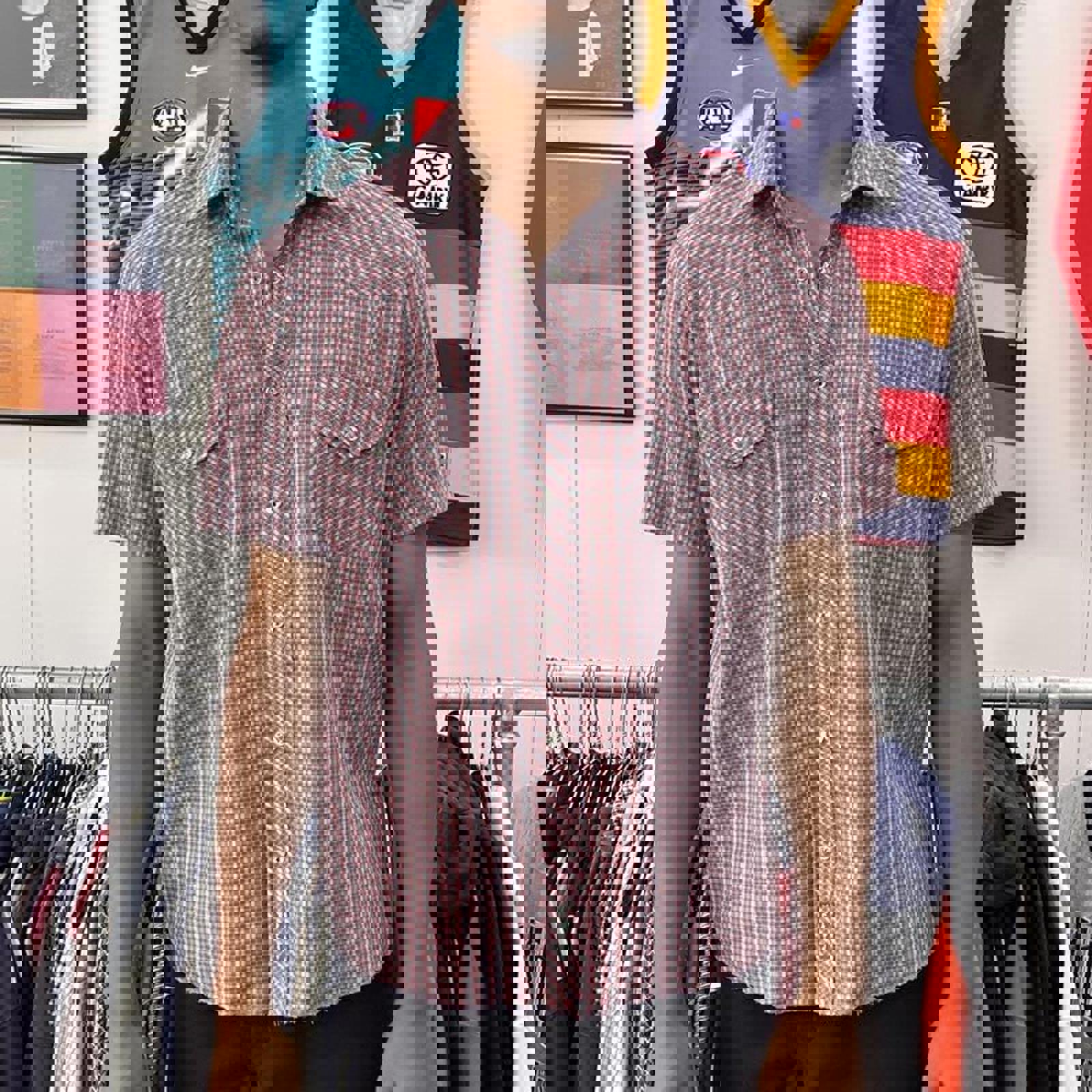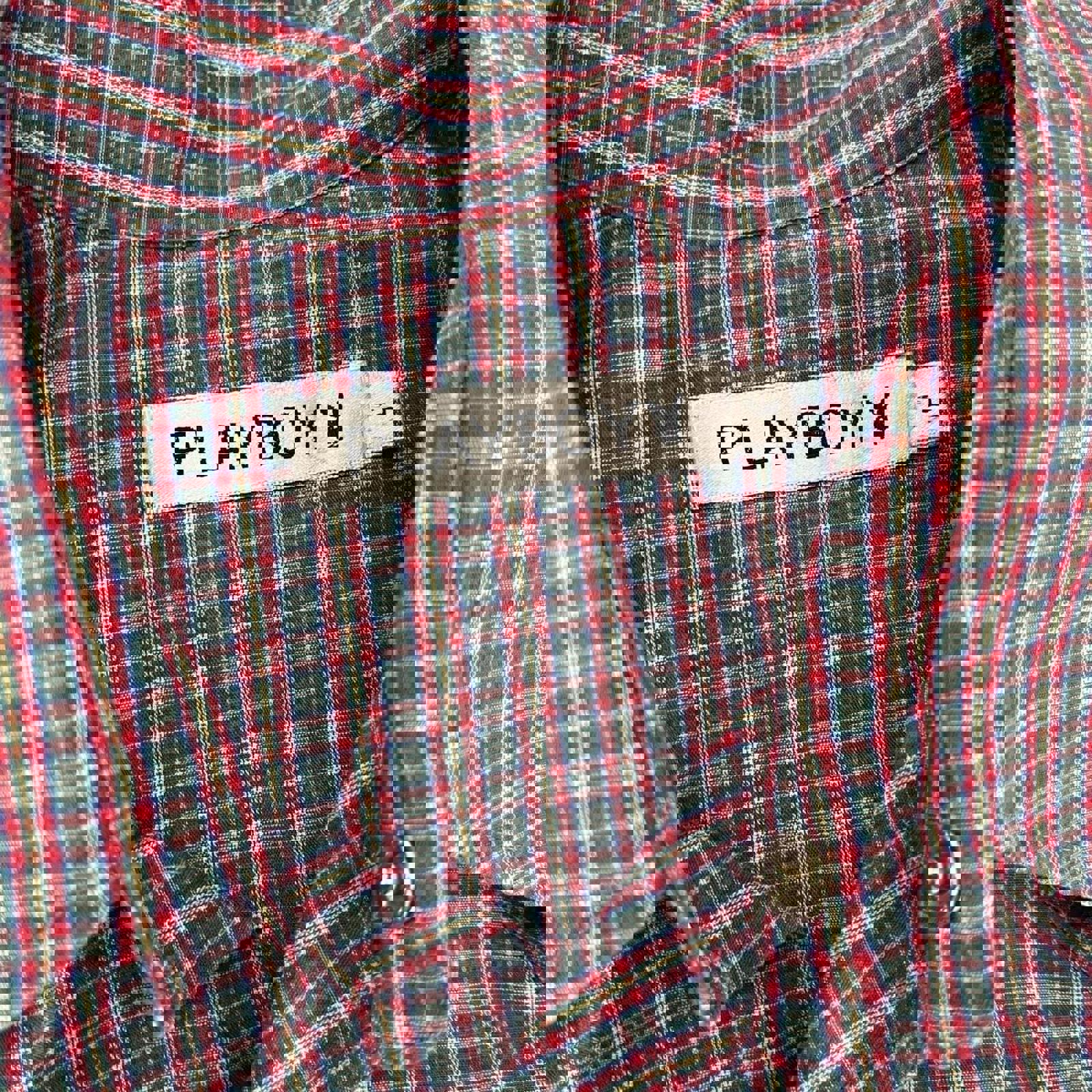 red, baby blue, white and green playboy short sleeved button up shirt with detailed buttons and a patch on the lower hip
