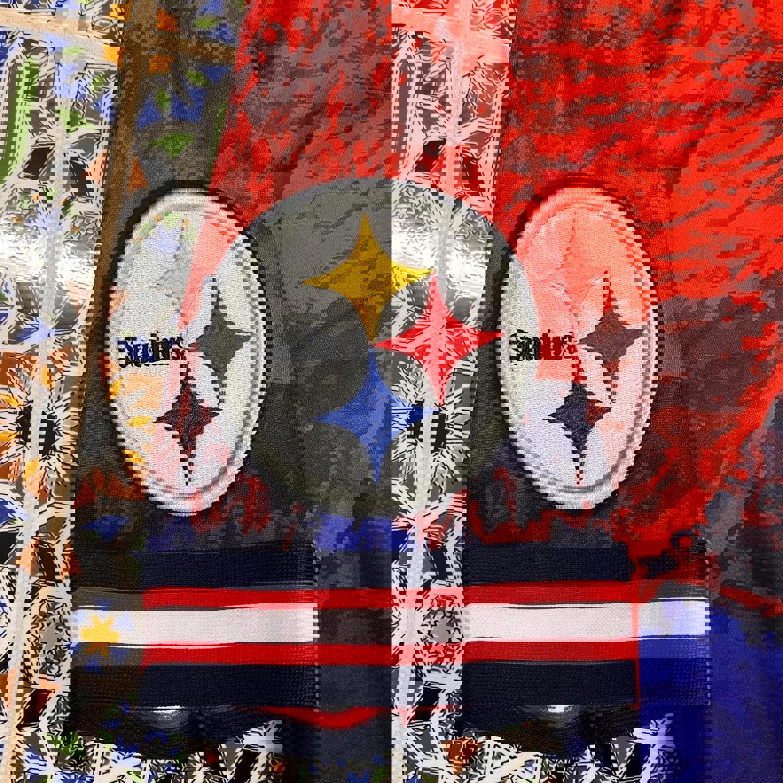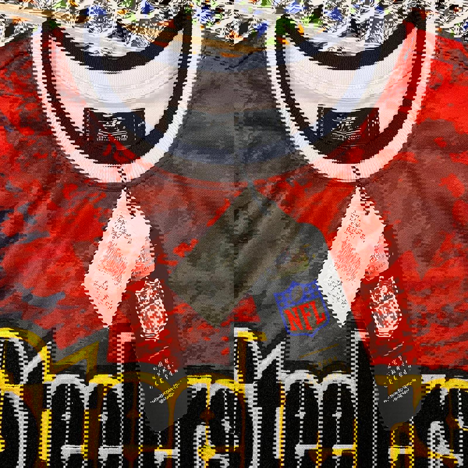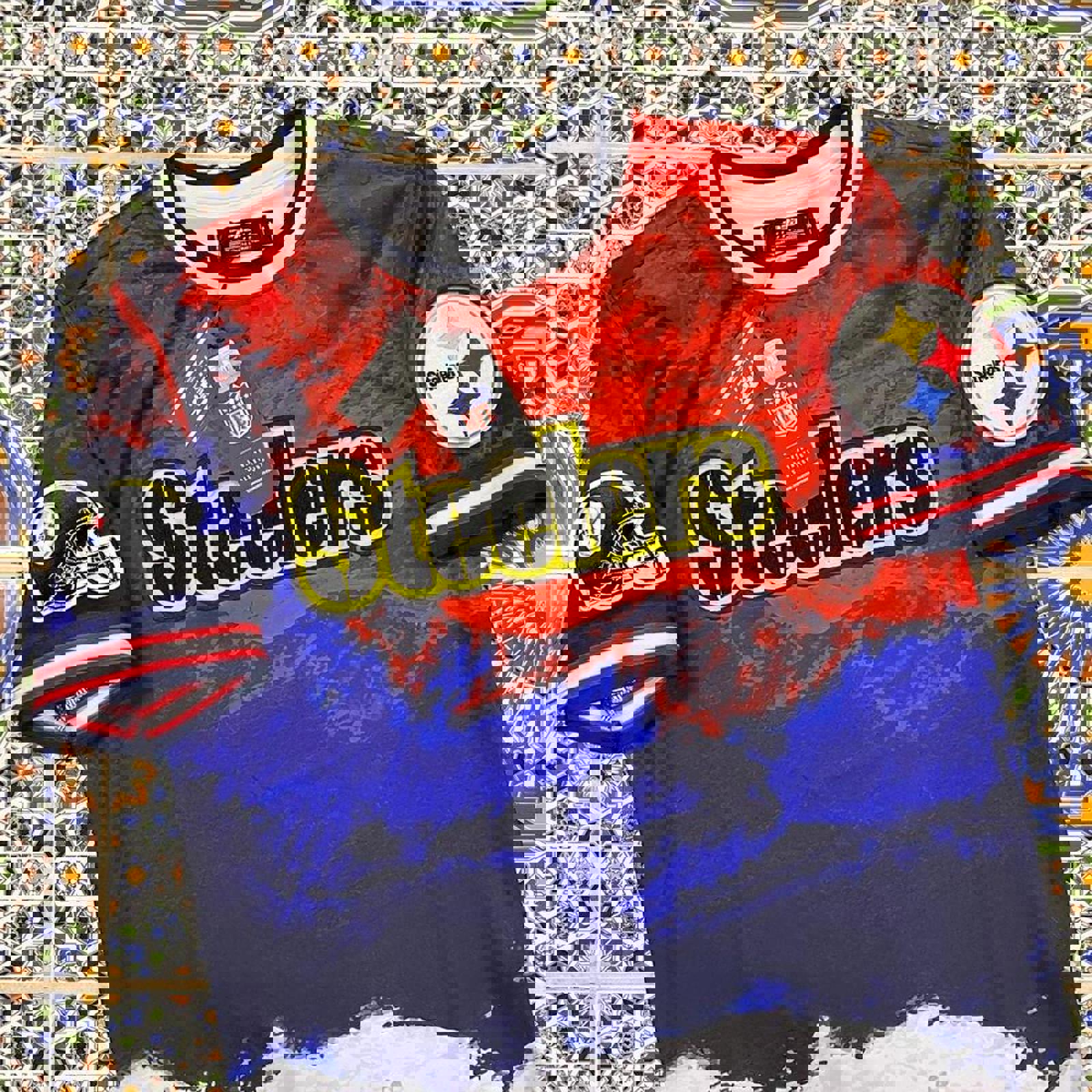 Red, two tone blue, black, white and yellow Steelers pro station jersey with large patches on the sleeves and embroidered Steelers on the front