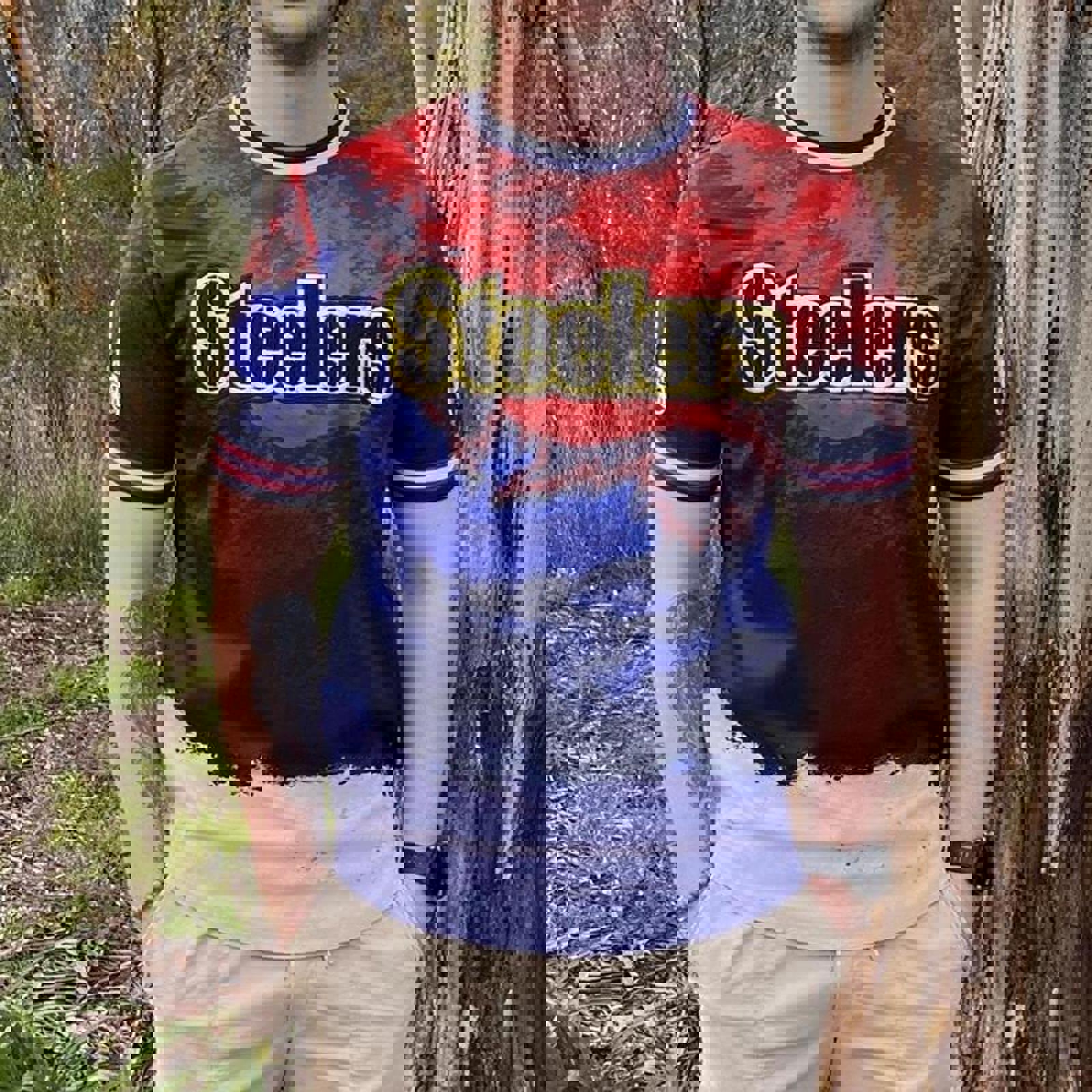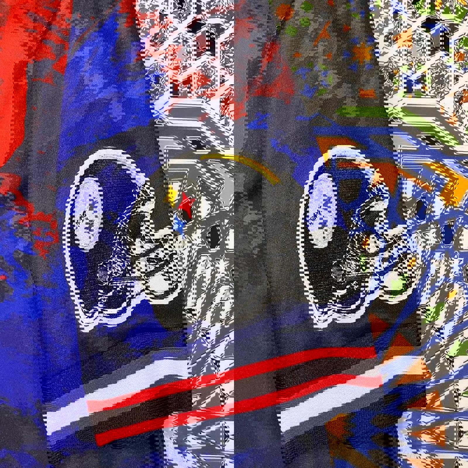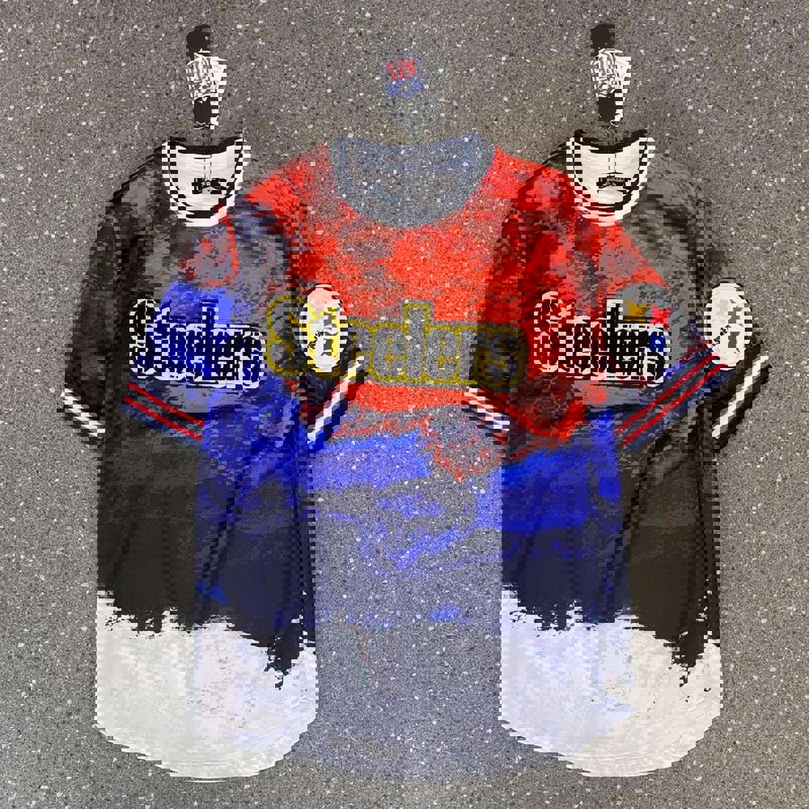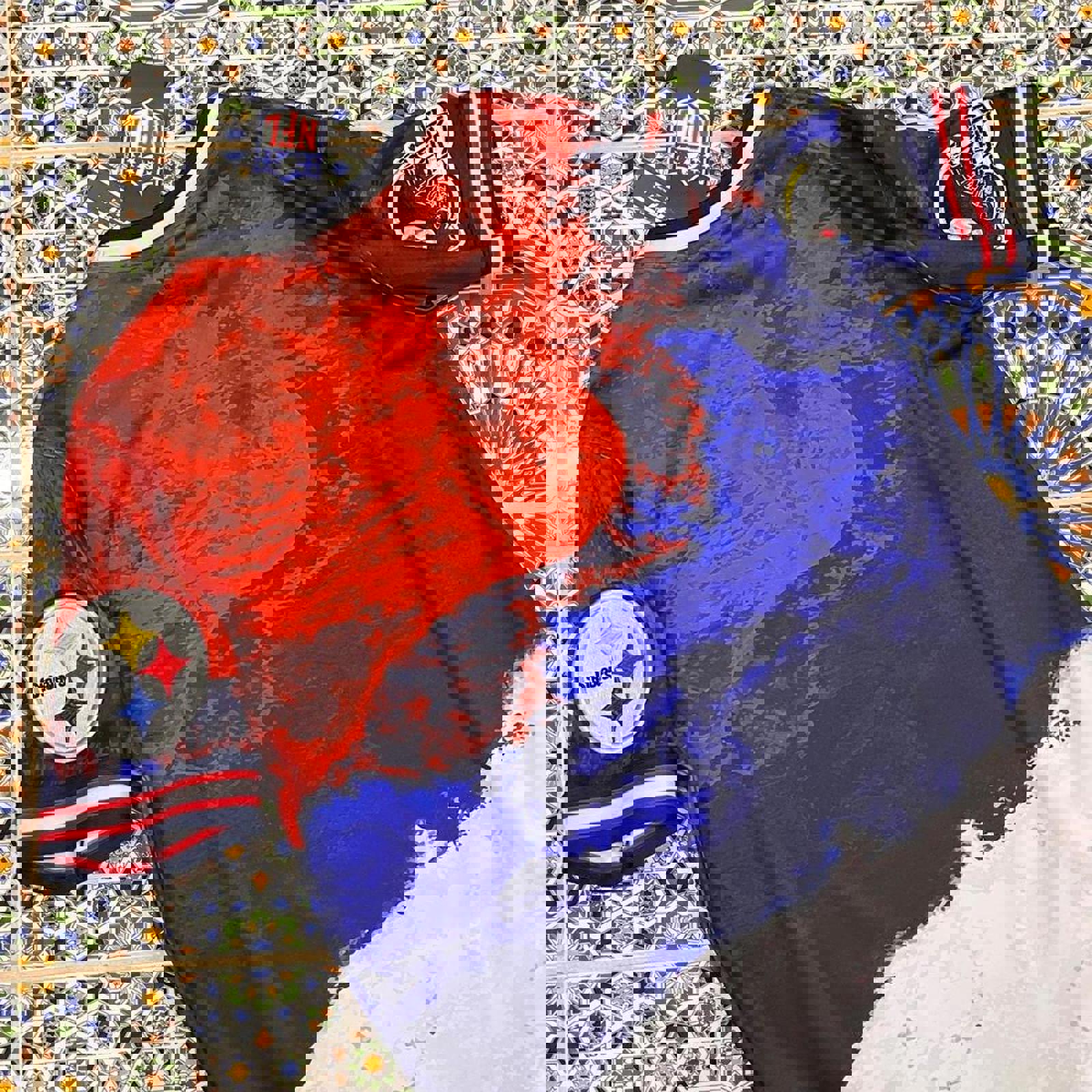 Red, two tone blue, black, white and yellow Steelers pro station jersey with large patches on the sleeves and embroidered Steelers on the front