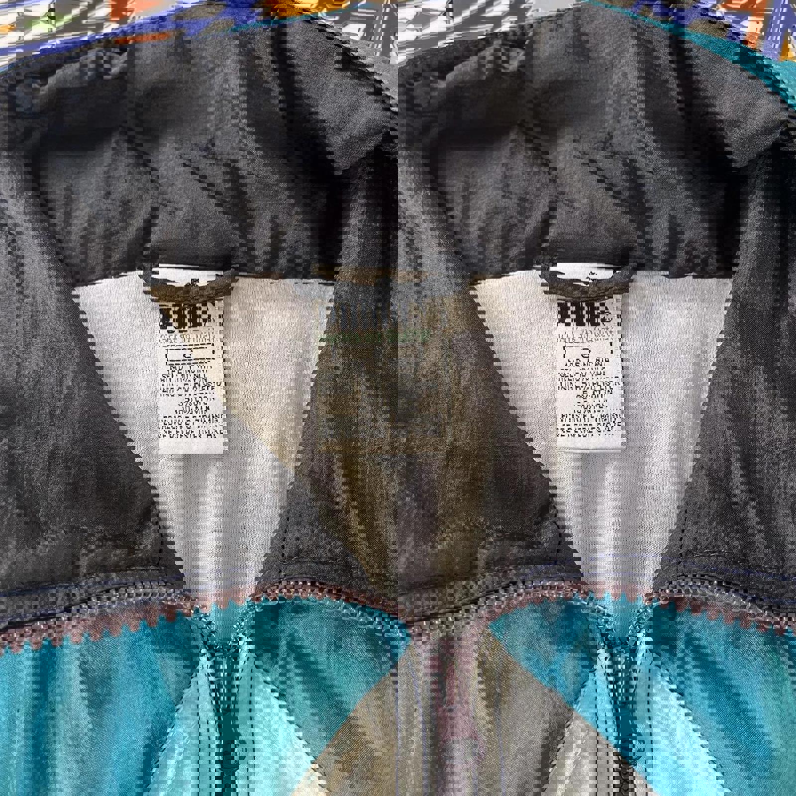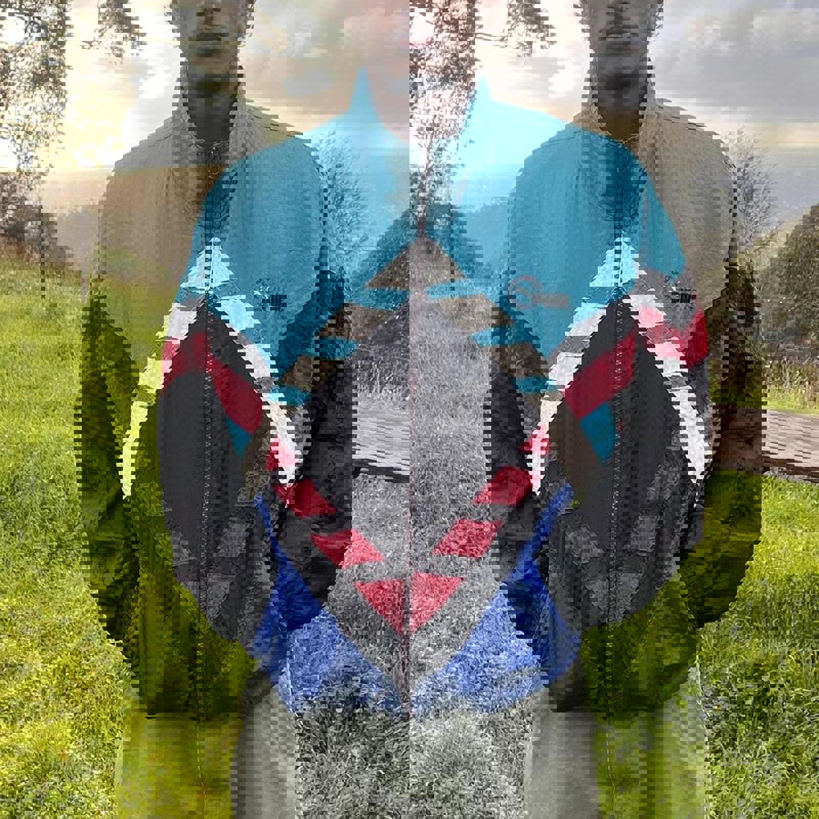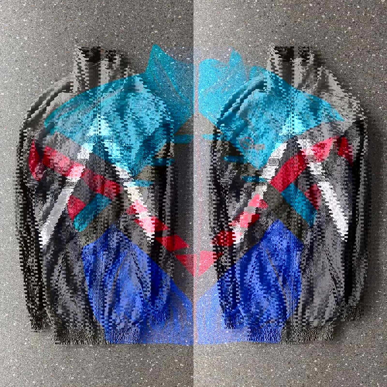 Vintage colourful block print jacket with an embroidered logo on the chest and purple zip