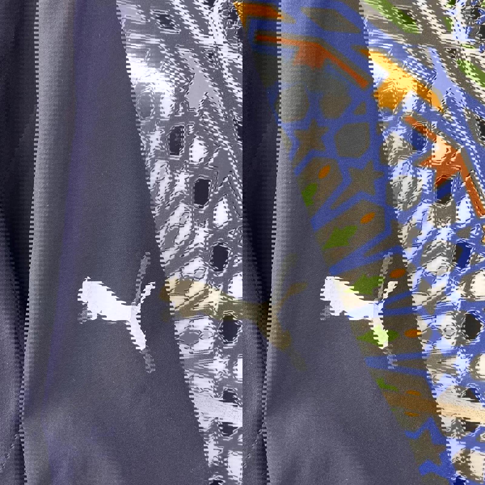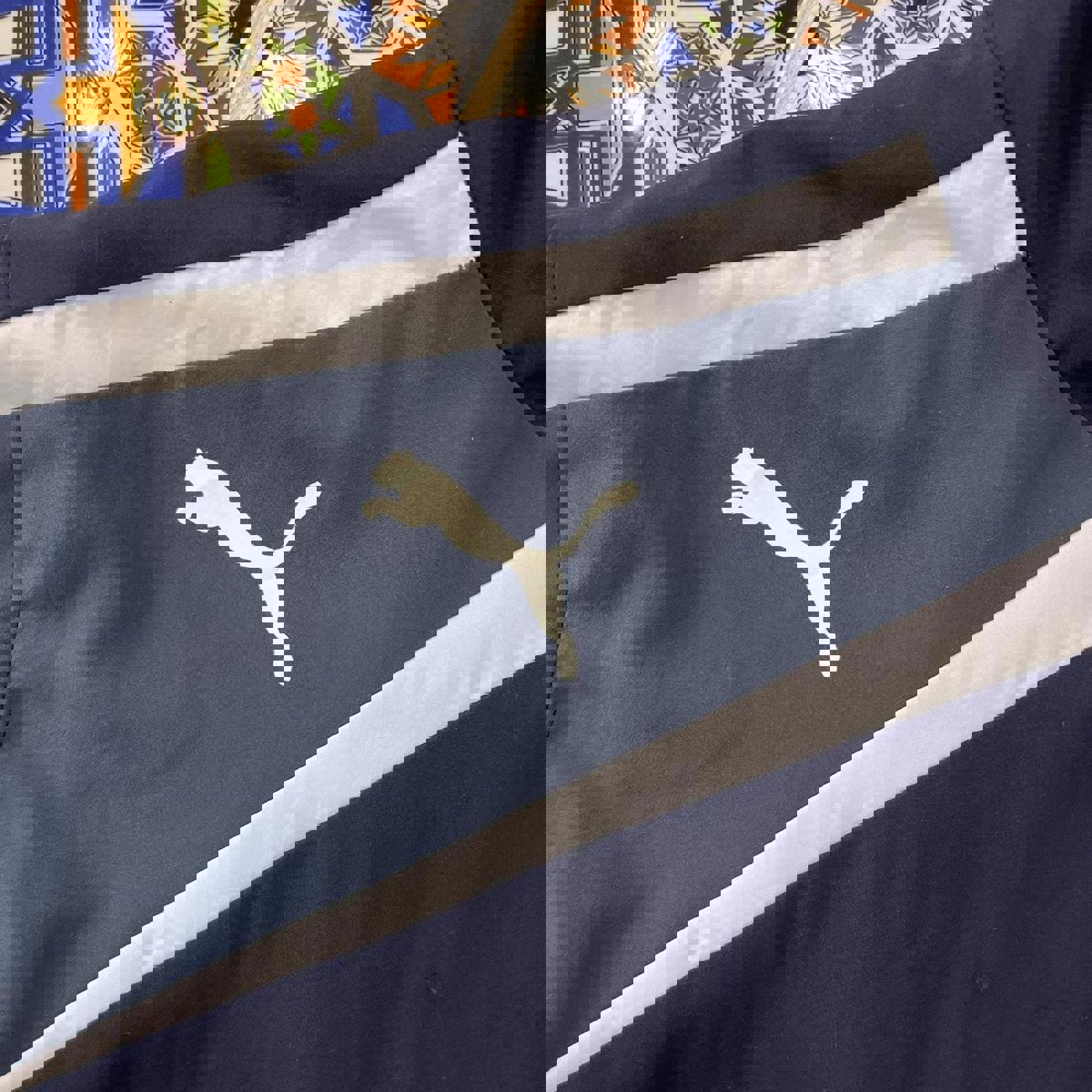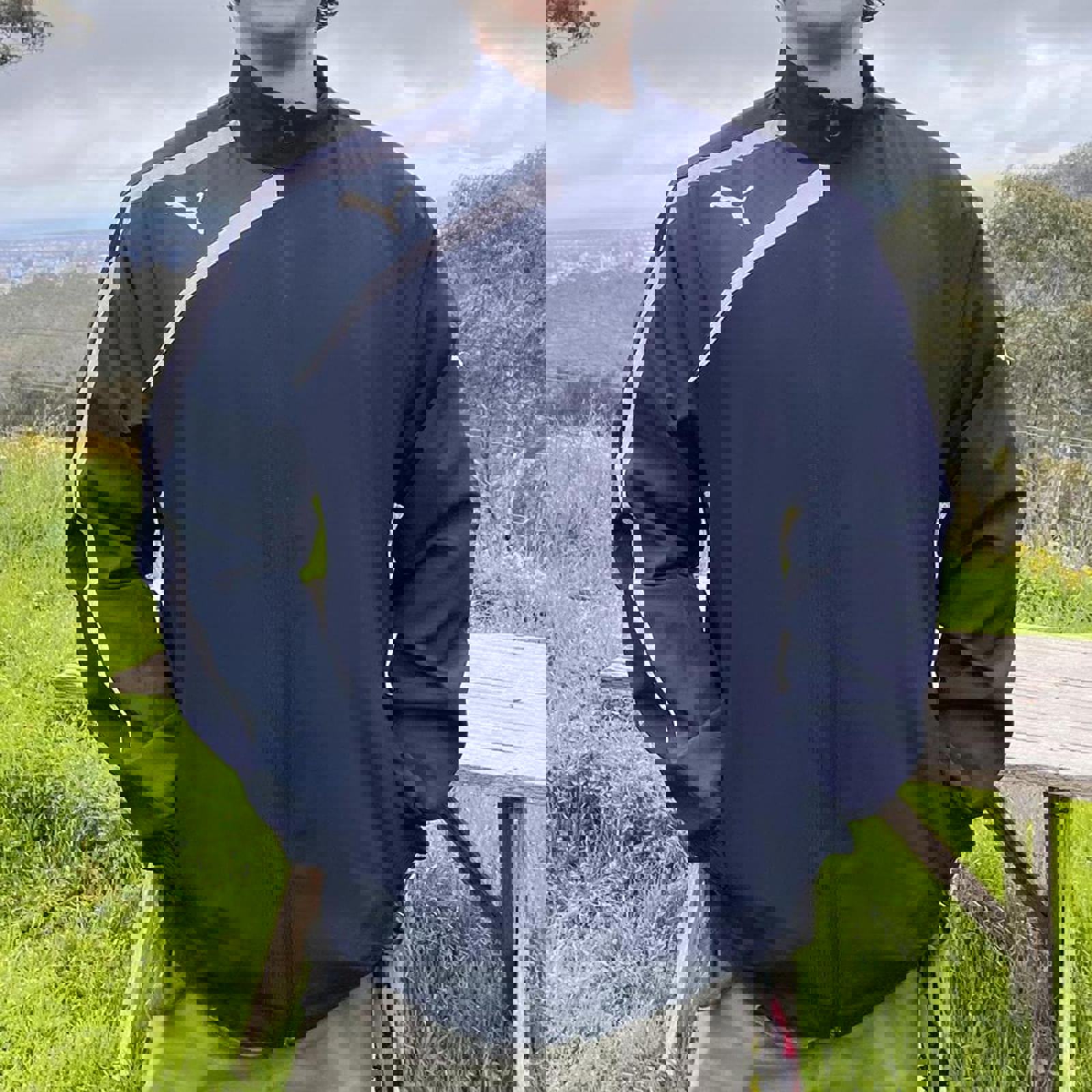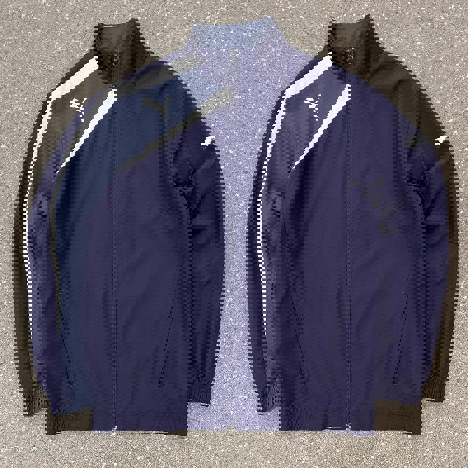 navy, grey and white puma jacket with screen printed puma logos on the front shoulder and sleeve
