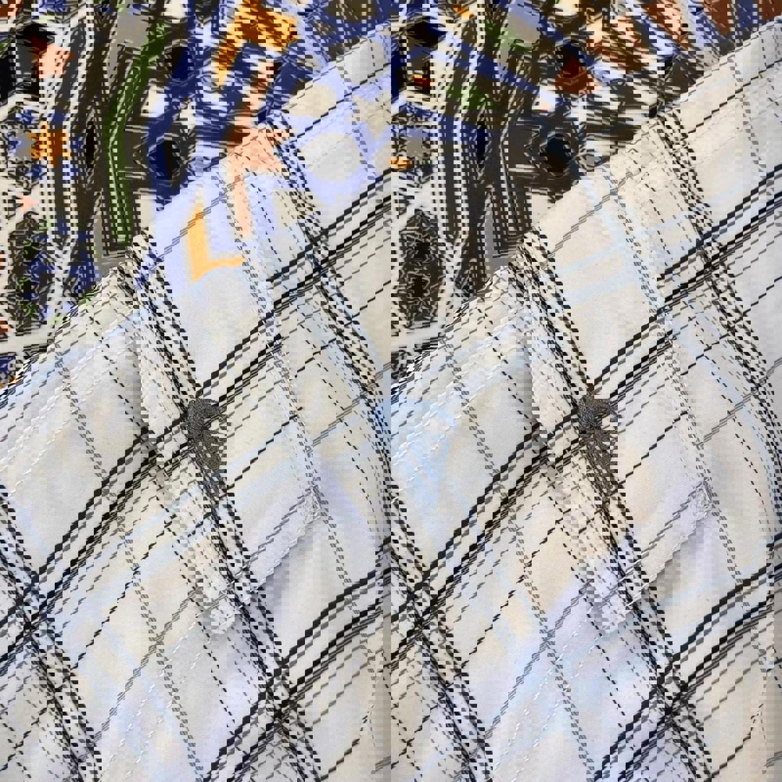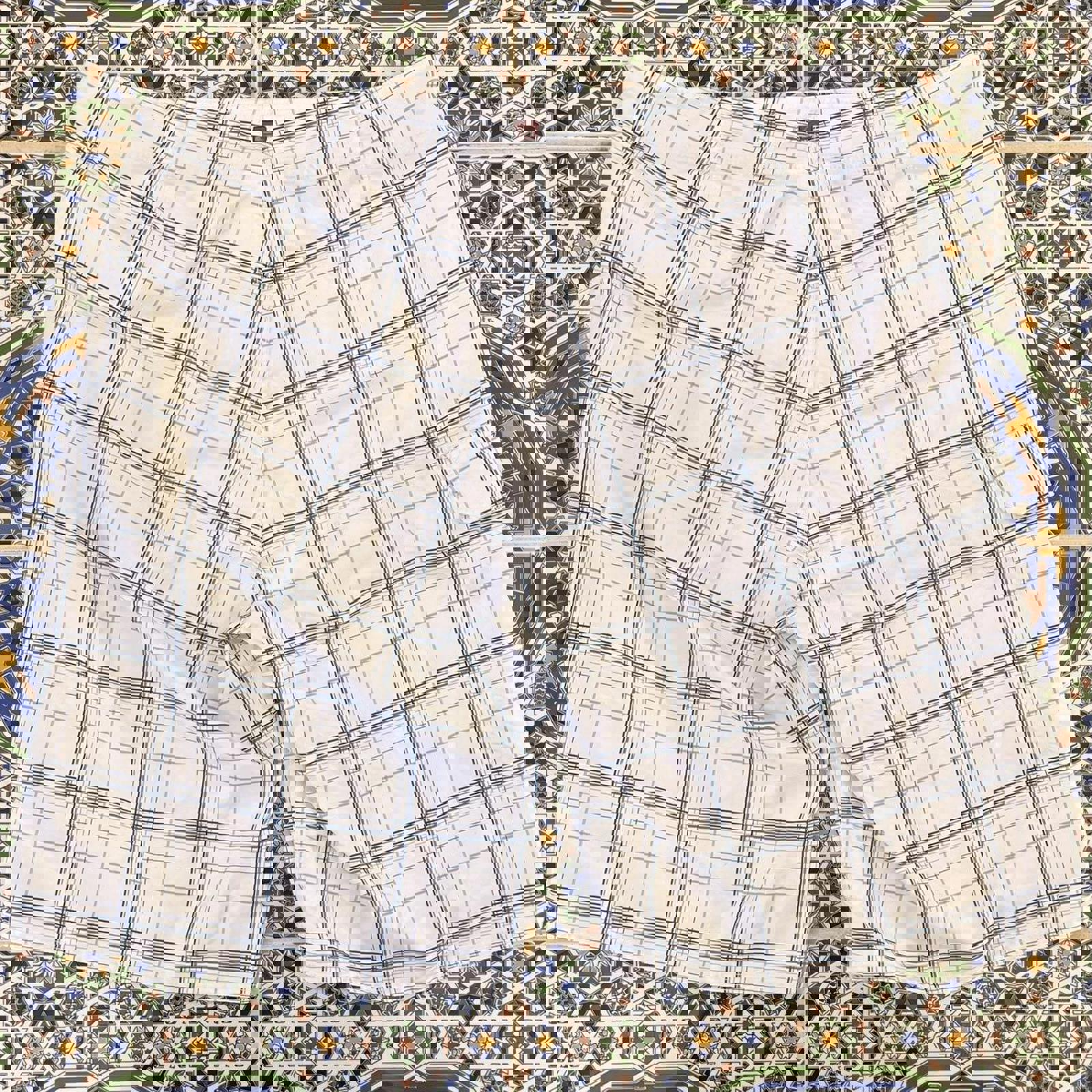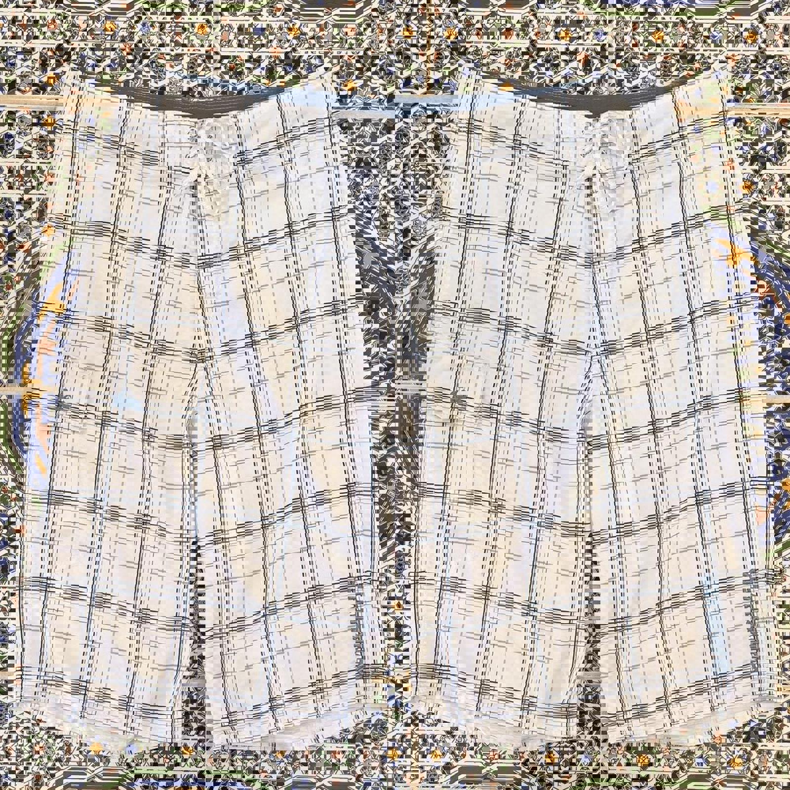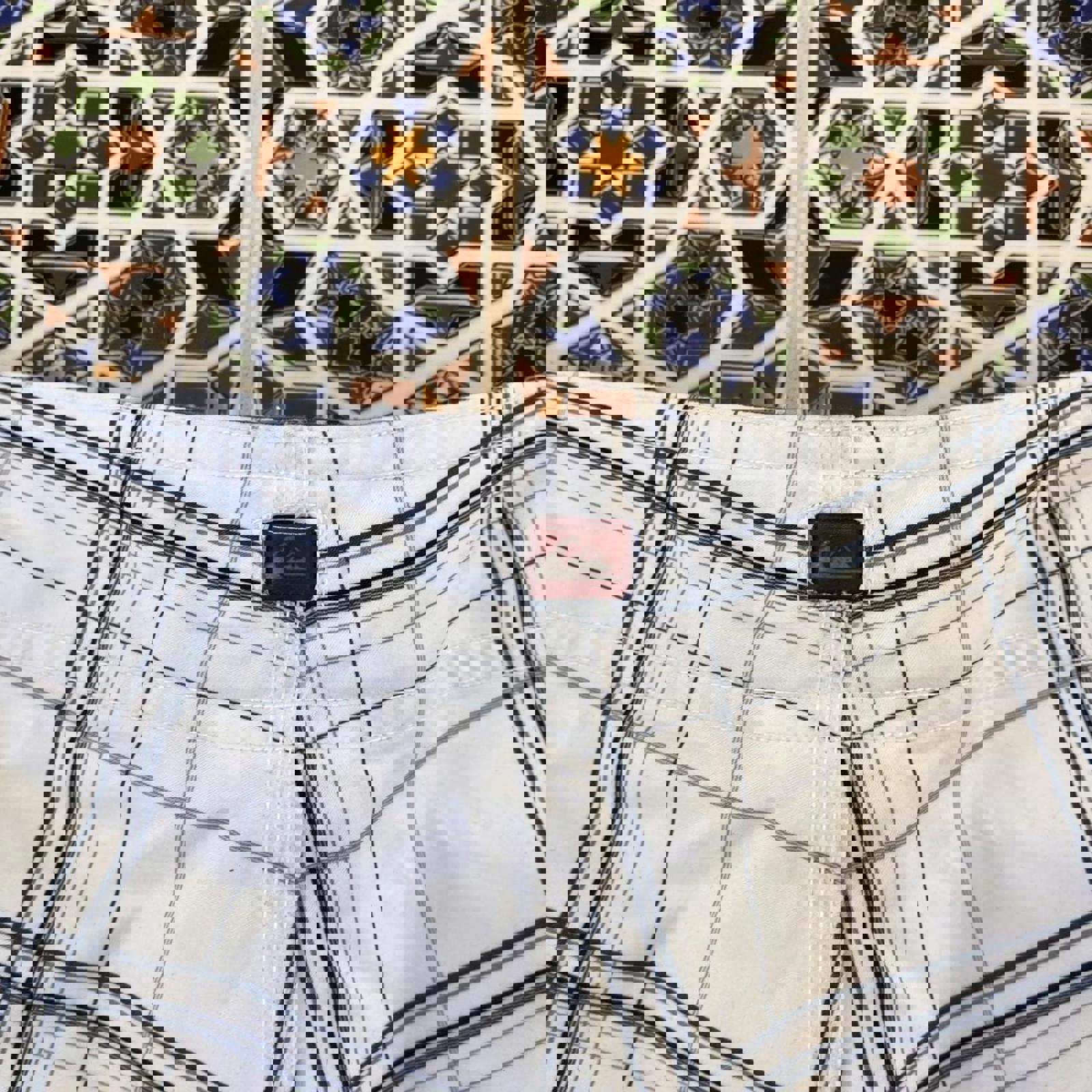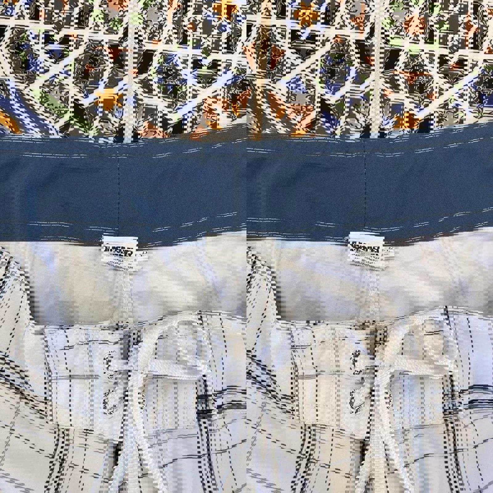 white and blue checkered quiksilver swimmers with a blue quiksilver spellout embroidered down the leg and a blue embroidered quiksilver logo on the pocket