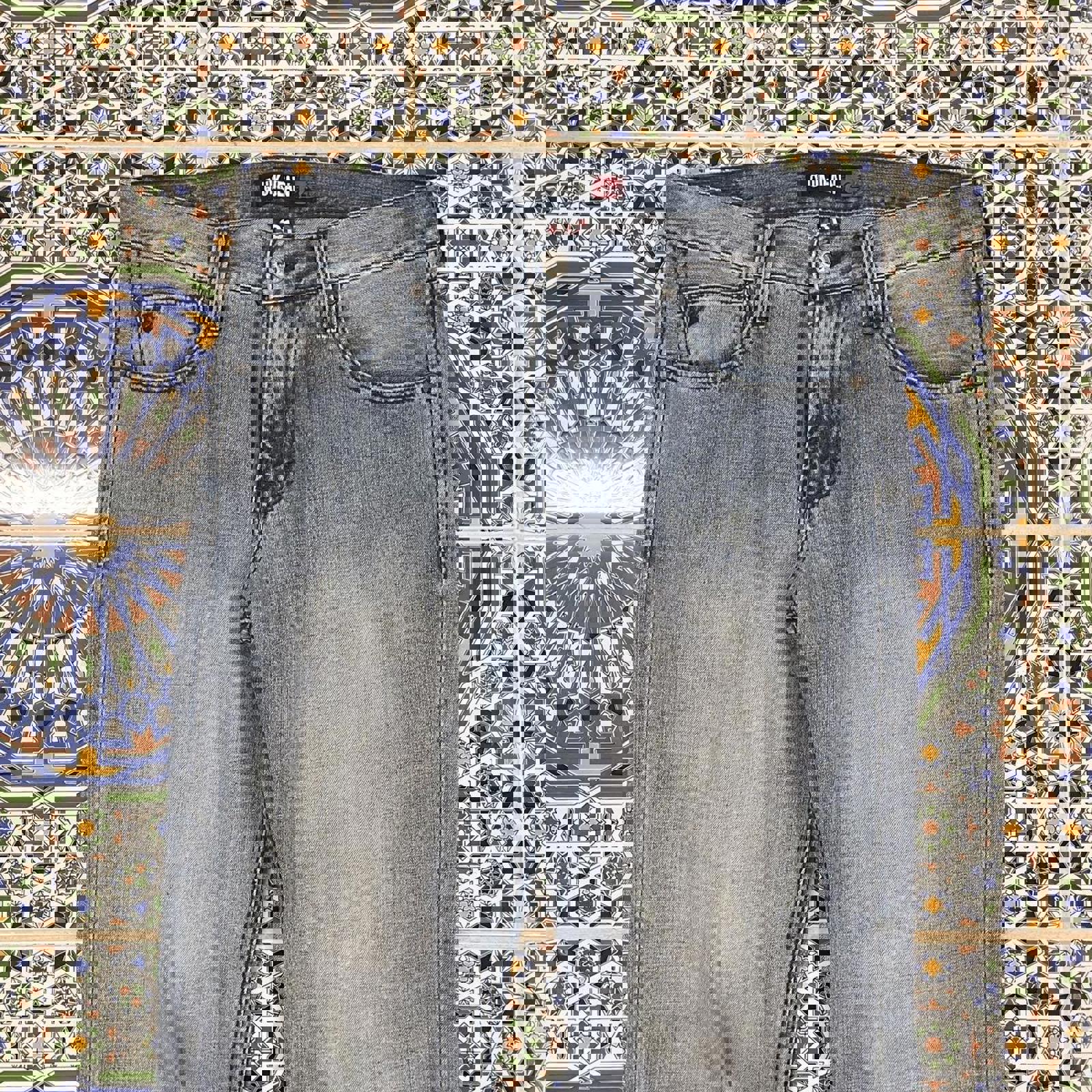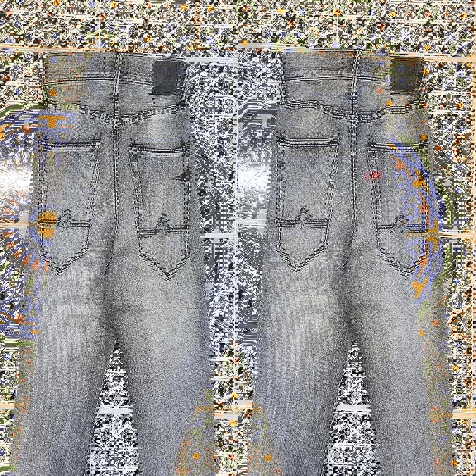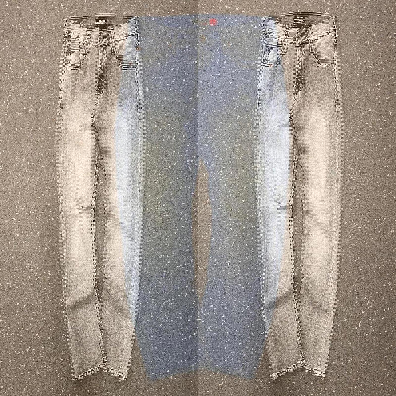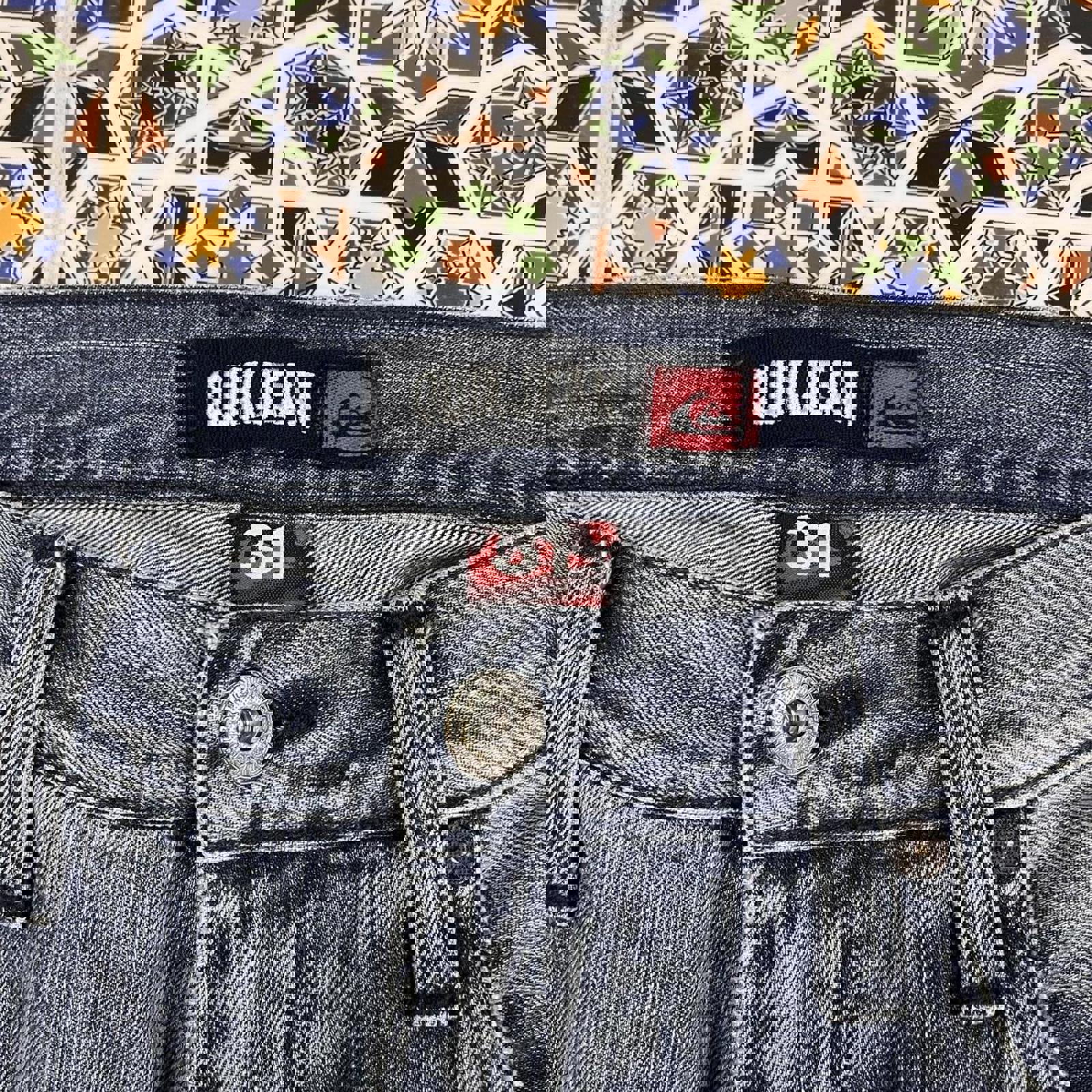 Light blue quiksilver straight leg jeans with a black patch on the hip and red quiksilver tab on the back pocket
