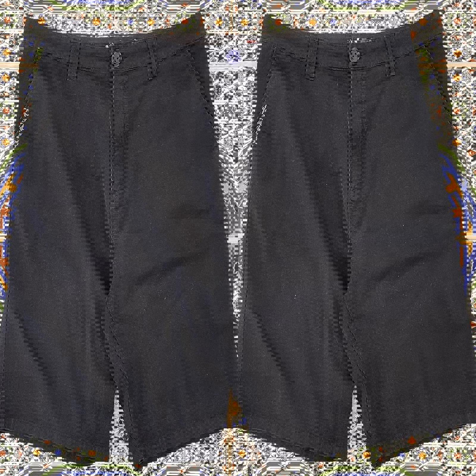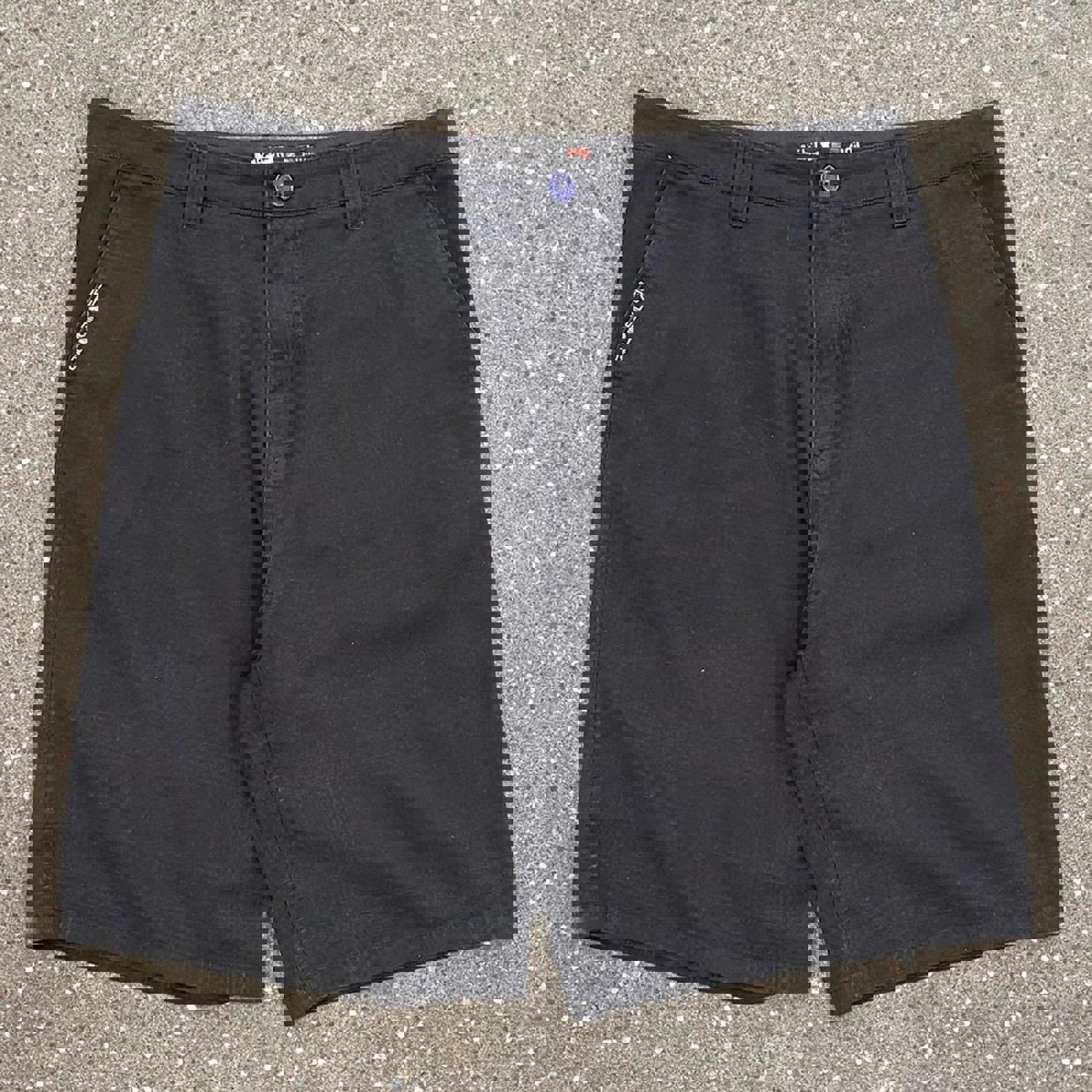 black quiksilver shorts with a silver embroidered spell out on the side pocket and an embroidered silver quiksilver logo