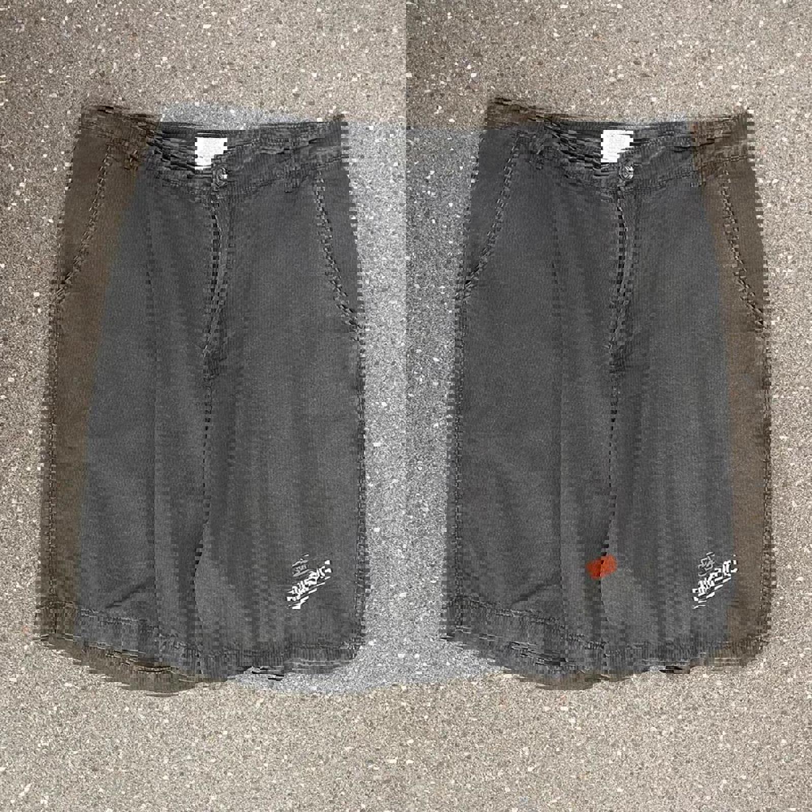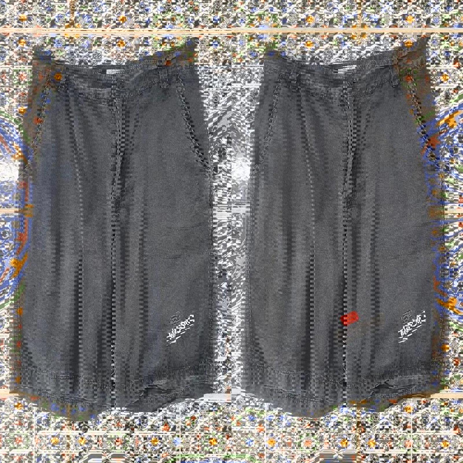 Black quiksilver shorts with a white and red embroidered quiksilver graphic on the front and back pocket