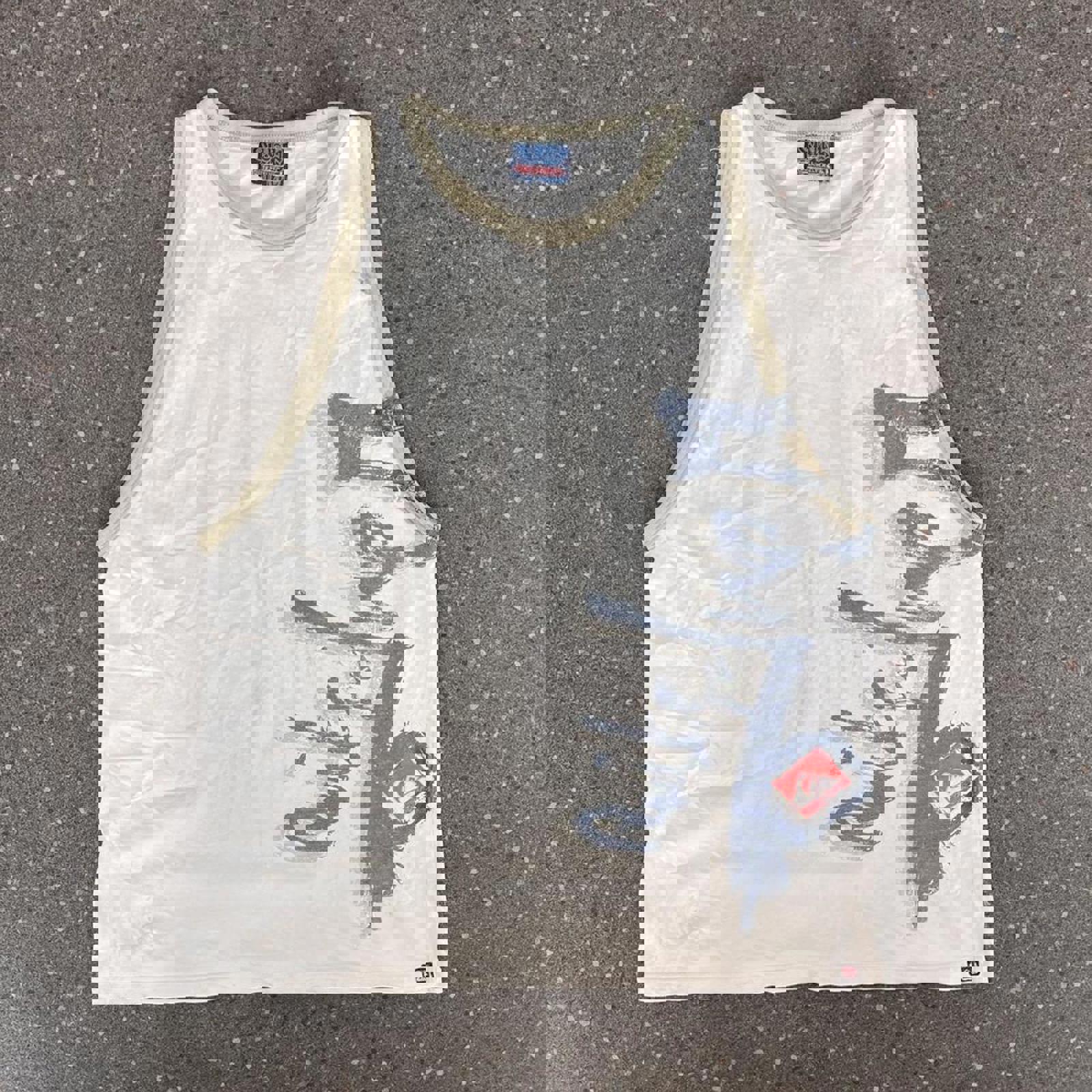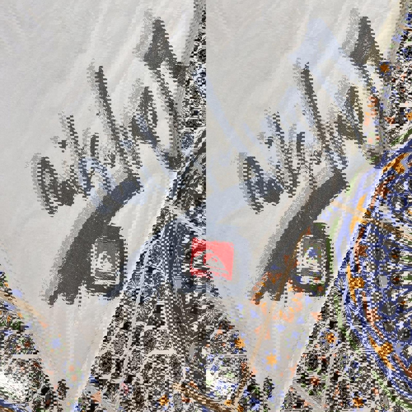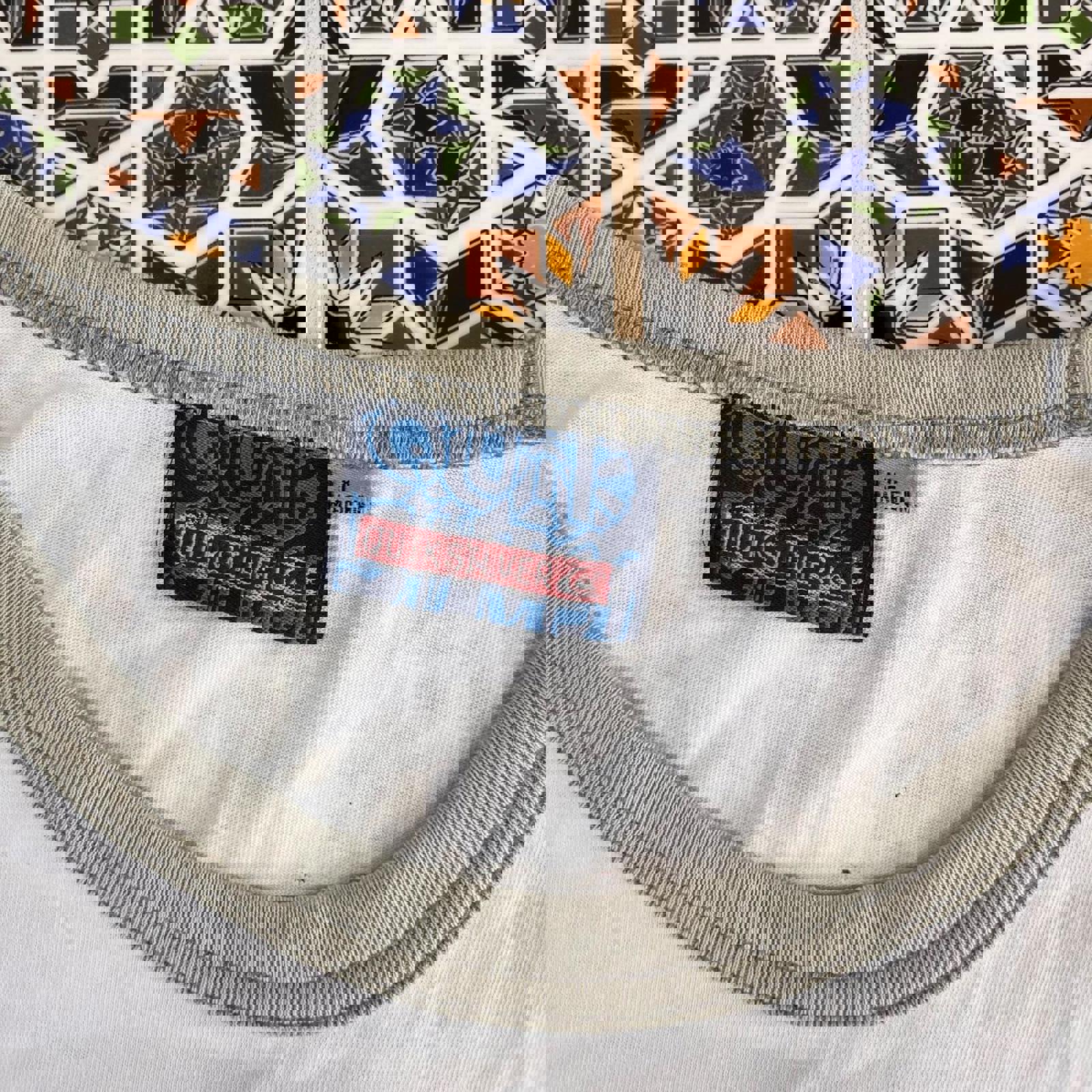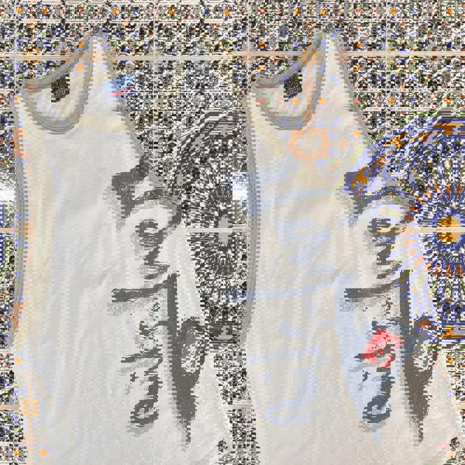 White and tan Quiksilver singlet with a large navy, tan and red Quiksilver graphic running down the side