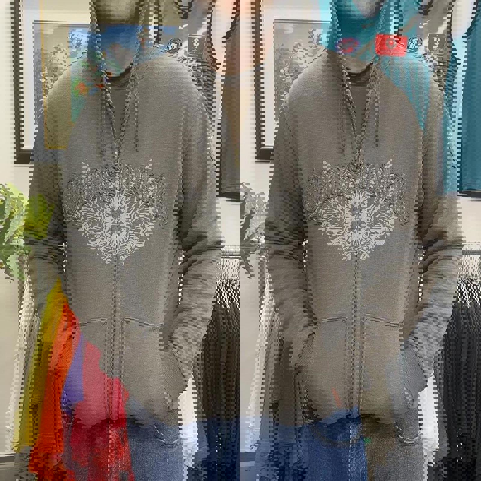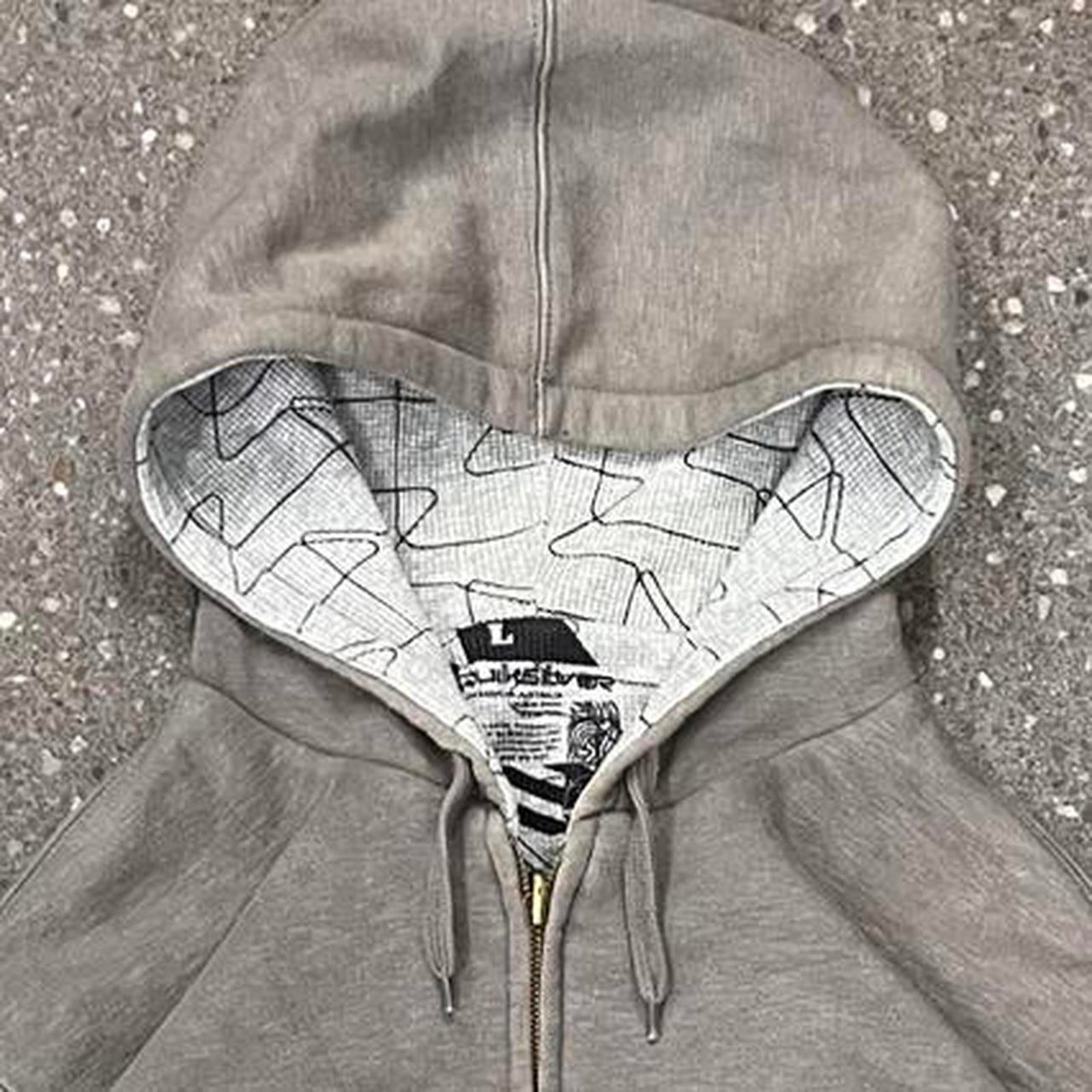 olive green Quiksilver surf zip up hoodie with a grey patterned interior, grey printed and green patch graphic on the front and patch on the sleeve