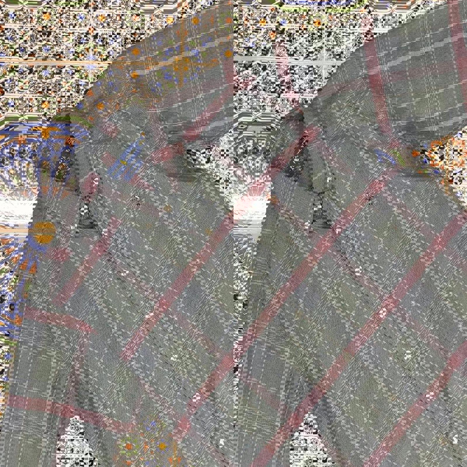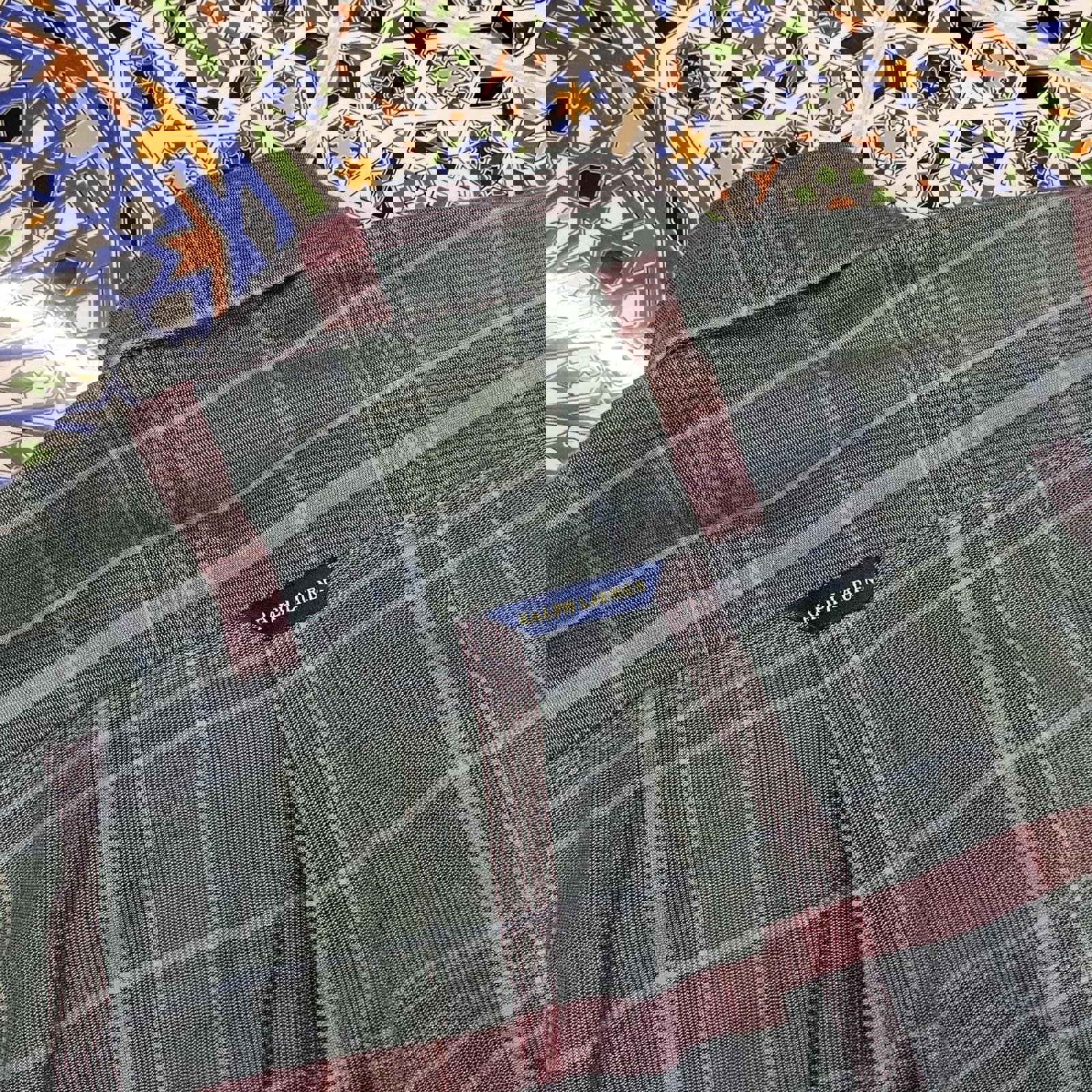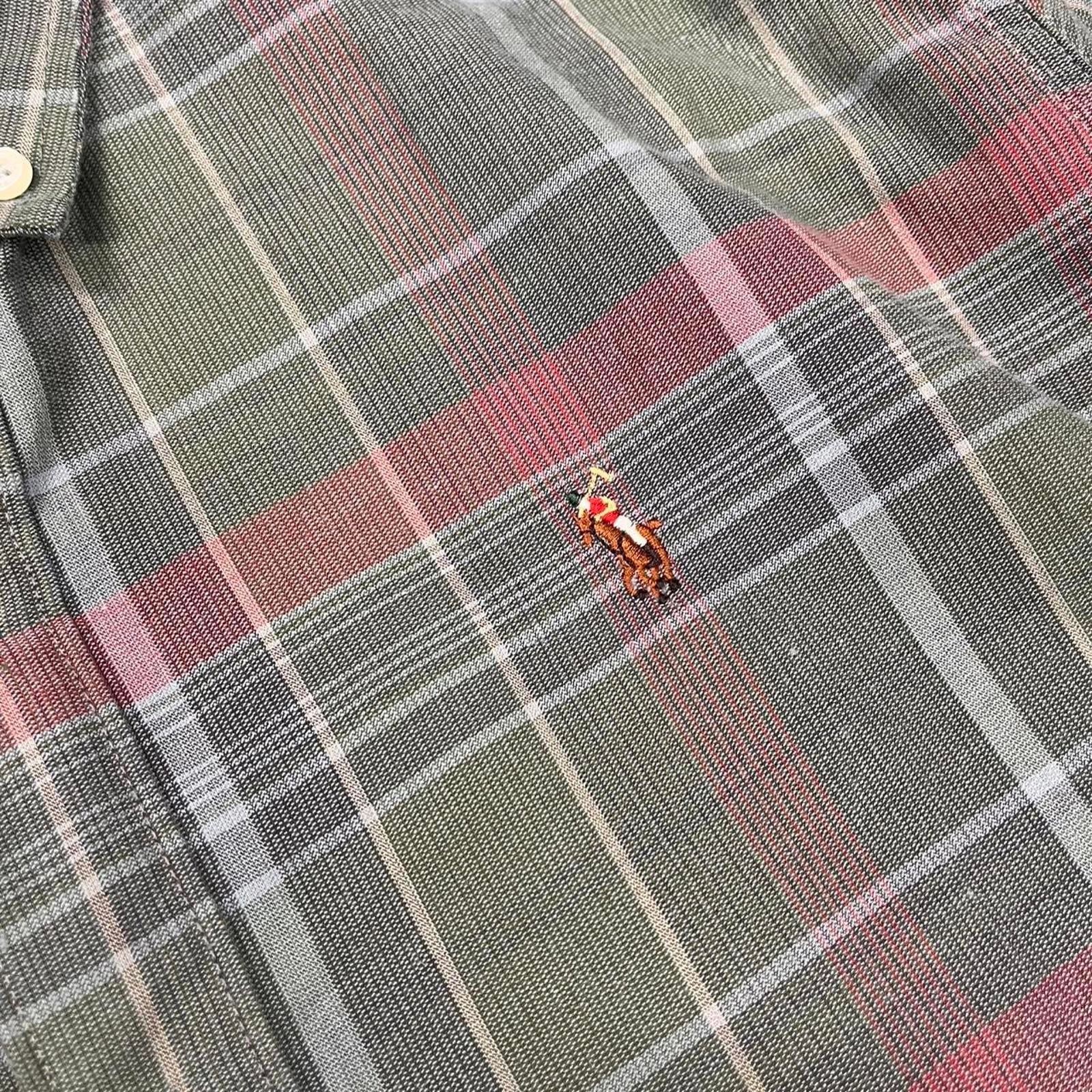 greens, blues and red checkered ralph lauren long sleeved button up shirt with a coloured in embroidered horse on the chest
