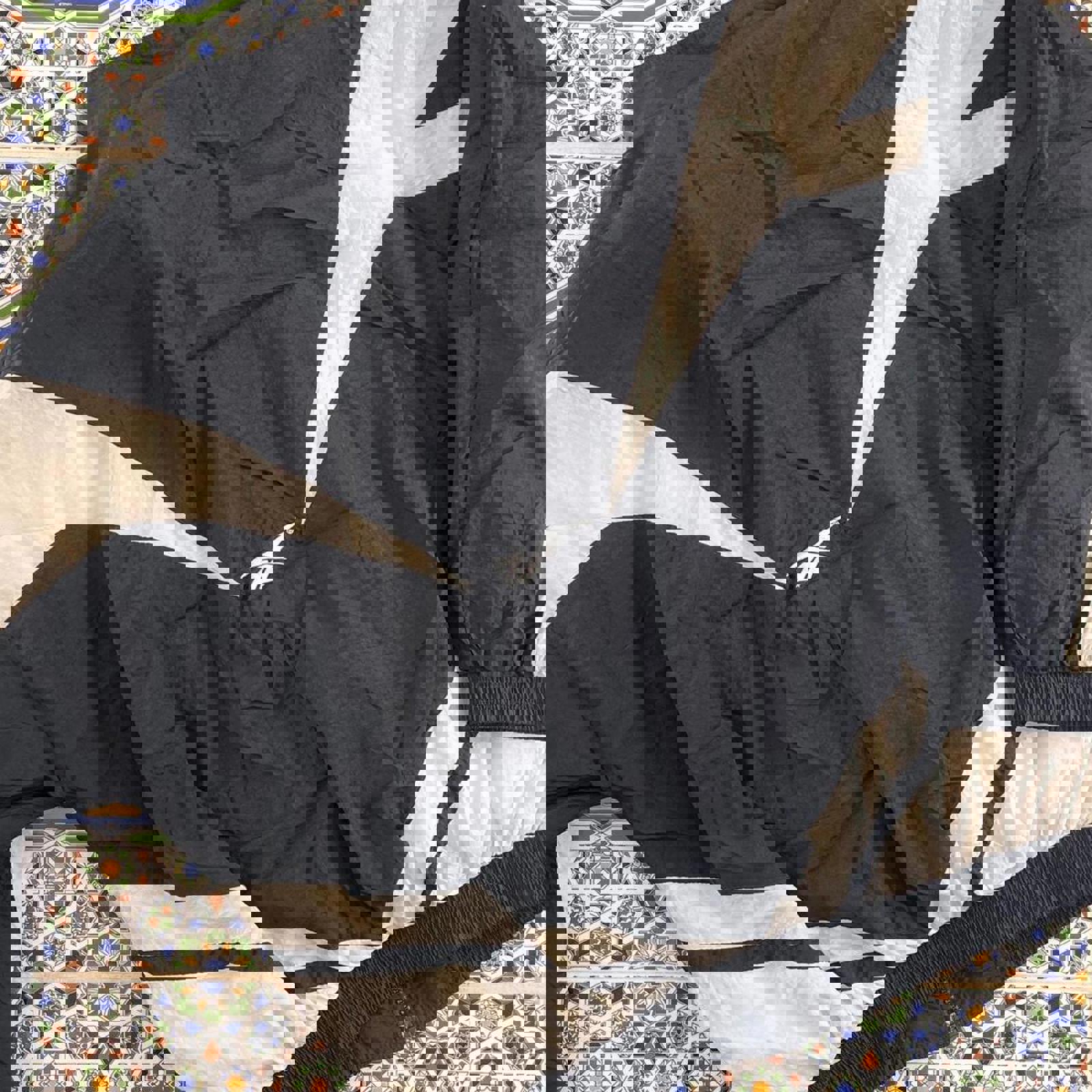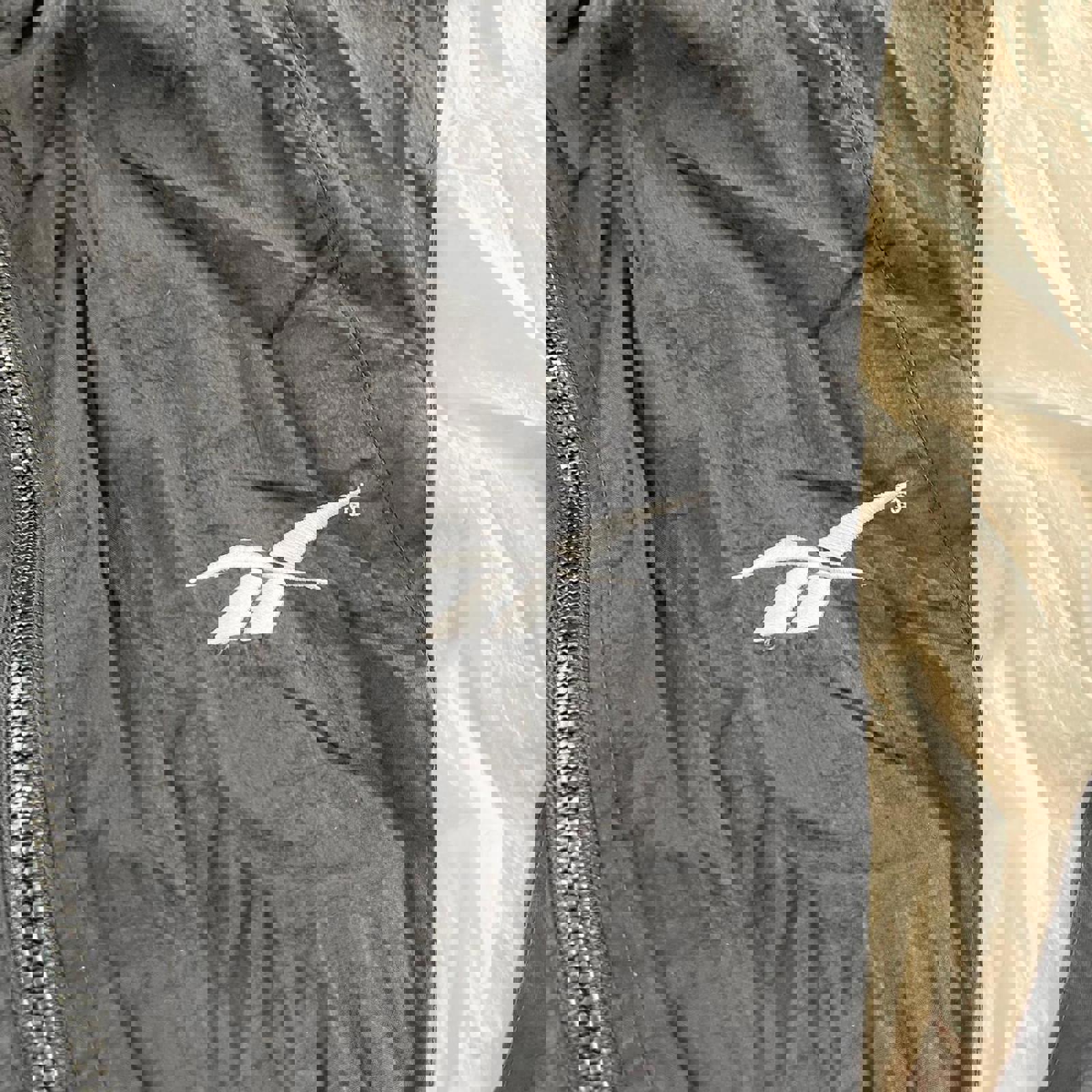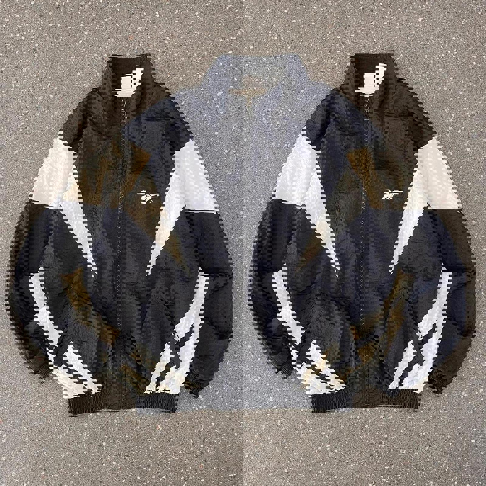 Black and white Reebok windbreaker with a white embroidered logo on the chest and centre of the back. Also has a detailed zip attachment
